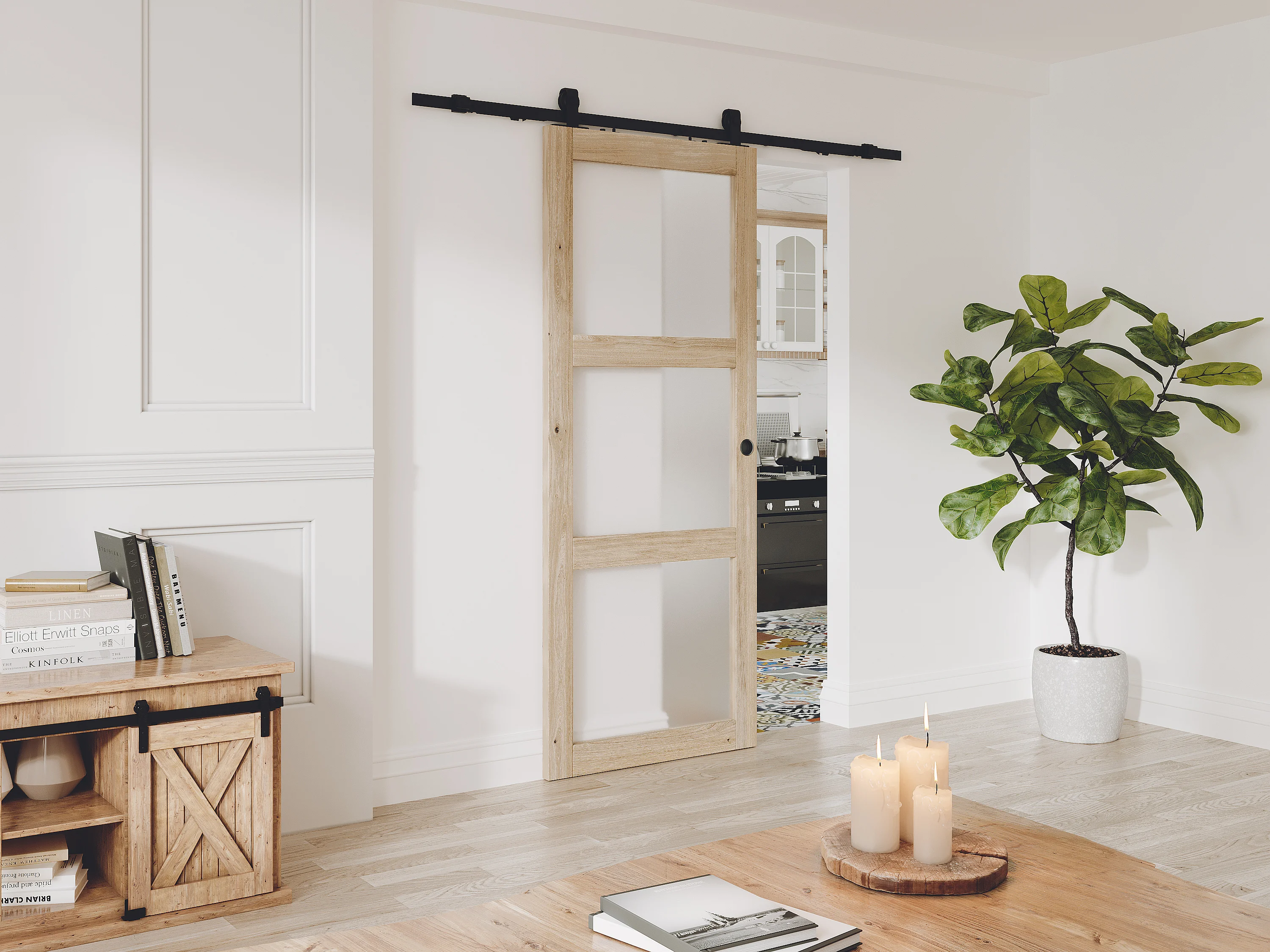Schiebetür mit Laufschienensystem mit 3 Fenstern - 205 x 93 cm - Holz - Sicherheitsglas mattiert - ACOSTA II