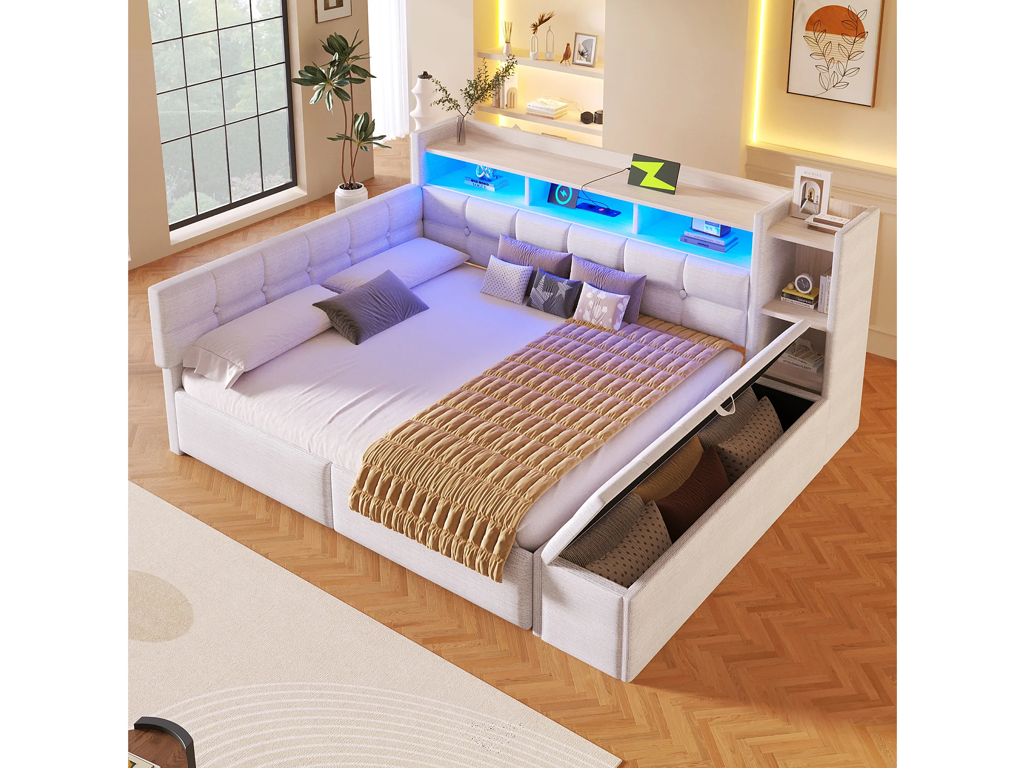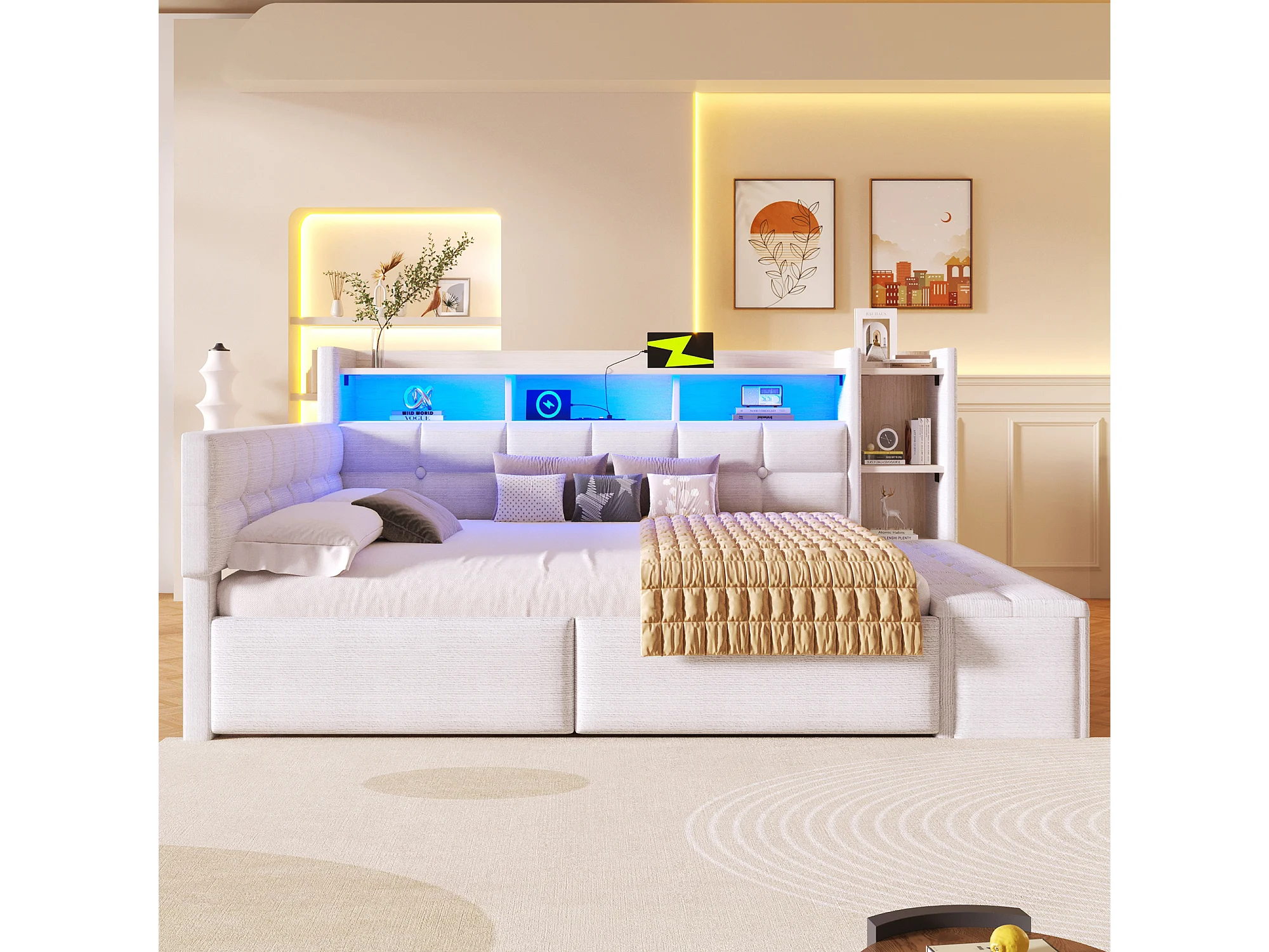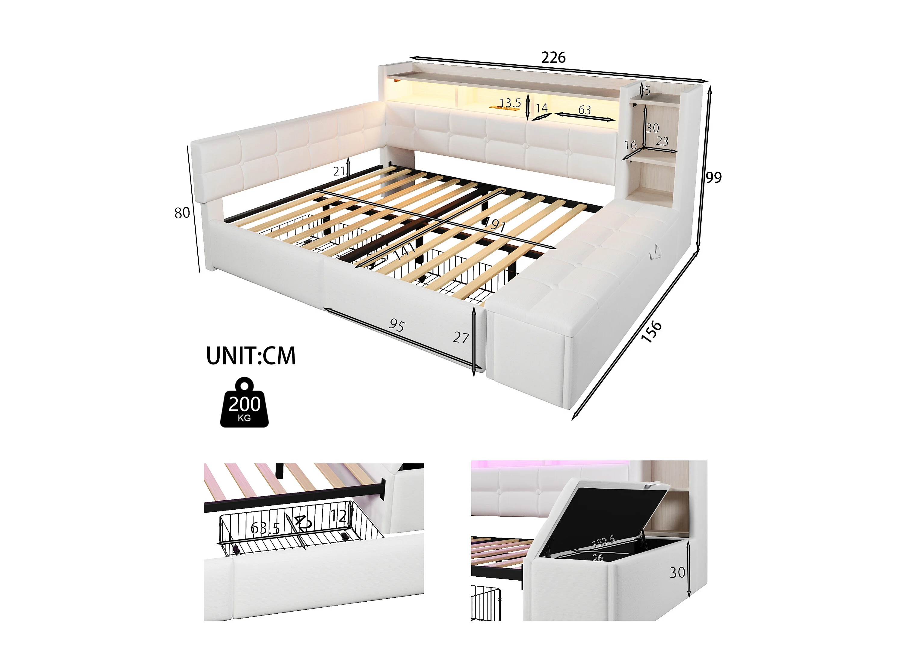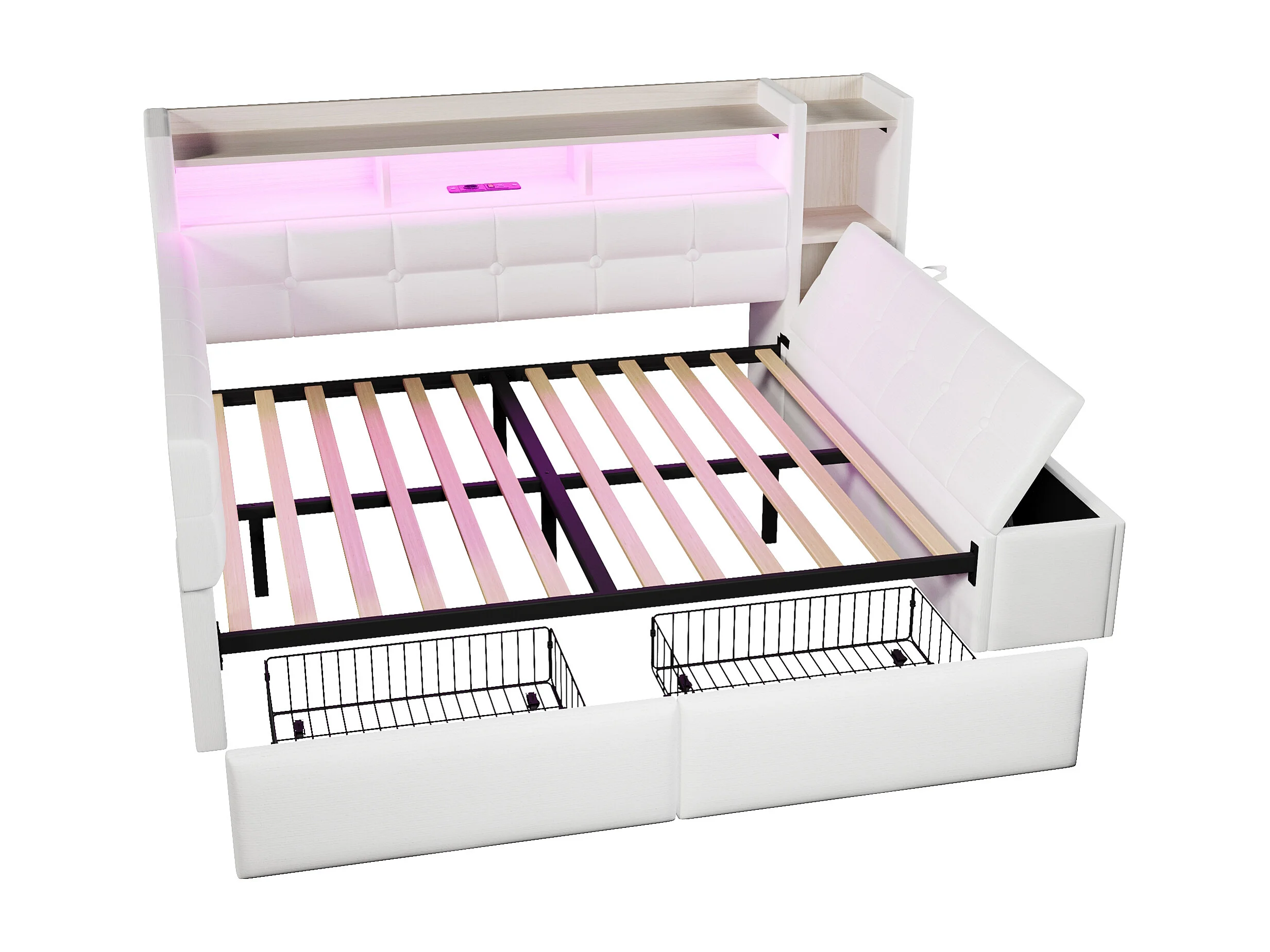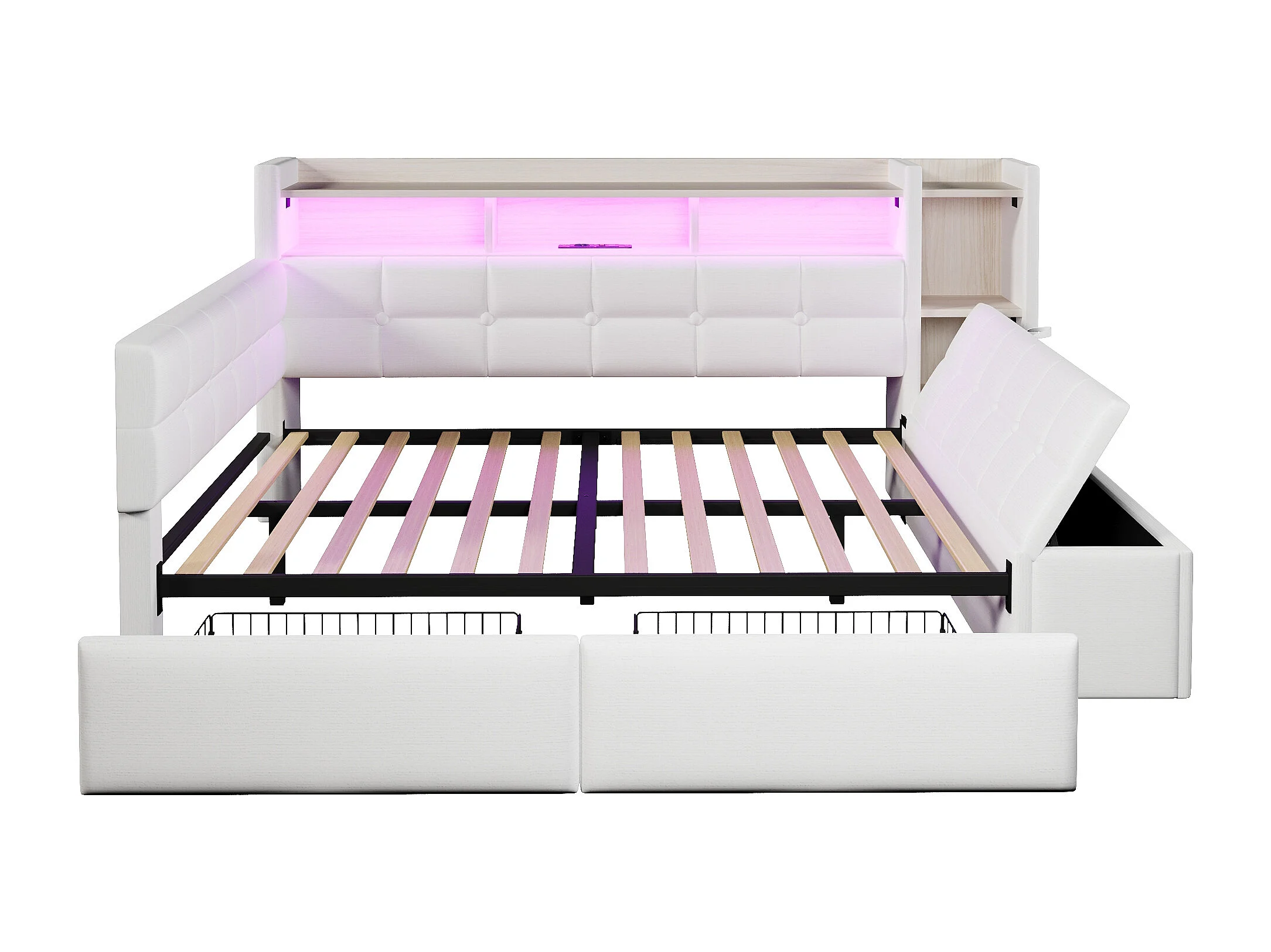 Schlafsofa 140x190 cm - mit 2 Schubladen - USB + Type-C-Schnittstelle - mit Staufächern - mit LED-Licht - weiß​ (Matratze nicht inbegriffen)