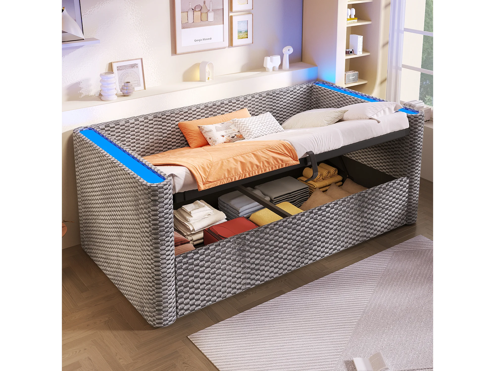 Schlafsofa mit Stauraum 90×200 cm - mit Beleuchtung - mit USB- und Type-C-Anschluss - Samt - Grau (ohne Matratze)