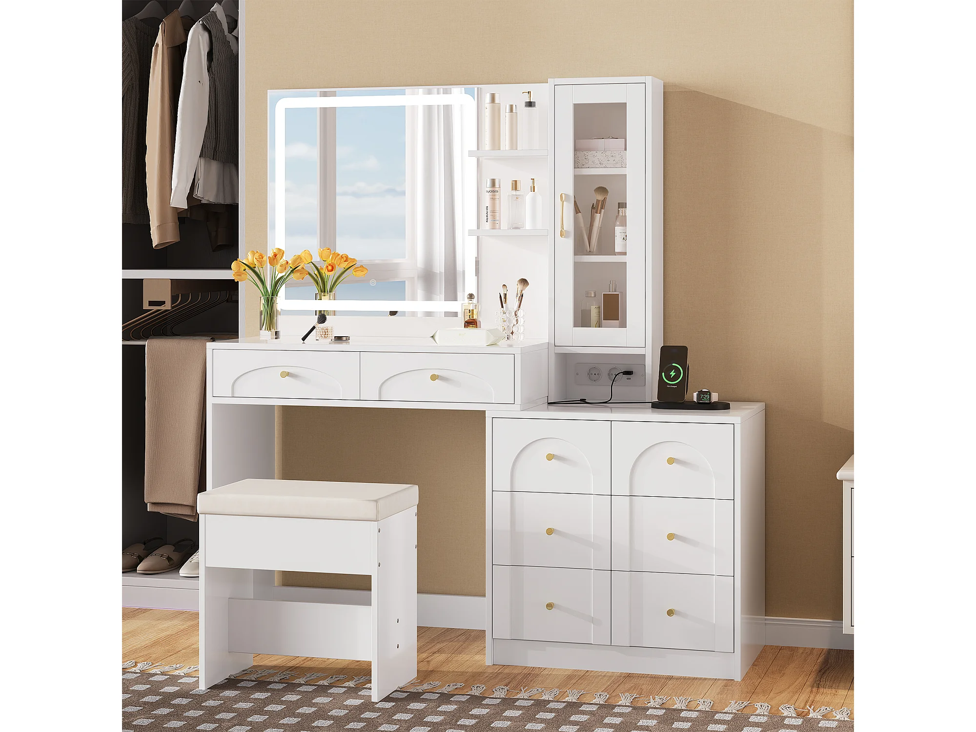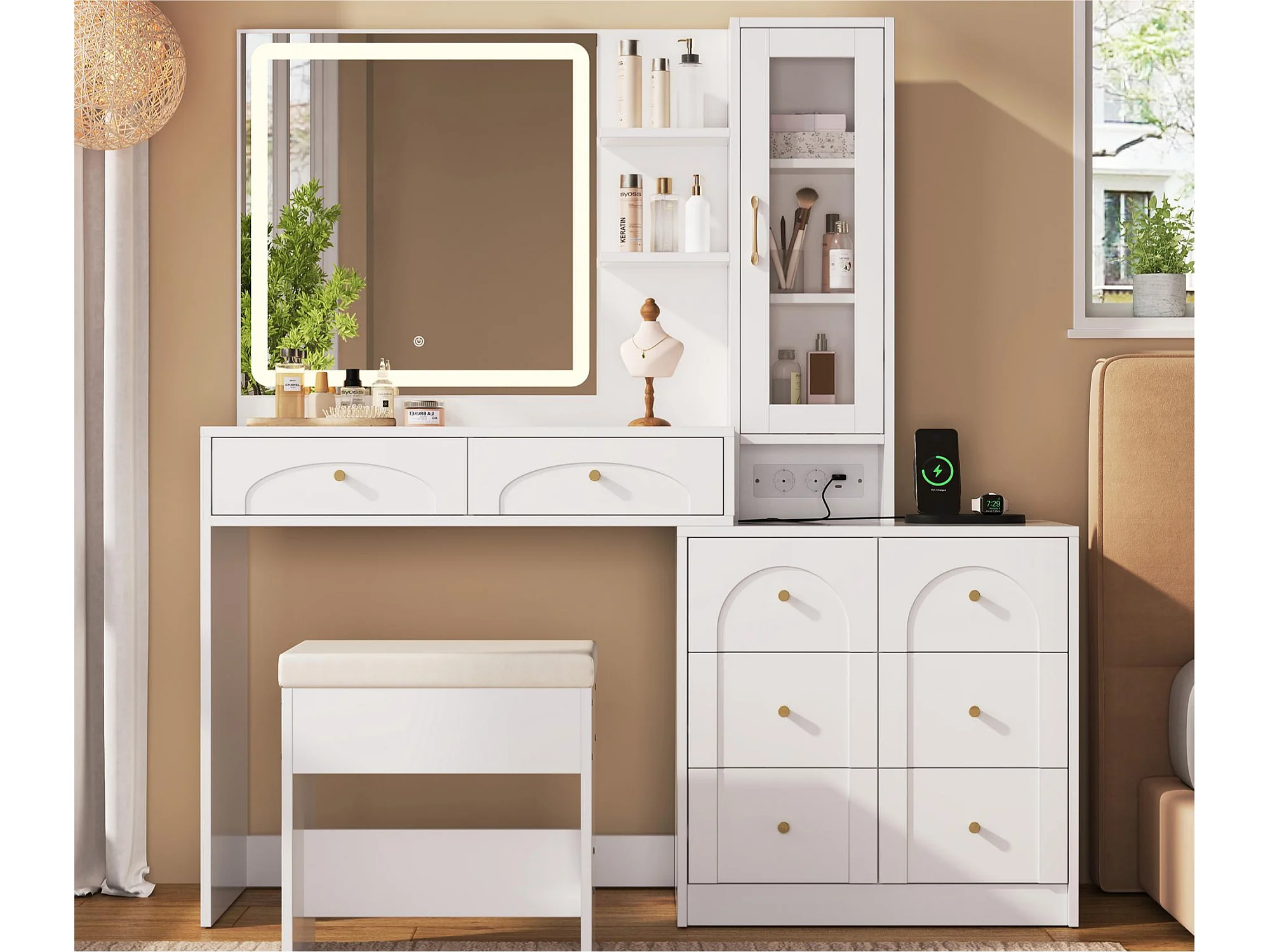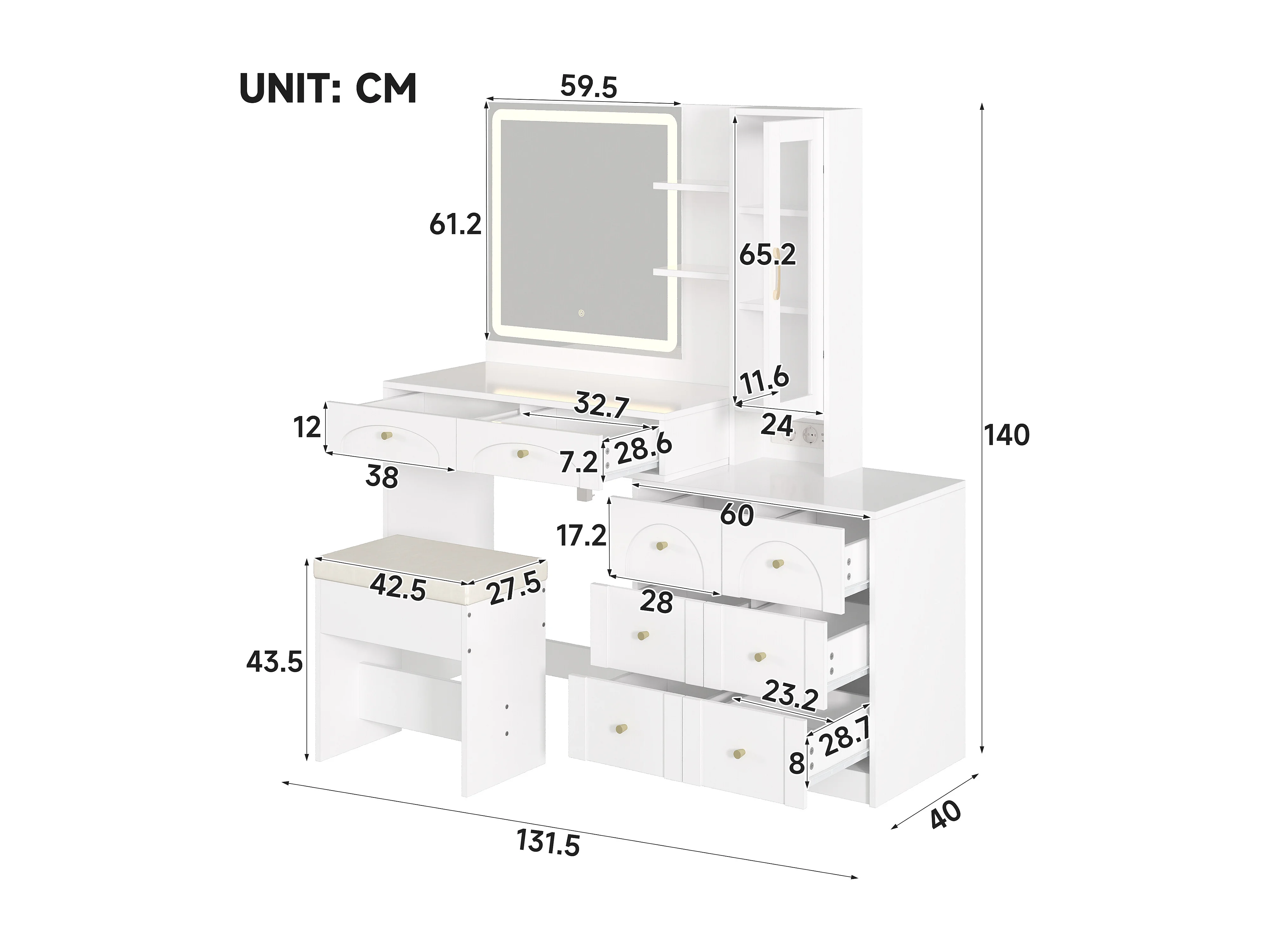 Schminktisch mit Spiegel 131,5x40x140cm - mit verstellbarer LED-Beleuchtung - mit 8 Schubladen und 1 Tür - mit USB-Ladeanschluss - mit 1 Hocker - Weiß