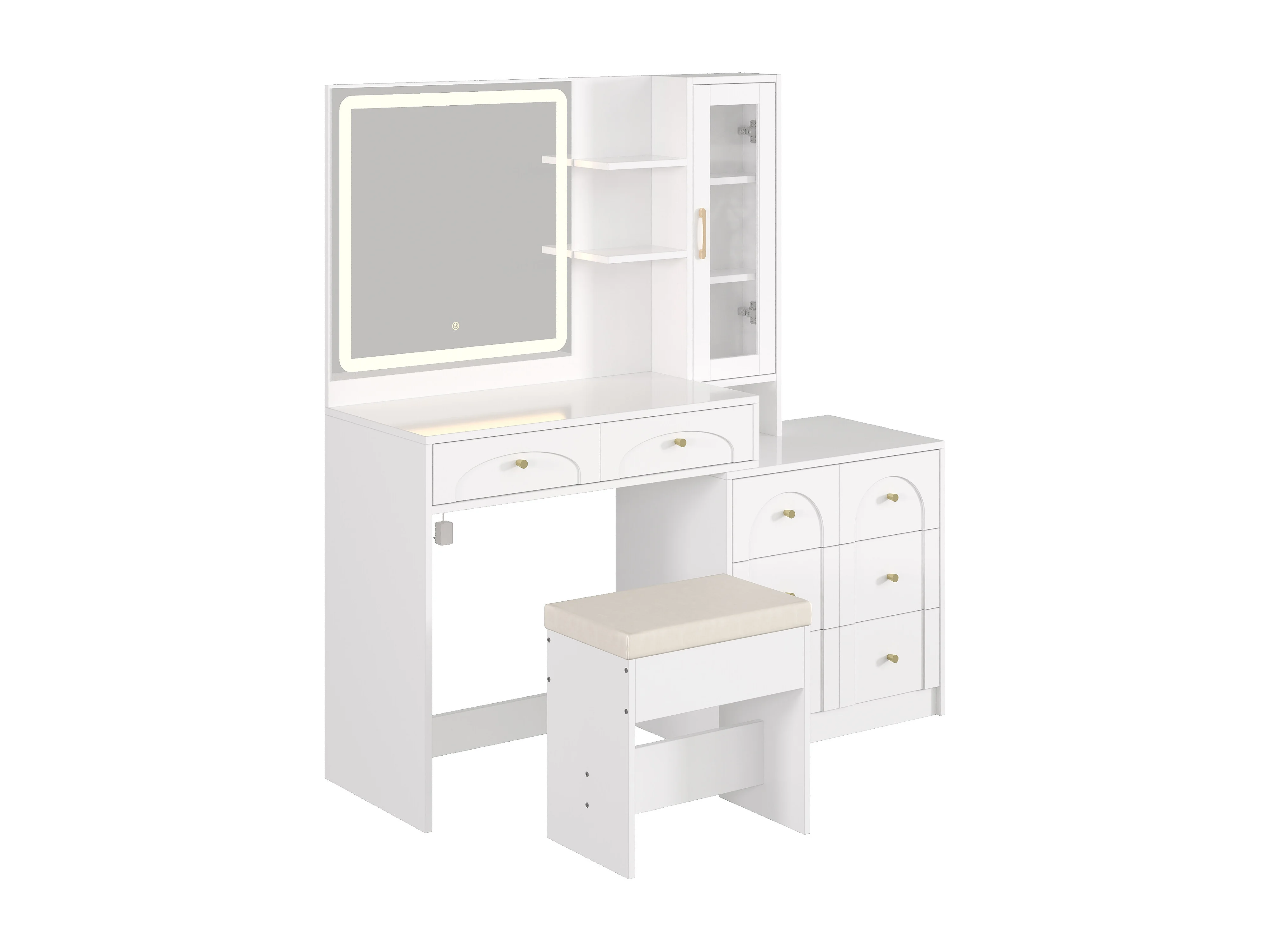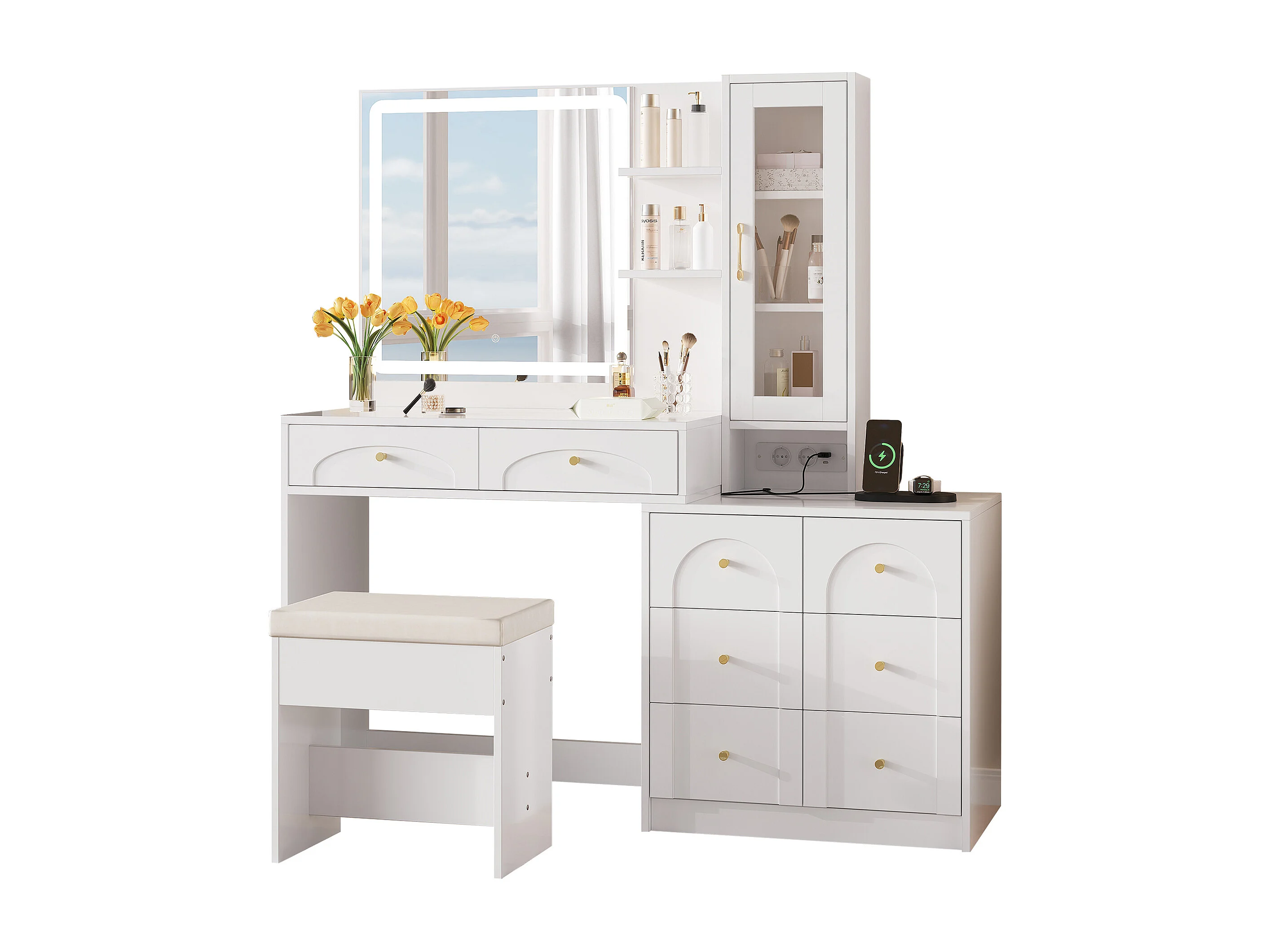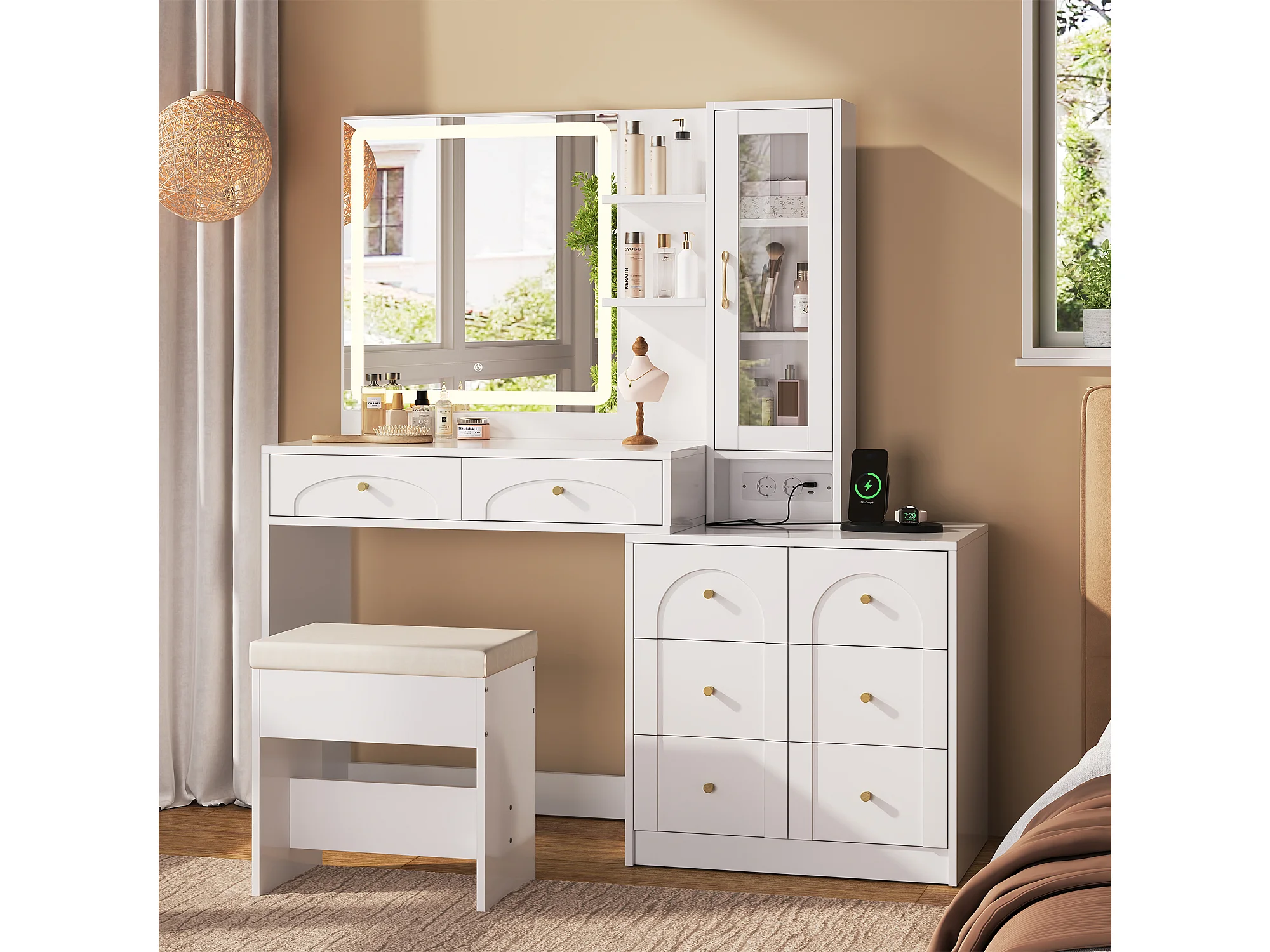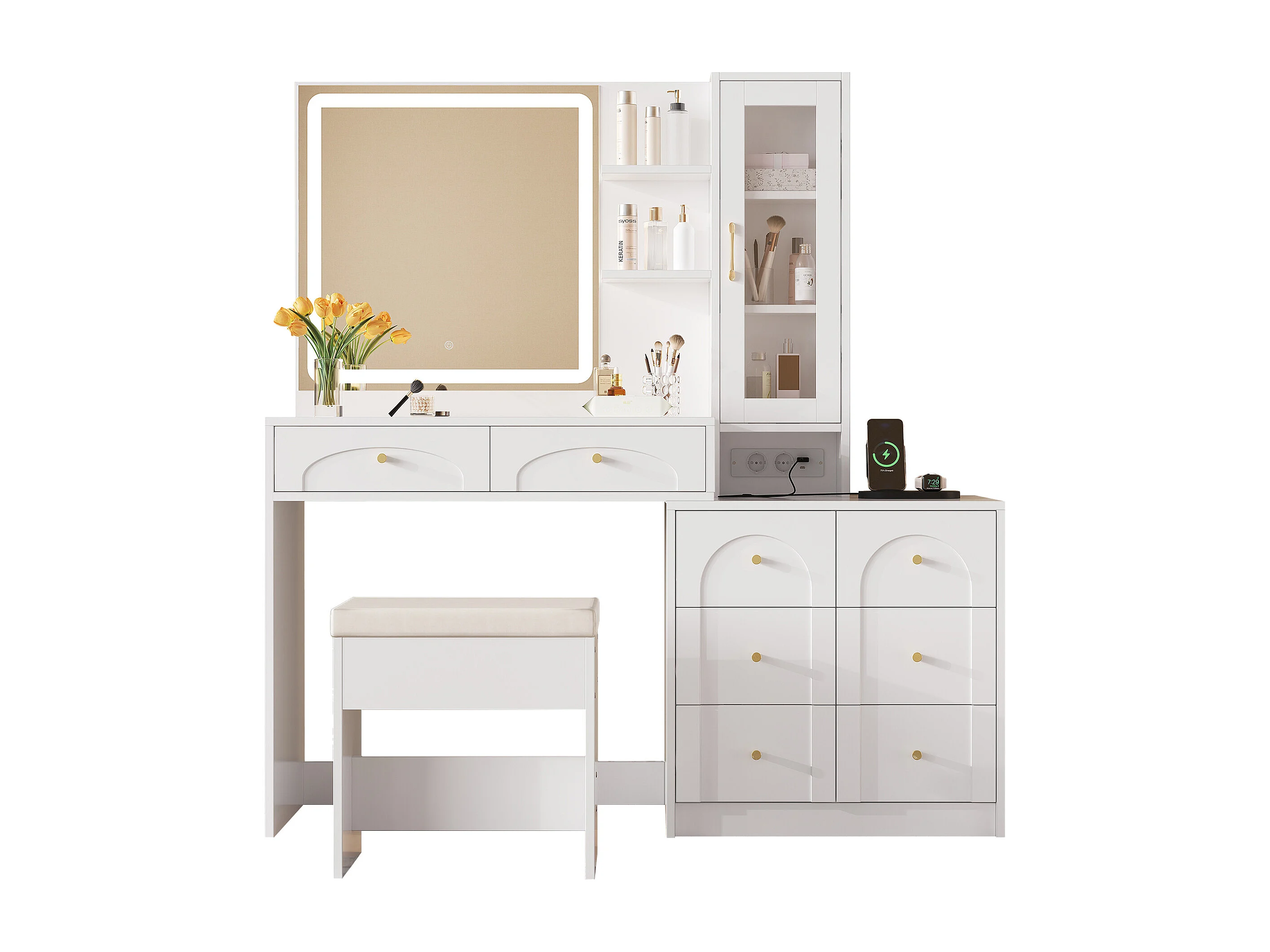 Schminktisch mit Spiegel 131,5x40x140cm - mit verstellbarer LED-Beleuchtung - mit 8 Schubladen und 1 Tür - mit USB-Ladeanschluss - mit 1 Hocker - Weiß