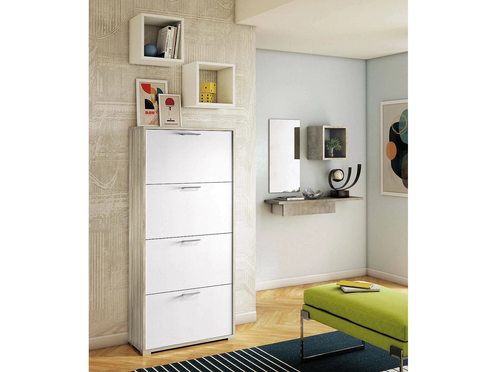 Schuhregal Dmarcat, Mehrzweck - Eingangsmöbel mit 4 Klapptüren, Schuhschrank mit doppelter Tiefe, 100% Made in Italy, 67x28h147 cm, Weiß und Ulme