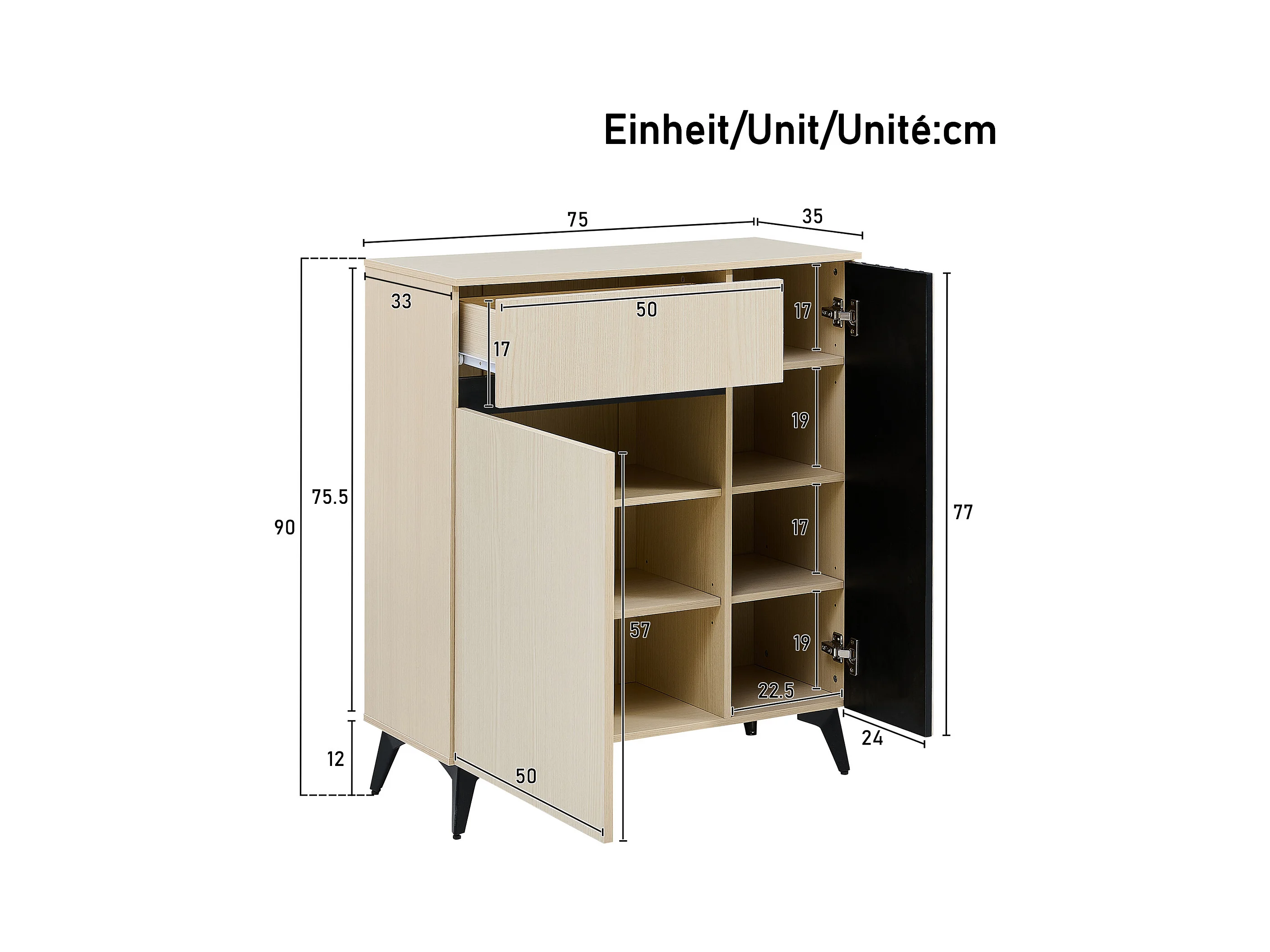 Schuhschrank 75x35x90cm - Mit 2 Türen und 1 Schublade - Mit höhenverstellbaren Einlegeböden - MDF - Natur