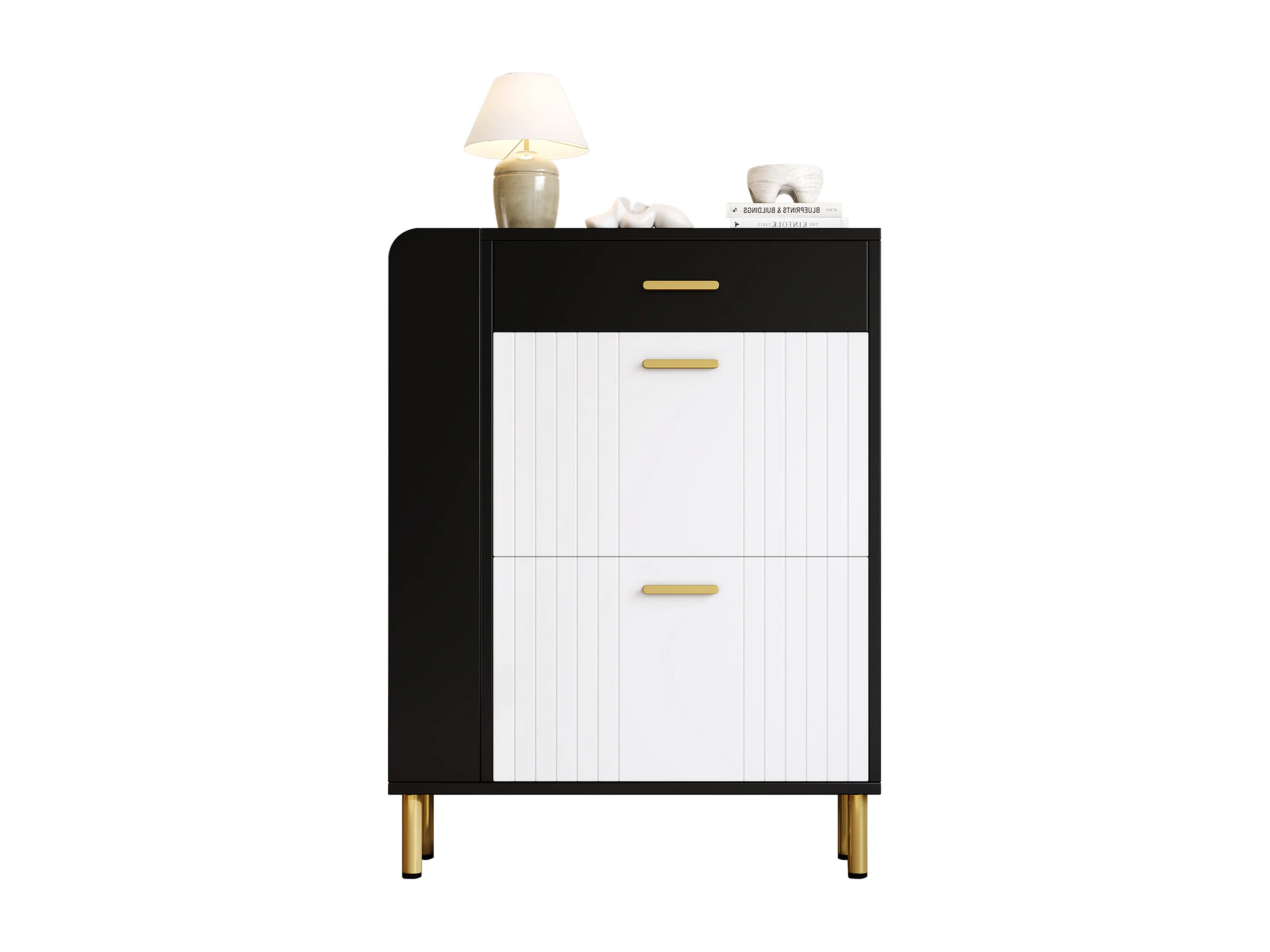 Schuhschrank 80x24x105cm - mit 2 Türen und 1 Schublade - Seitenregal - Metallgriff - Schwarz + Weiß