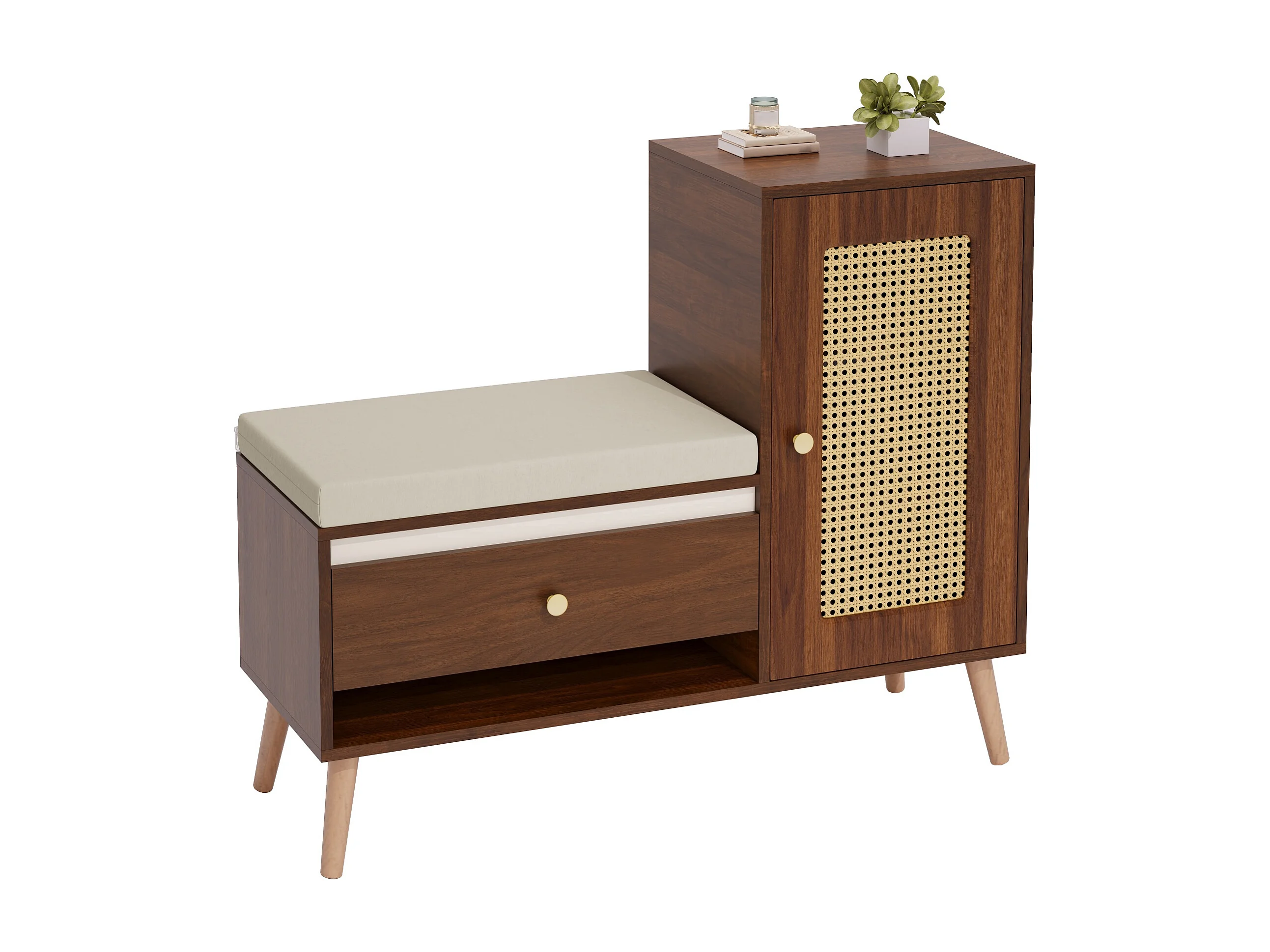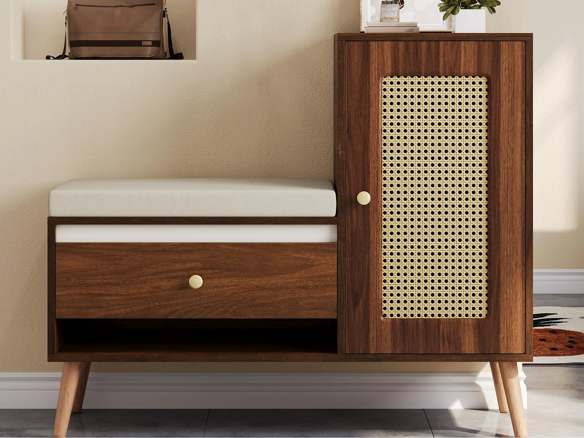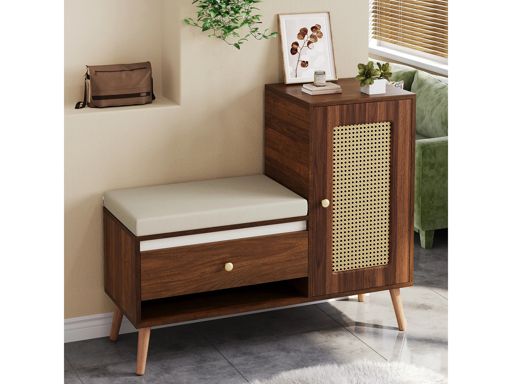 Schuhschrank aus Rattan - Eingangsbank - Mit Kissen - 1 Schublade und 1 Rattantür - Braun