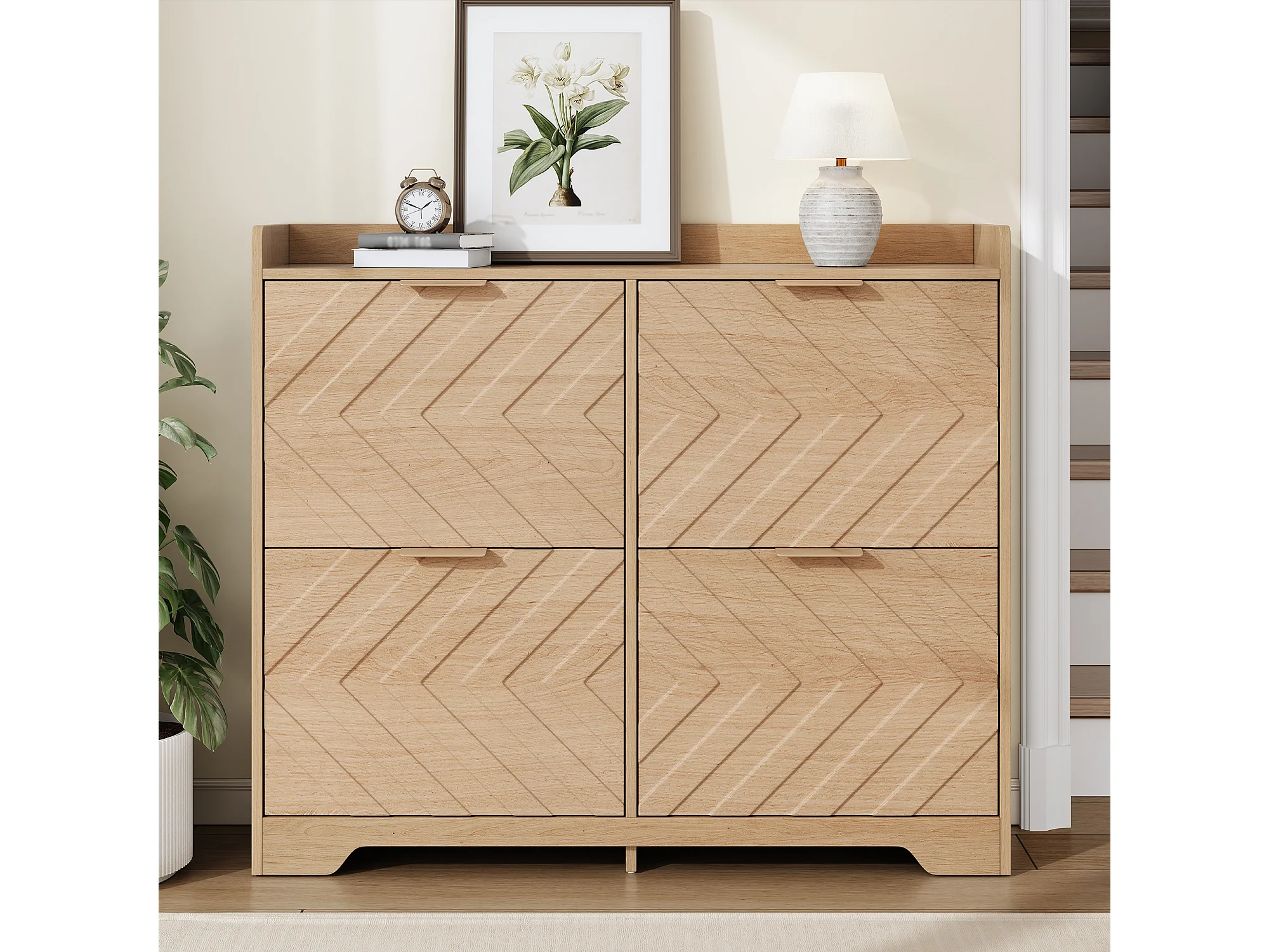 Schuhschrank für den Eingangsbereich – 105 x 24 x 90 cm – mit 4 Klappfächern – 3D-strukturierte Front – MDF – natur