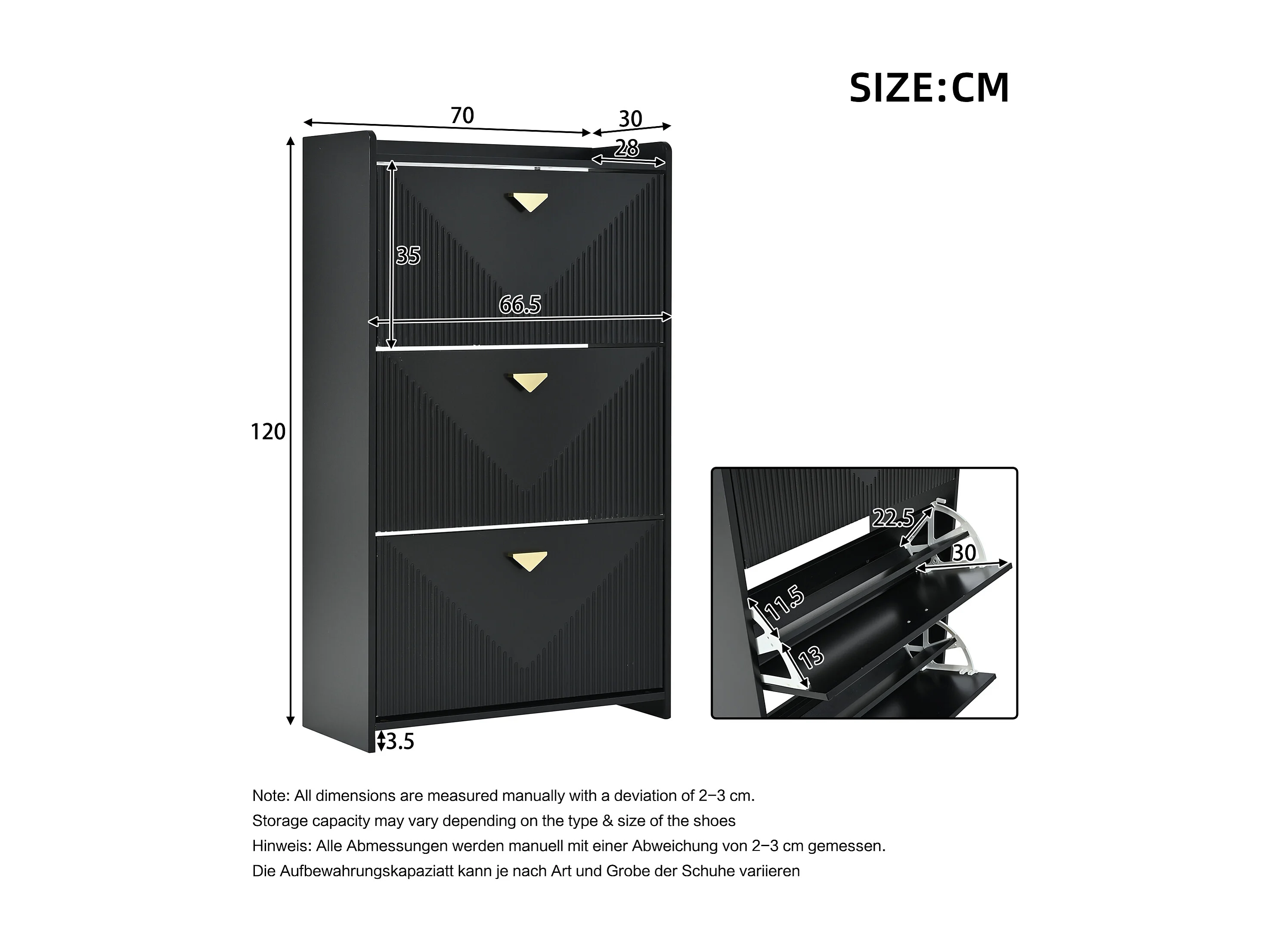 Schuhschrank für den Eingangsbereich – 70 x 30 x 120 cm – mit 3 Klapptüren – MDF – schwarz