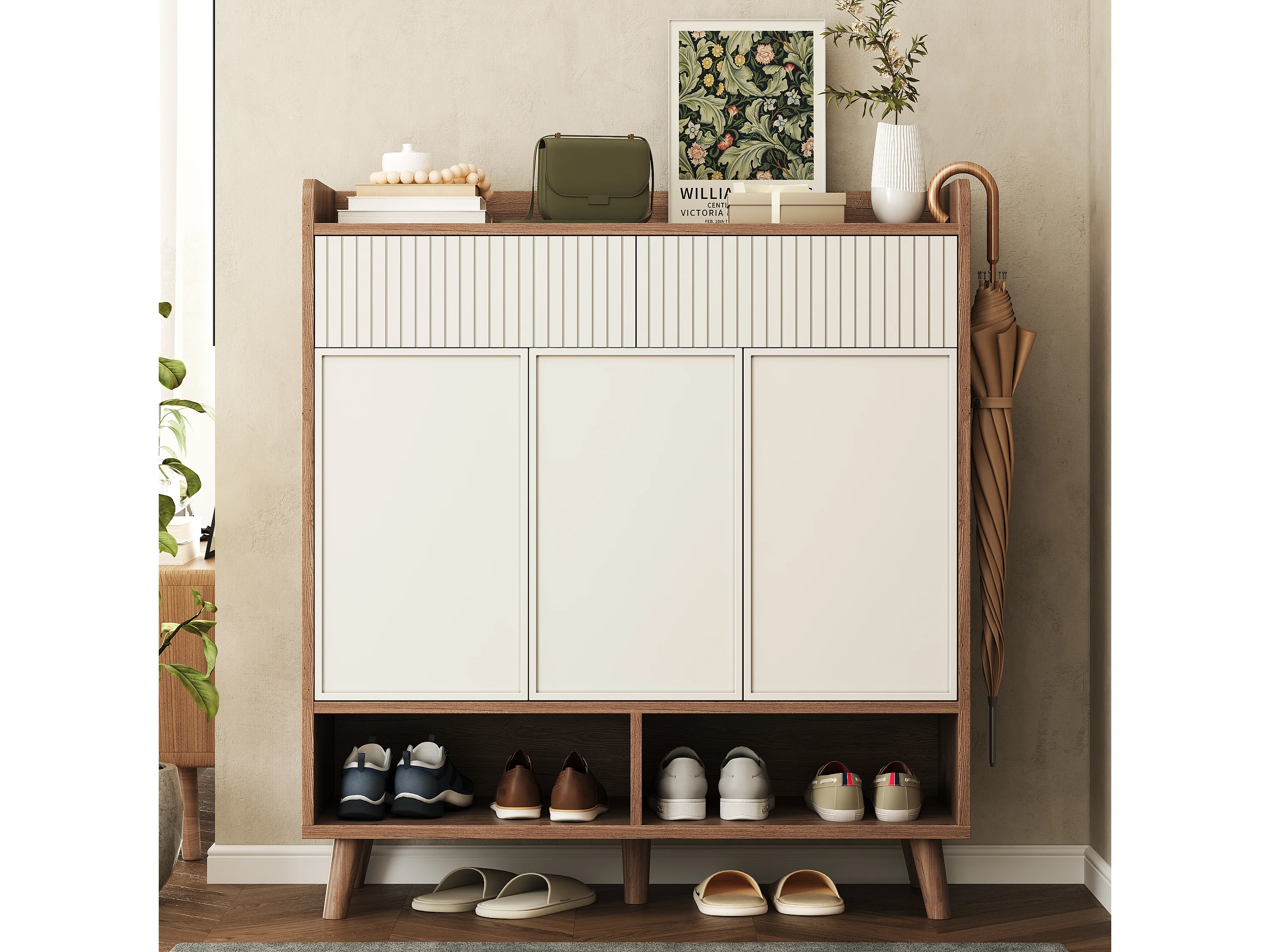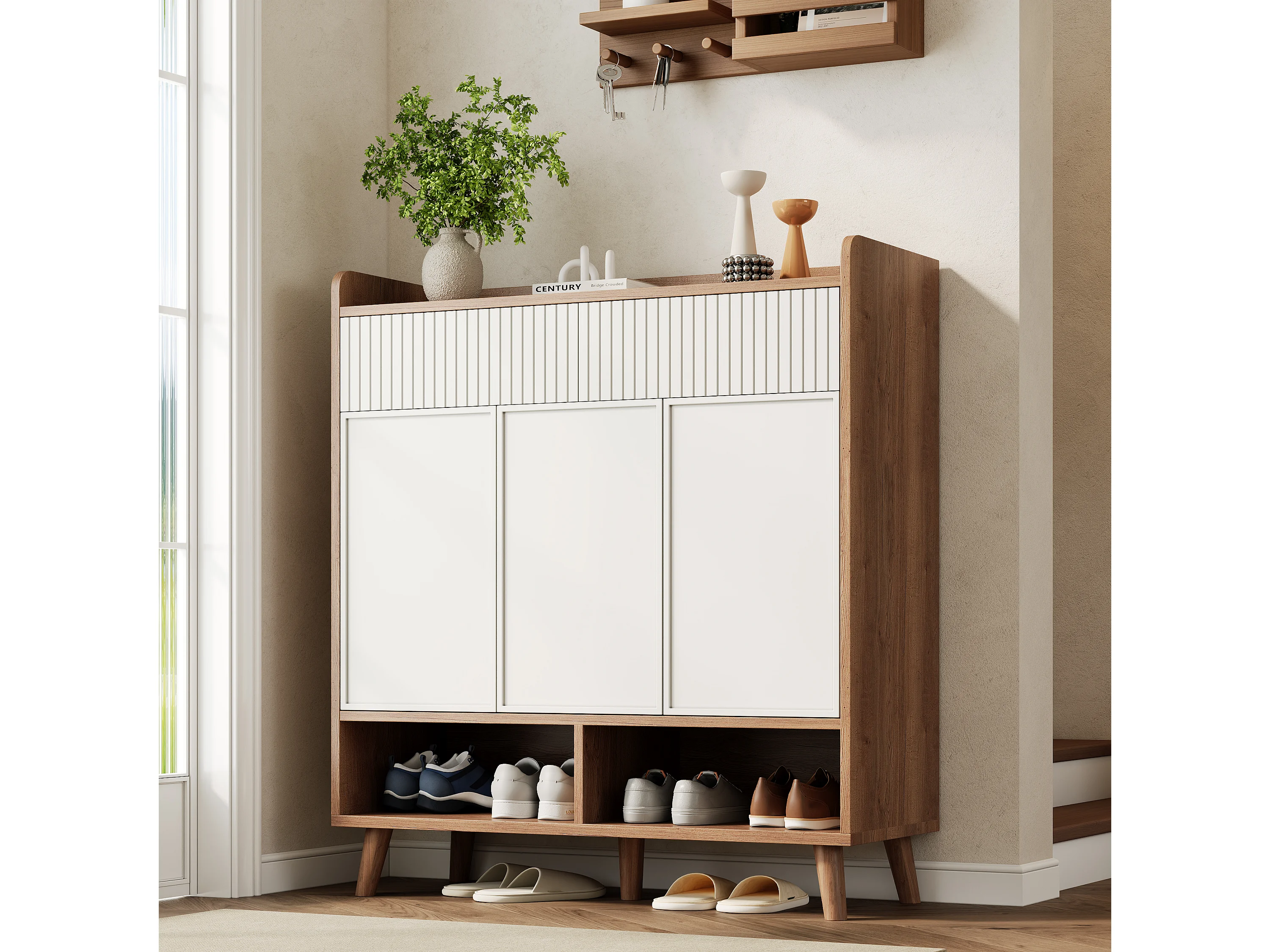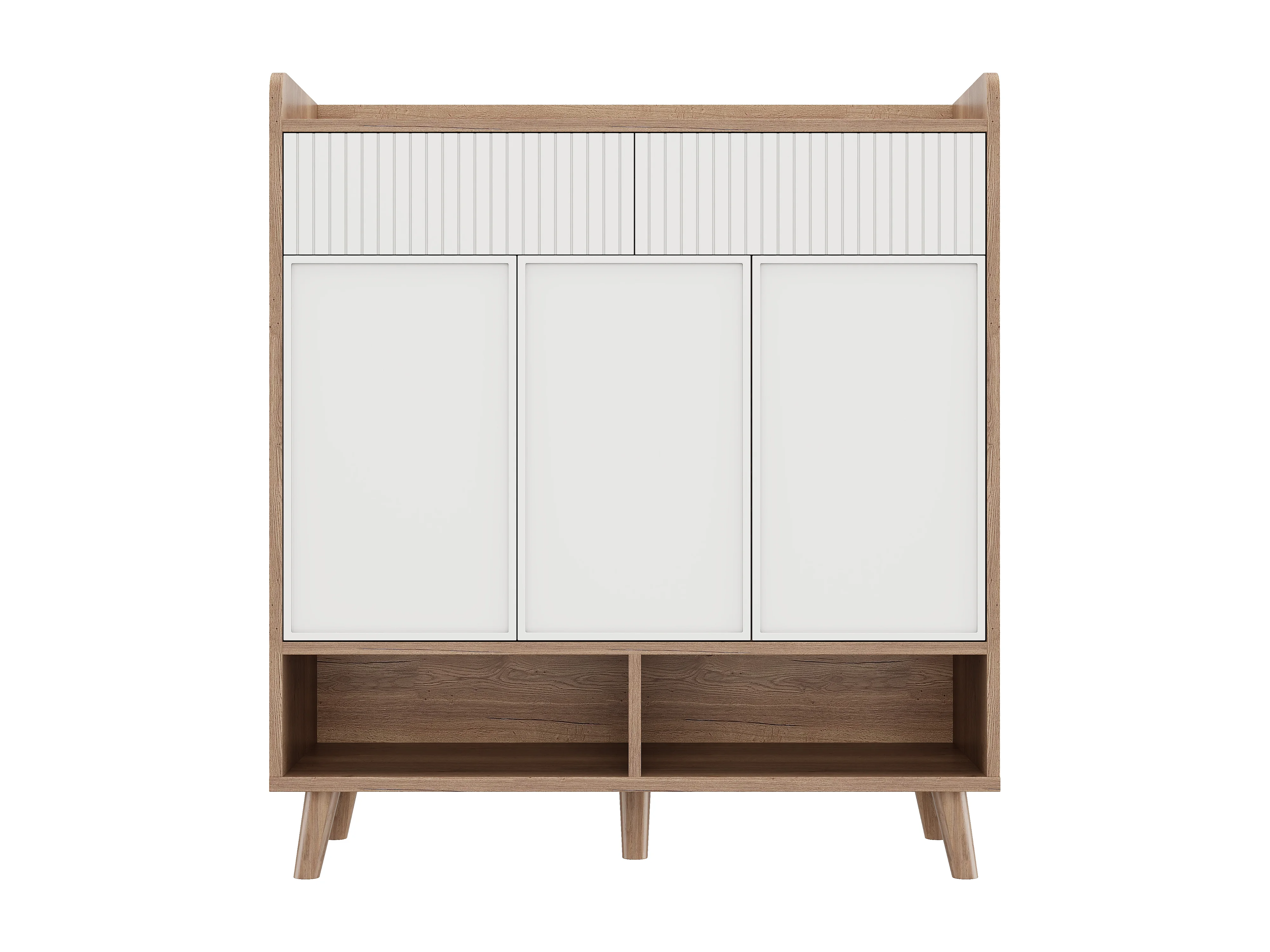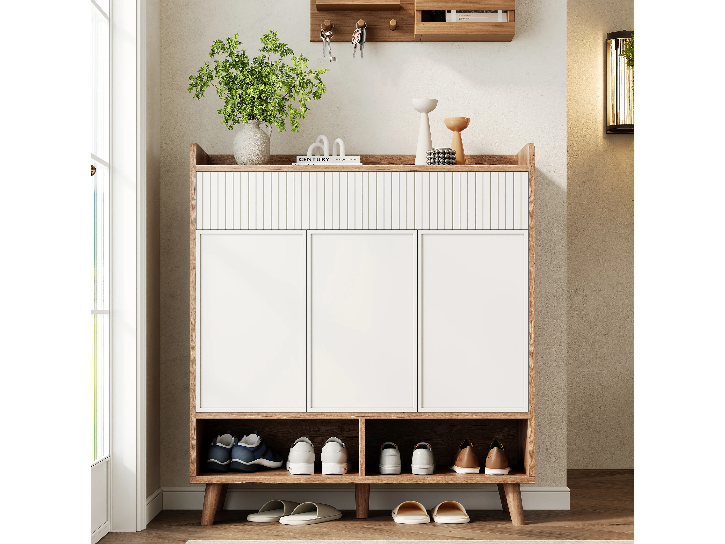 Schuhschrank für den Eingangsbereich – 90 x 35 x 100 cm – mit 3 Türen, 2 Schubladen und Einlegeböden – MDF und Spanplatte – weiß und natur