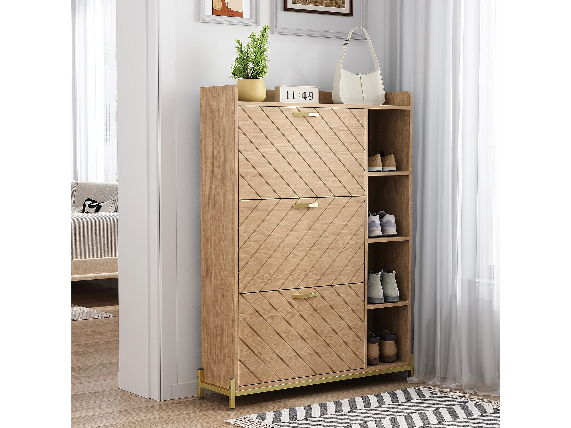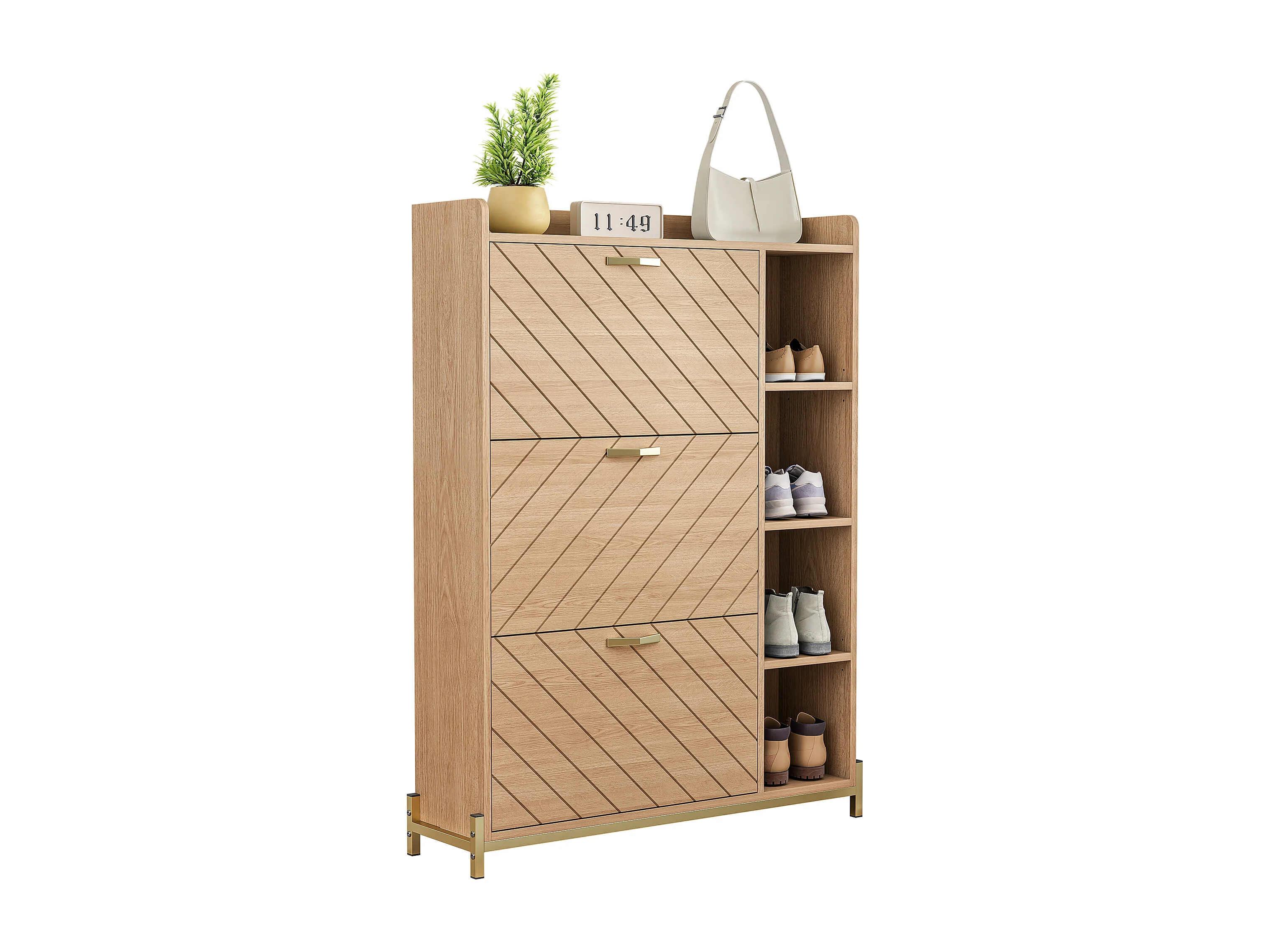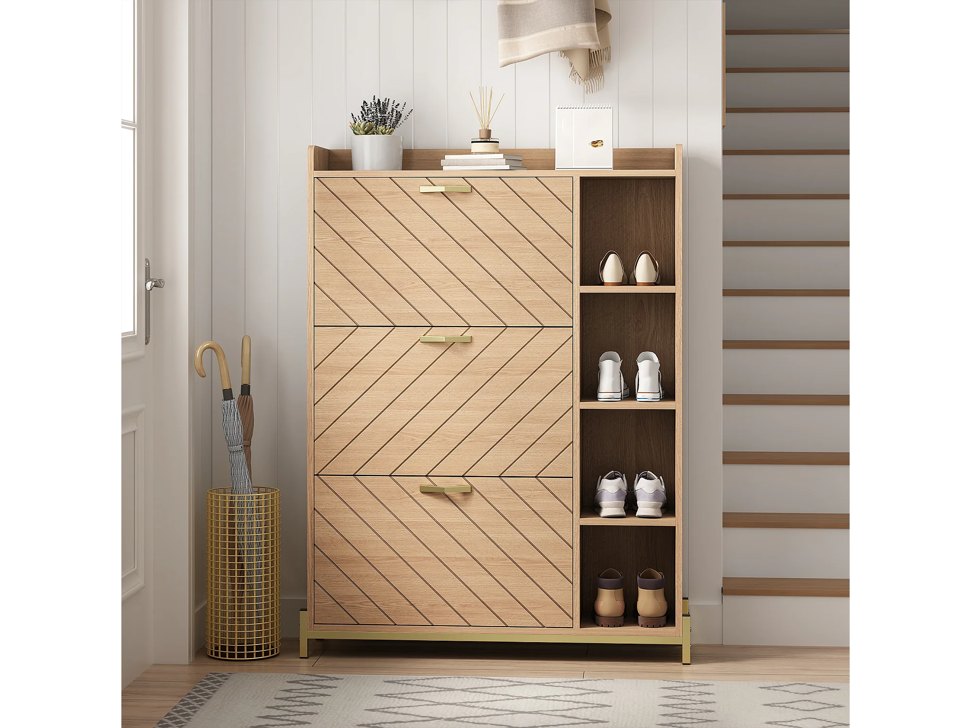 Schuhschrank im nordischen Stil – 90 x 24 x 119 cm – Eichenoptik – mit 3 Türen + offenen Regalböden – MDF – natur