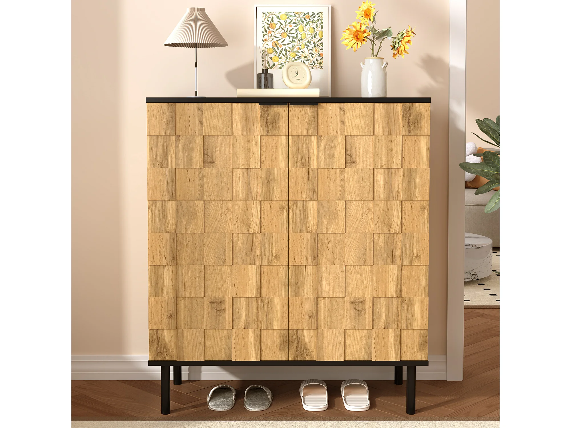 Schuhschrank in Holzoptik für den Eingangsbereich – 80 x 35 x 91,5 cm – mit 2 Türen – Metallbeine – Spanplatte – natur