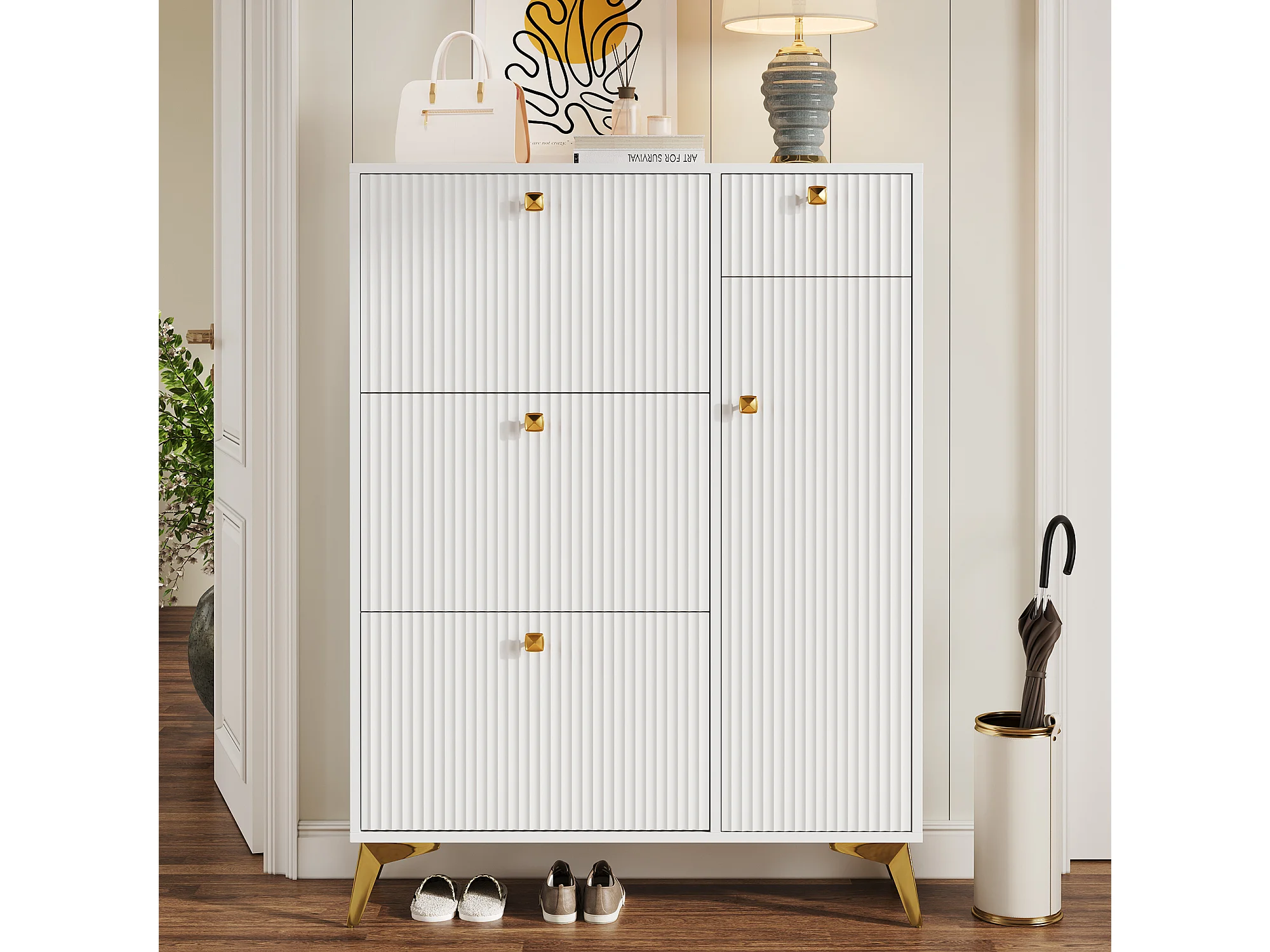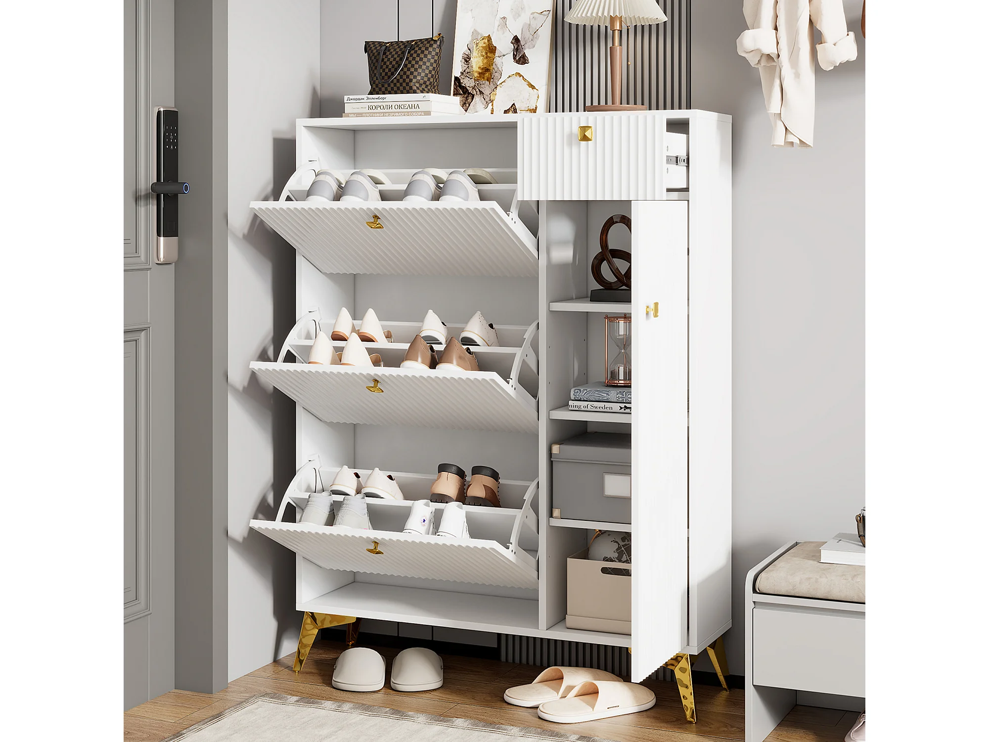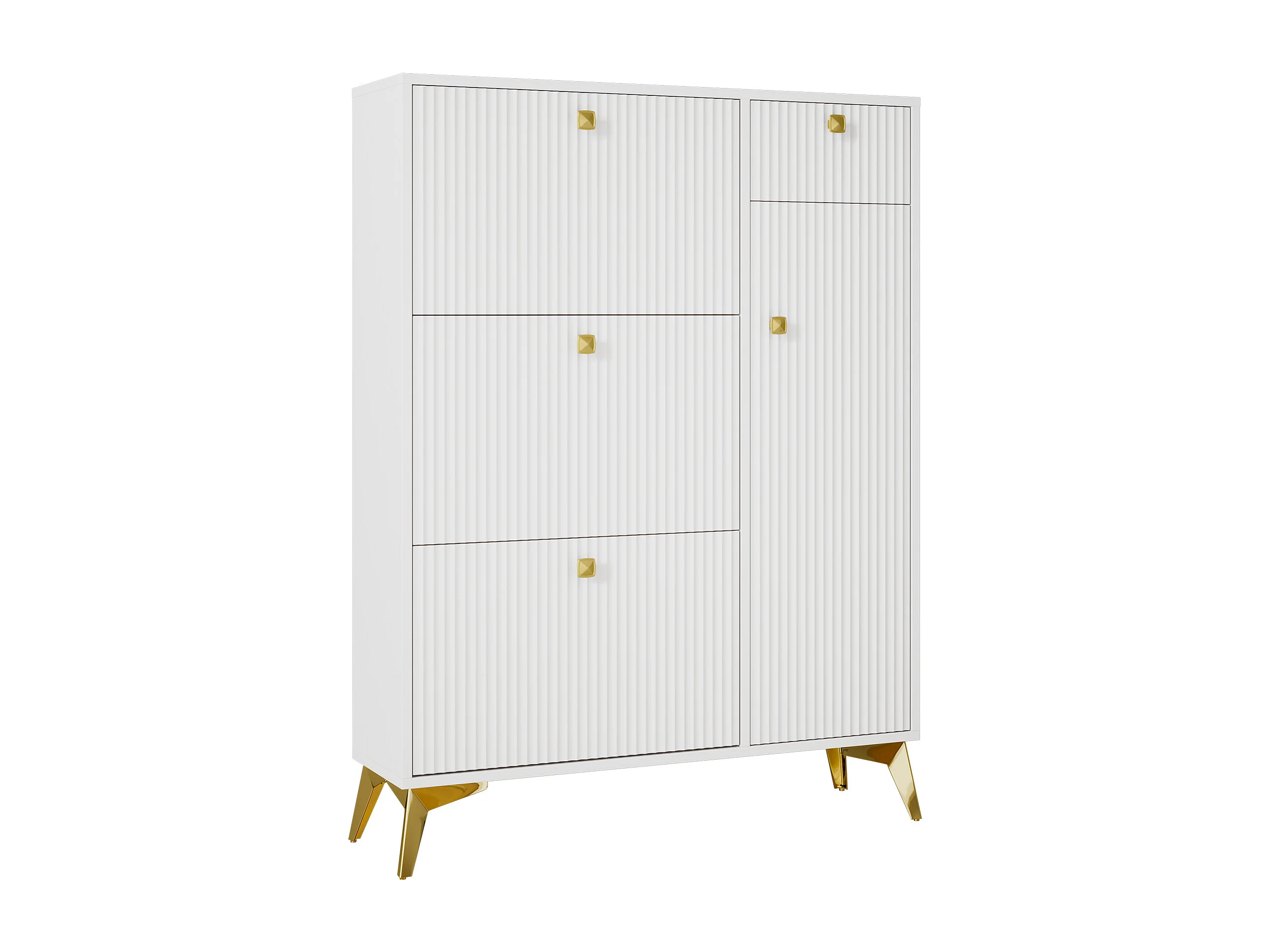 Schuhschrank mit 3 Klapptüren – 90 x 25 x 121 cm – mit 1 Schublade + 1 Tür – Spanplatte + Metall – weiß