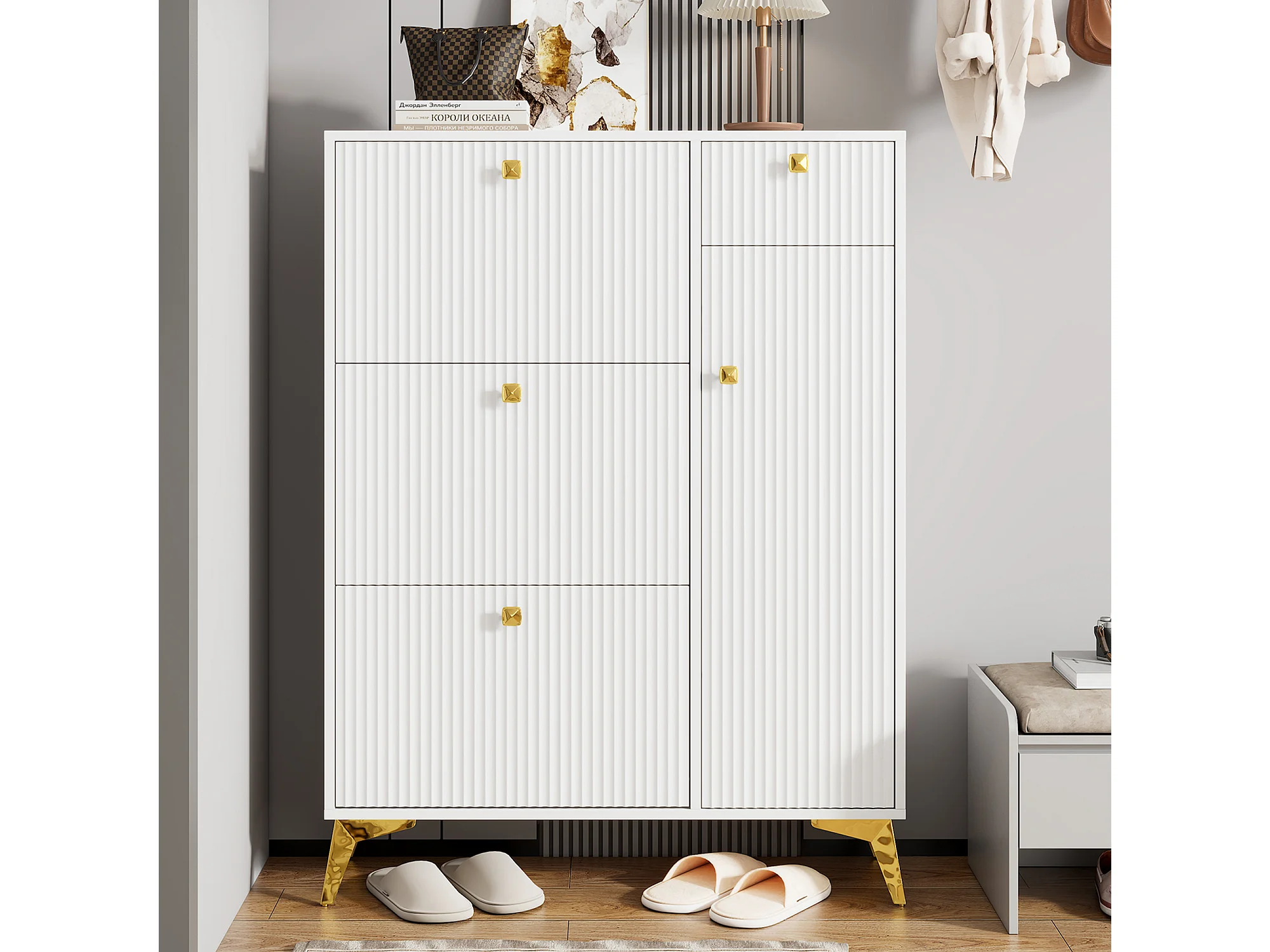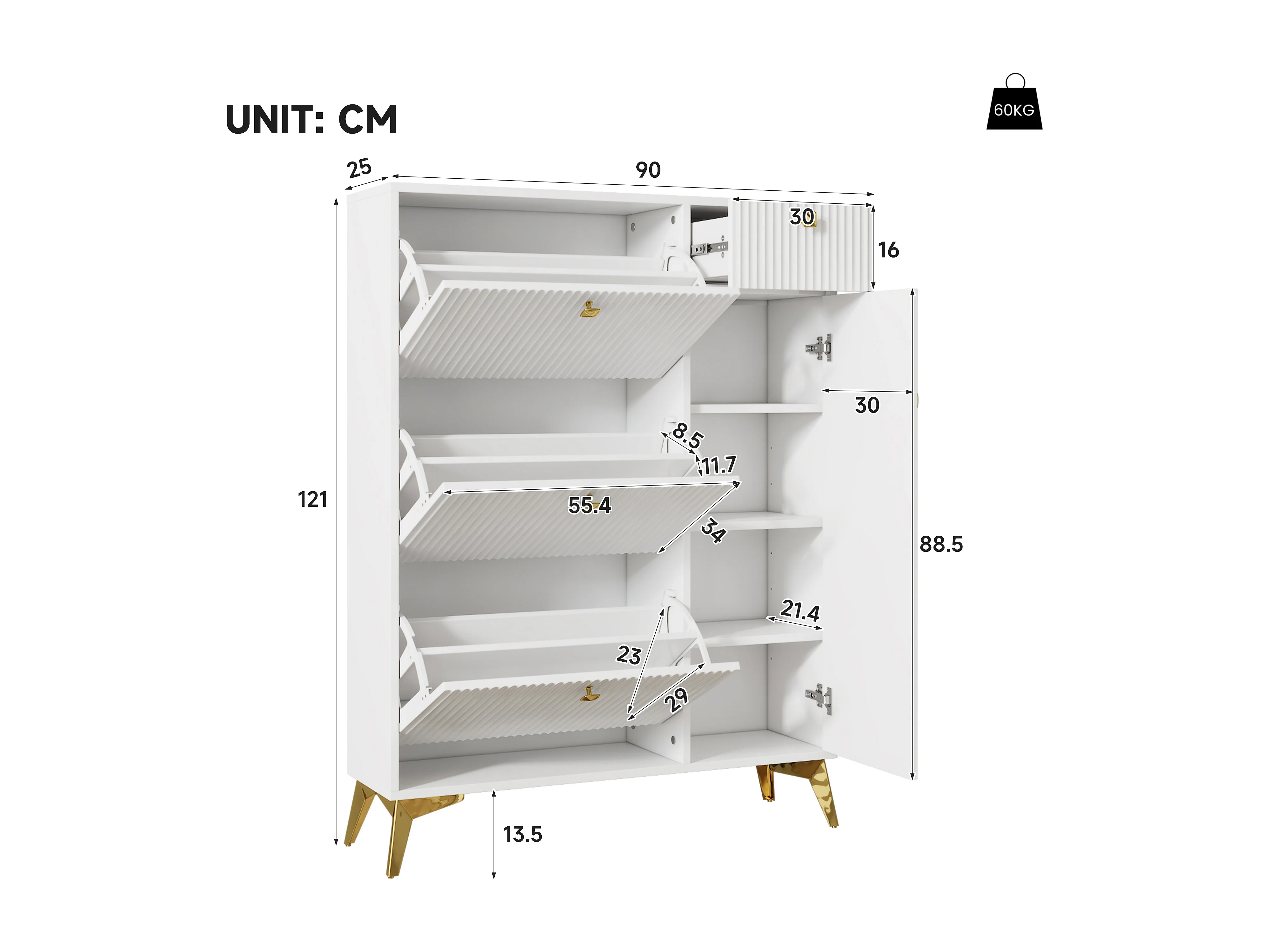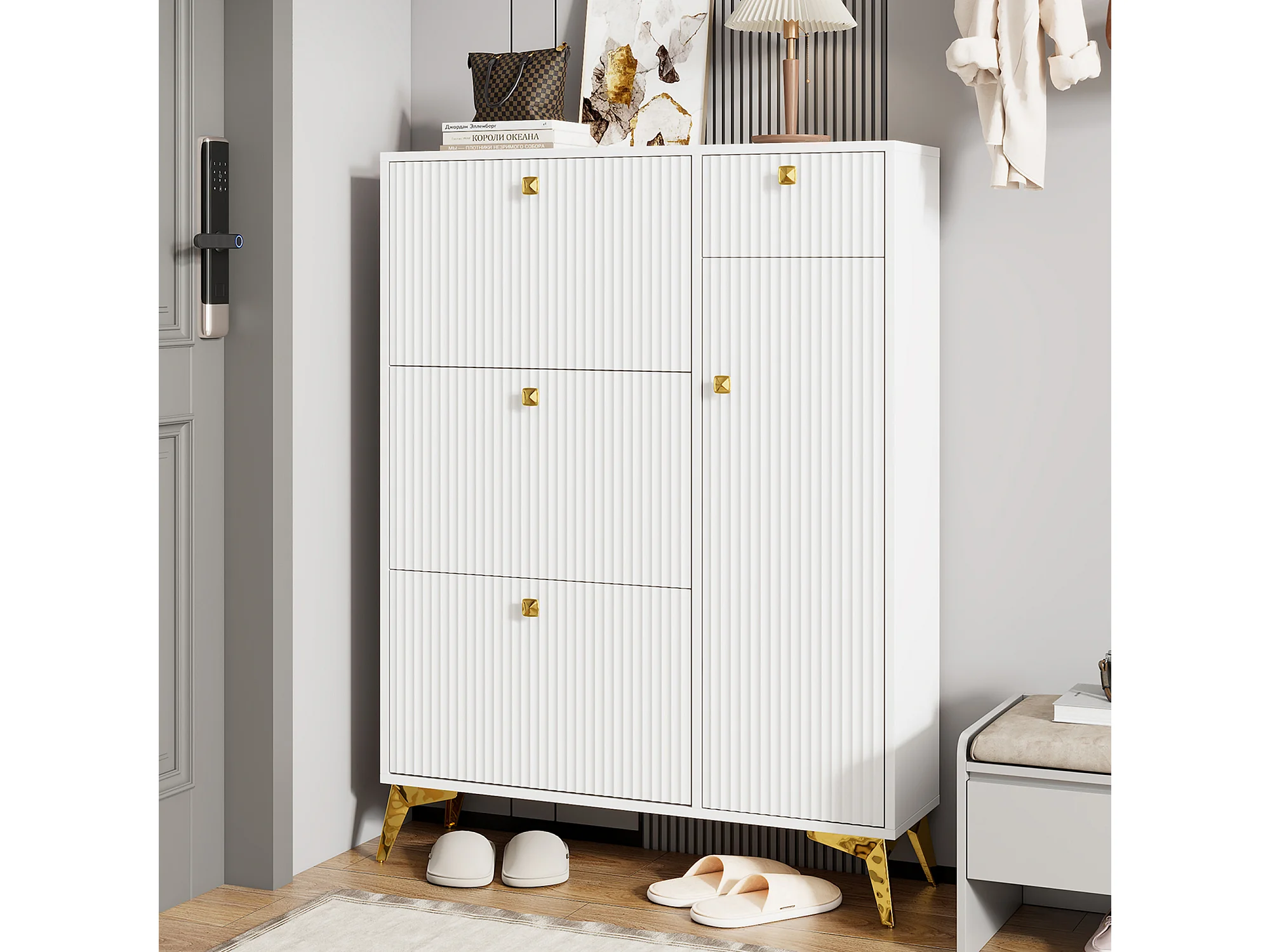 Schuhschrank mit 3 Klapptüren – 90 x 25 x 121 cm – mit 1 Schublade + 1 Tür – Spanplatte + Metall – weiß
