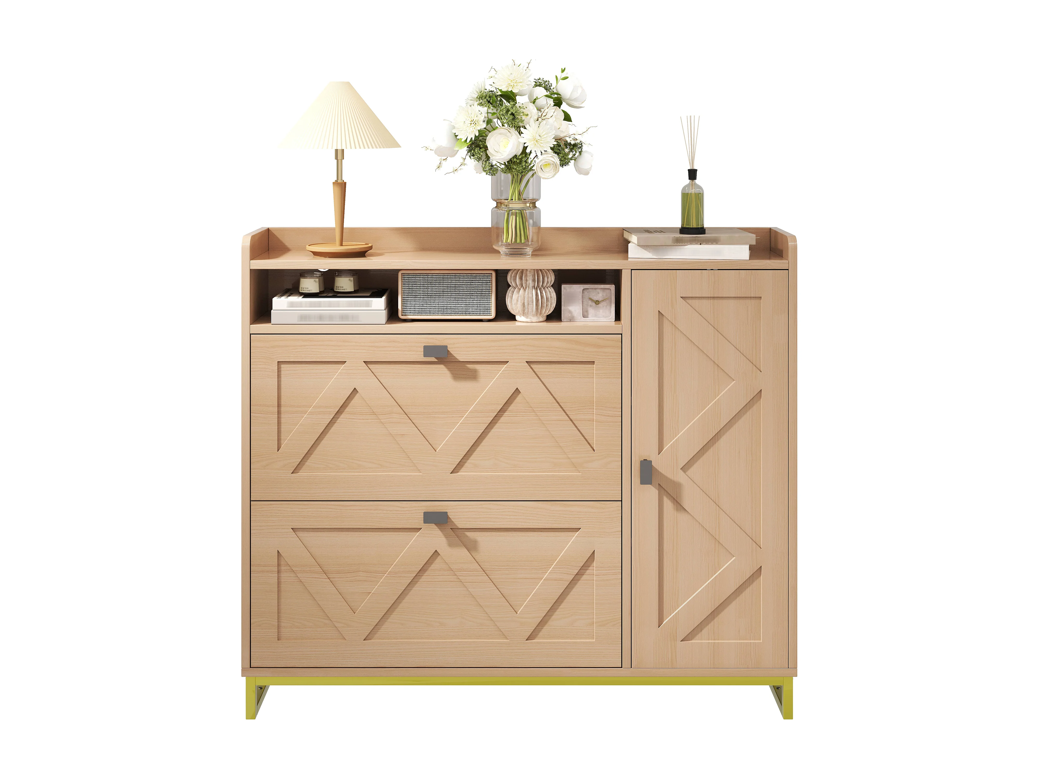 Schuhschrank mit Metallgestell – 110 x 24 x 100 cm – mit 3 Türen + Einlegeboden – MDF – natur