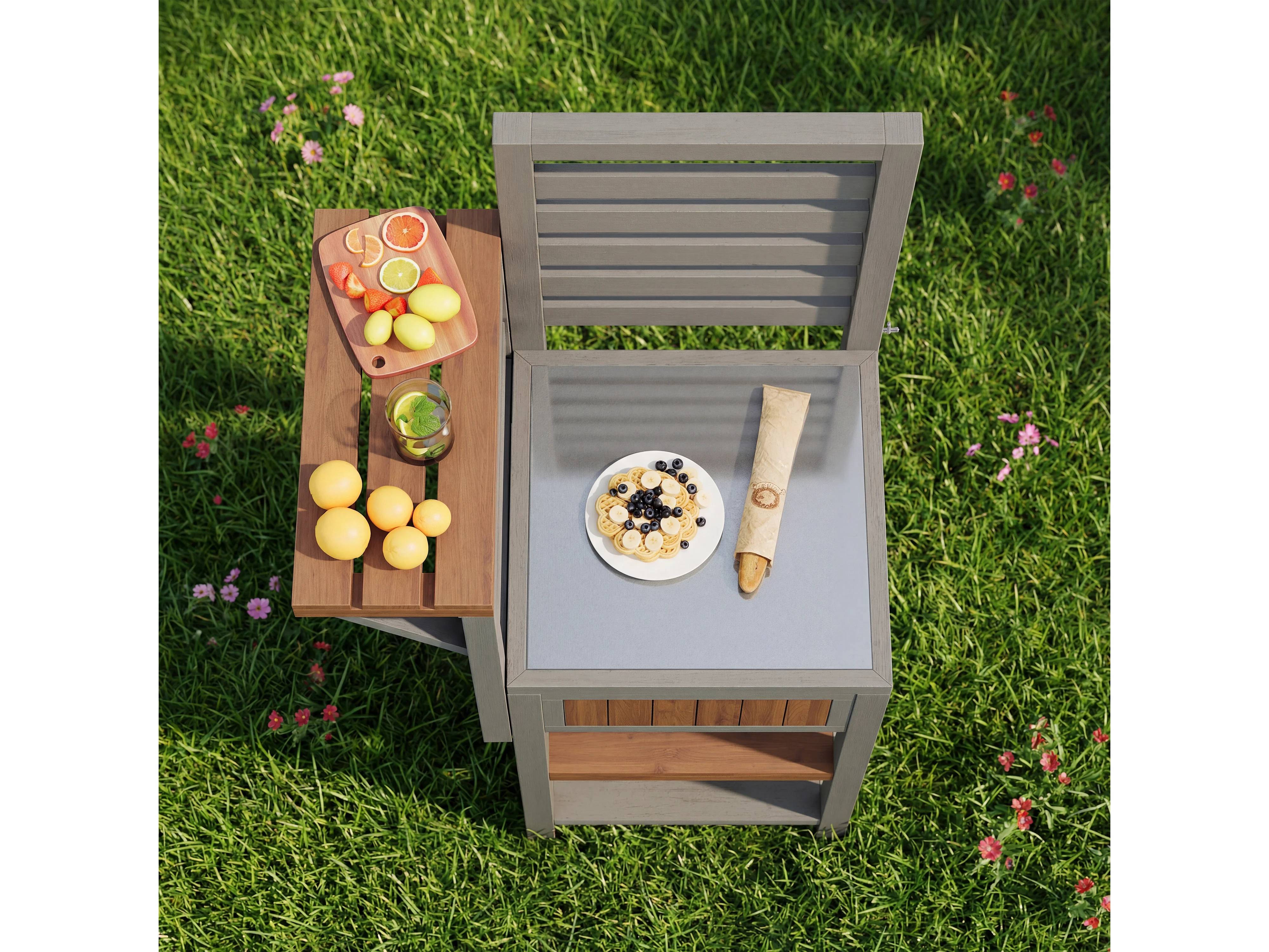 Serviertisch für Garten mit Edelstahl-Platte und Klappbrett - Hoher Aufbewahrungsschrank aus Massivholz für Balkon und Terrasse - 74x54x149cm - Grau