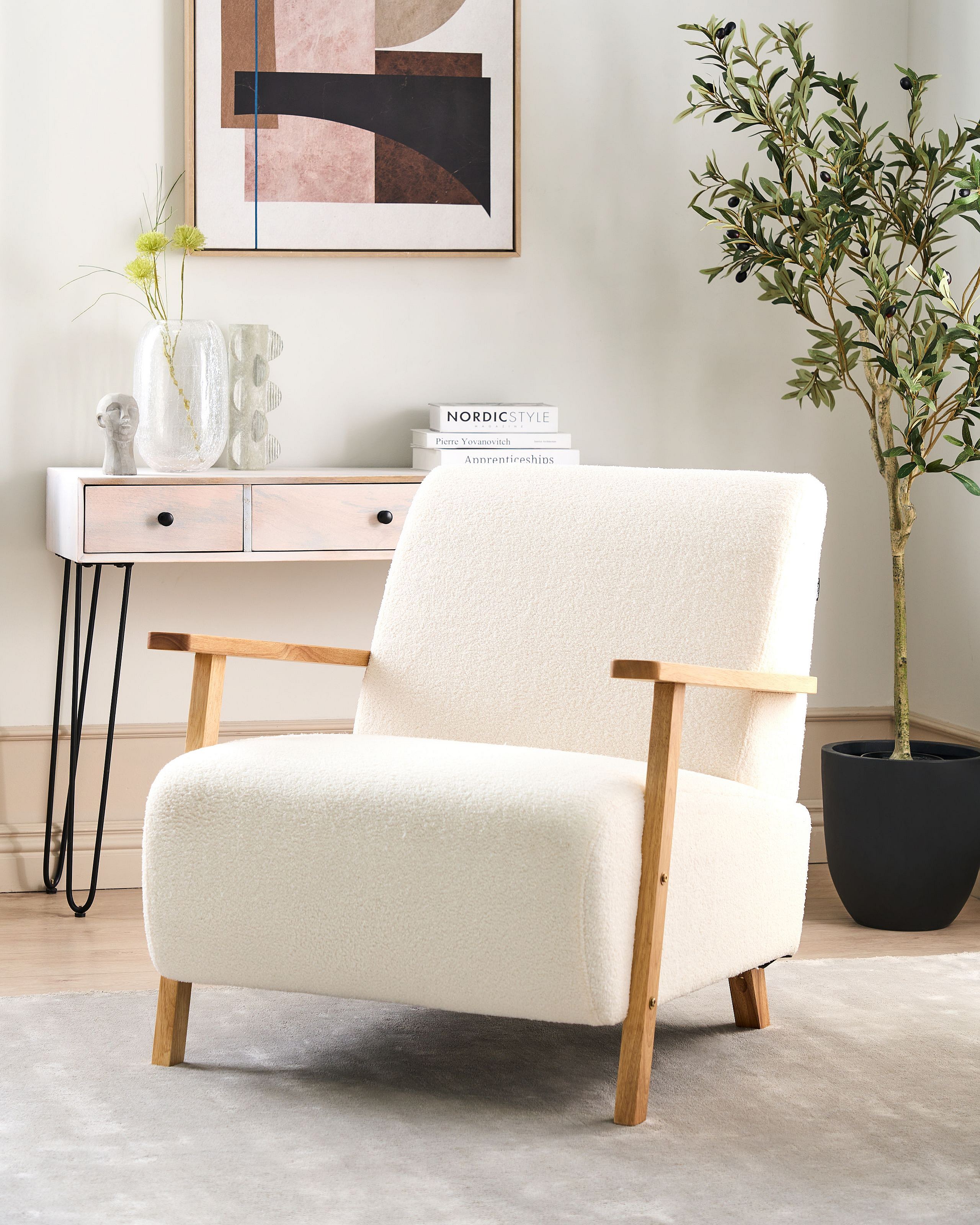 Sessel Bouclé hellbeige / heller Holzfarbton mit Armlehnen Retro Stil Lesja