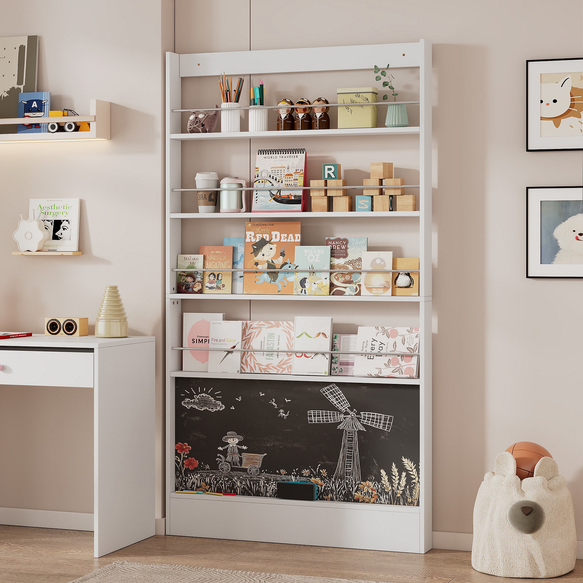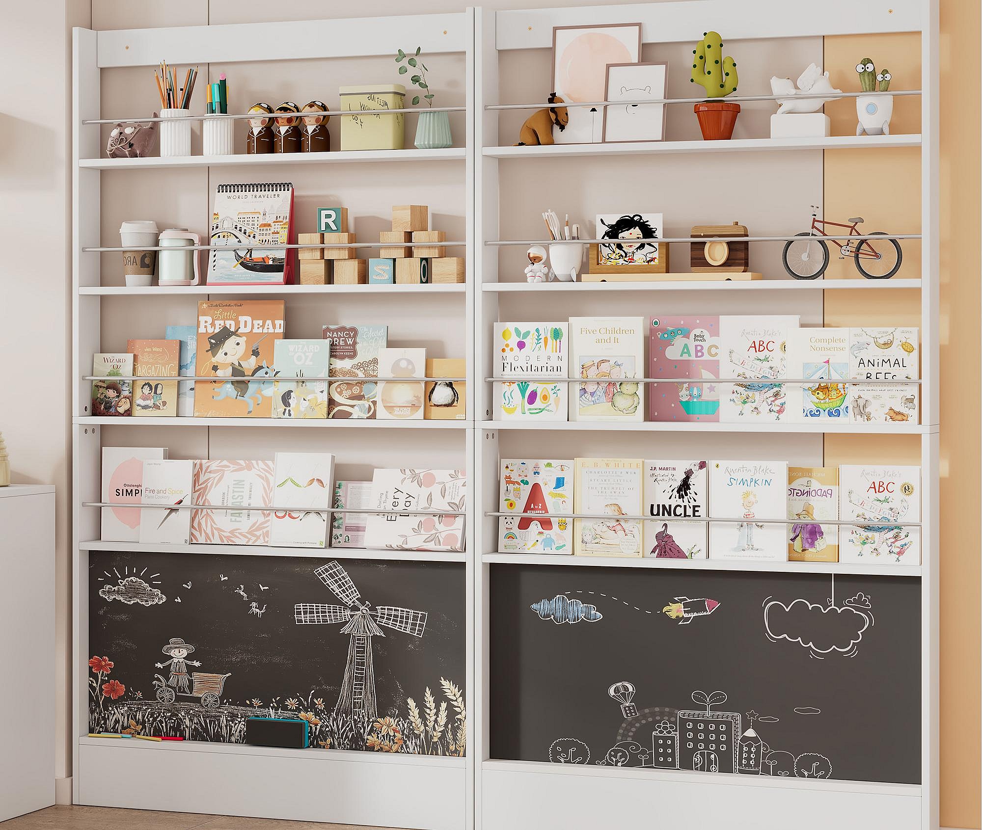Set aus 2 Kinderregalen - 200x10x180 cm - 4-lagige Ablagefächer - Mit Tafel - Weiß