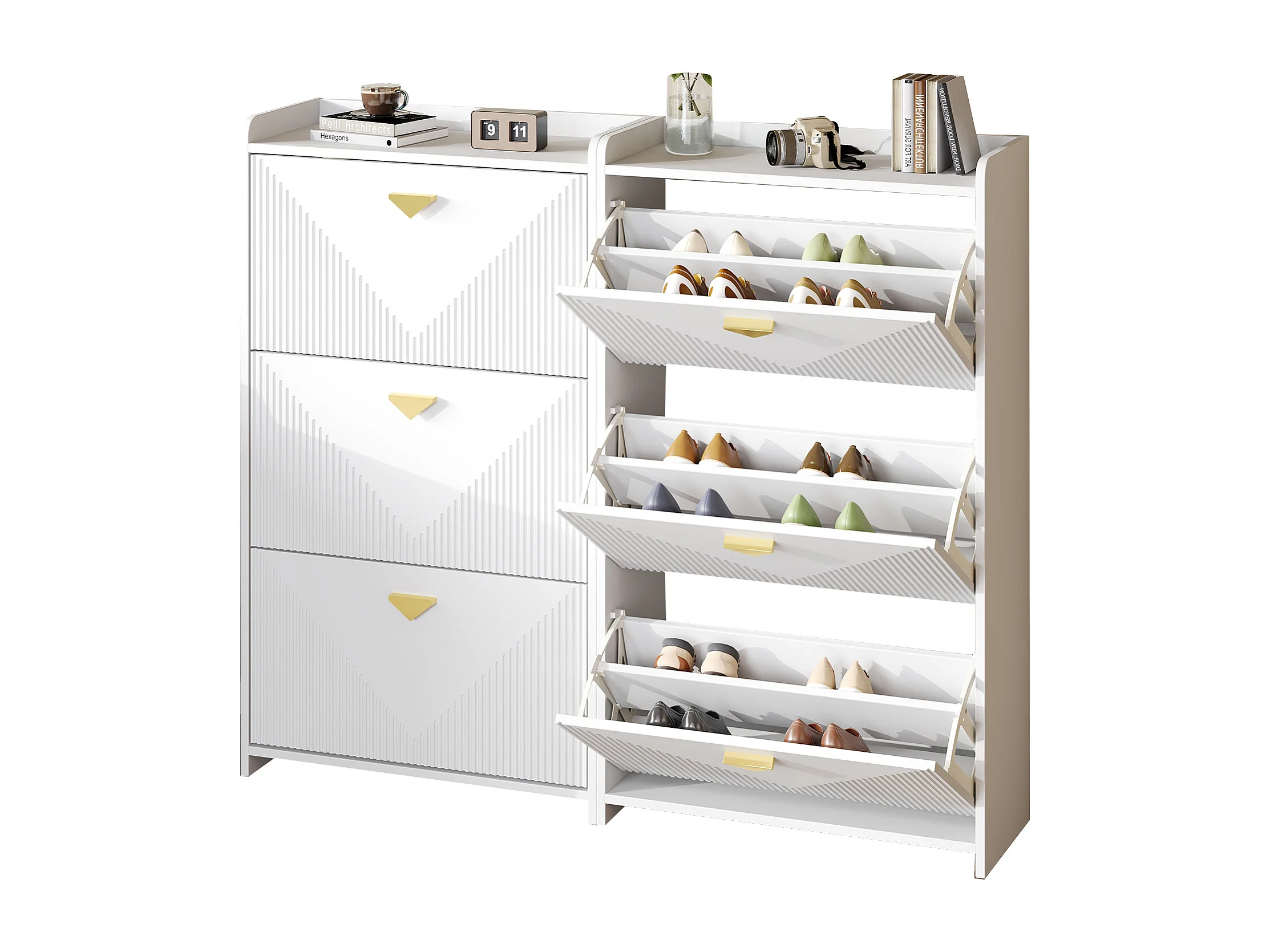 Set aus 2 Schuhschränken 140x30x120 cm - 6 Klapptüren - 12 Staufächer - MDF - Weiß