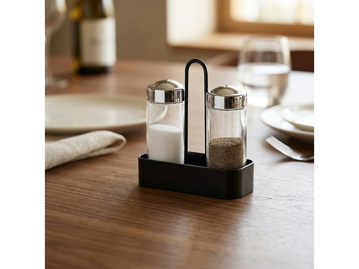 Set Salz und schwarzer Pfeffer mit Glasbehältern und Metallhalterung