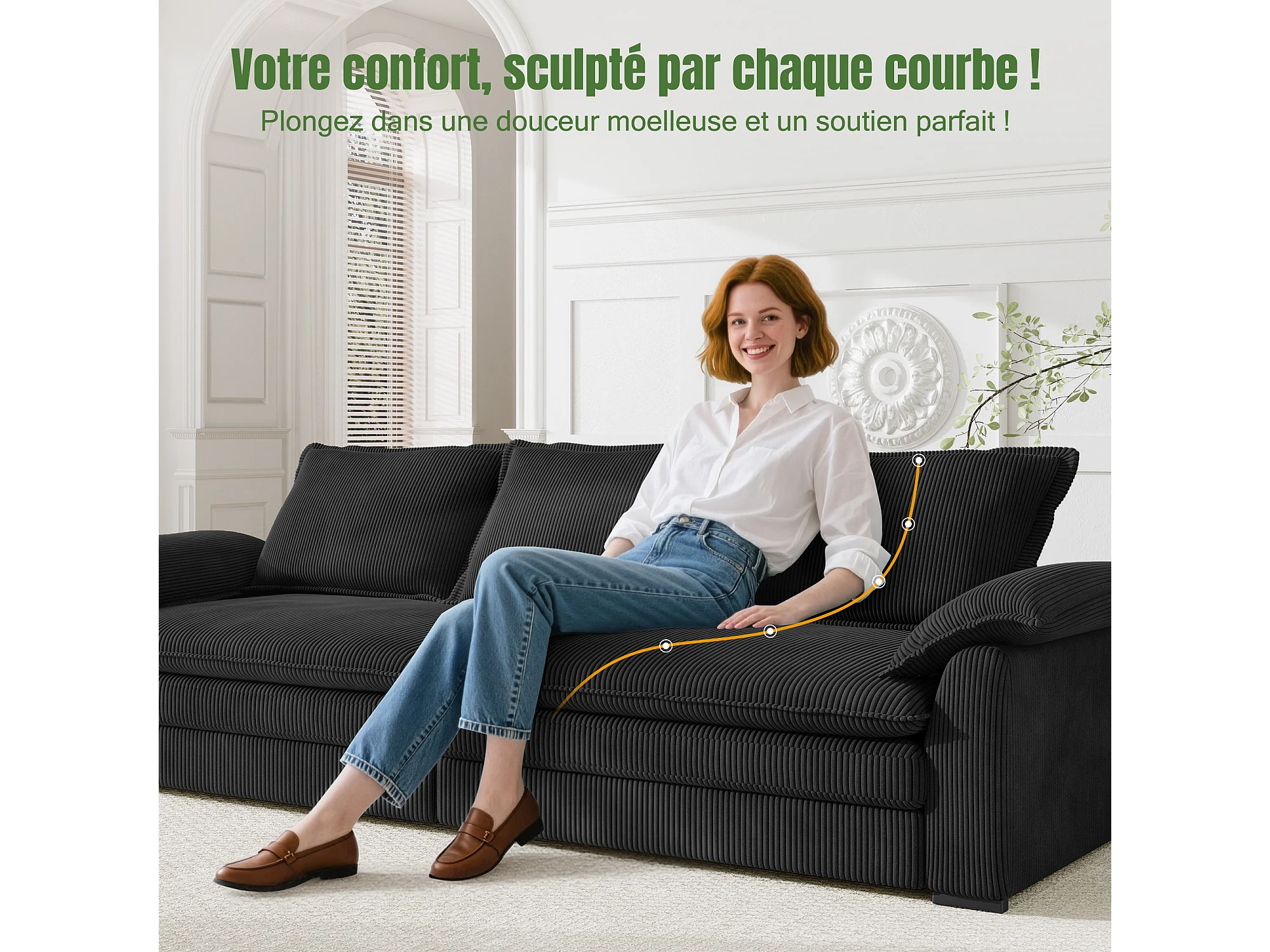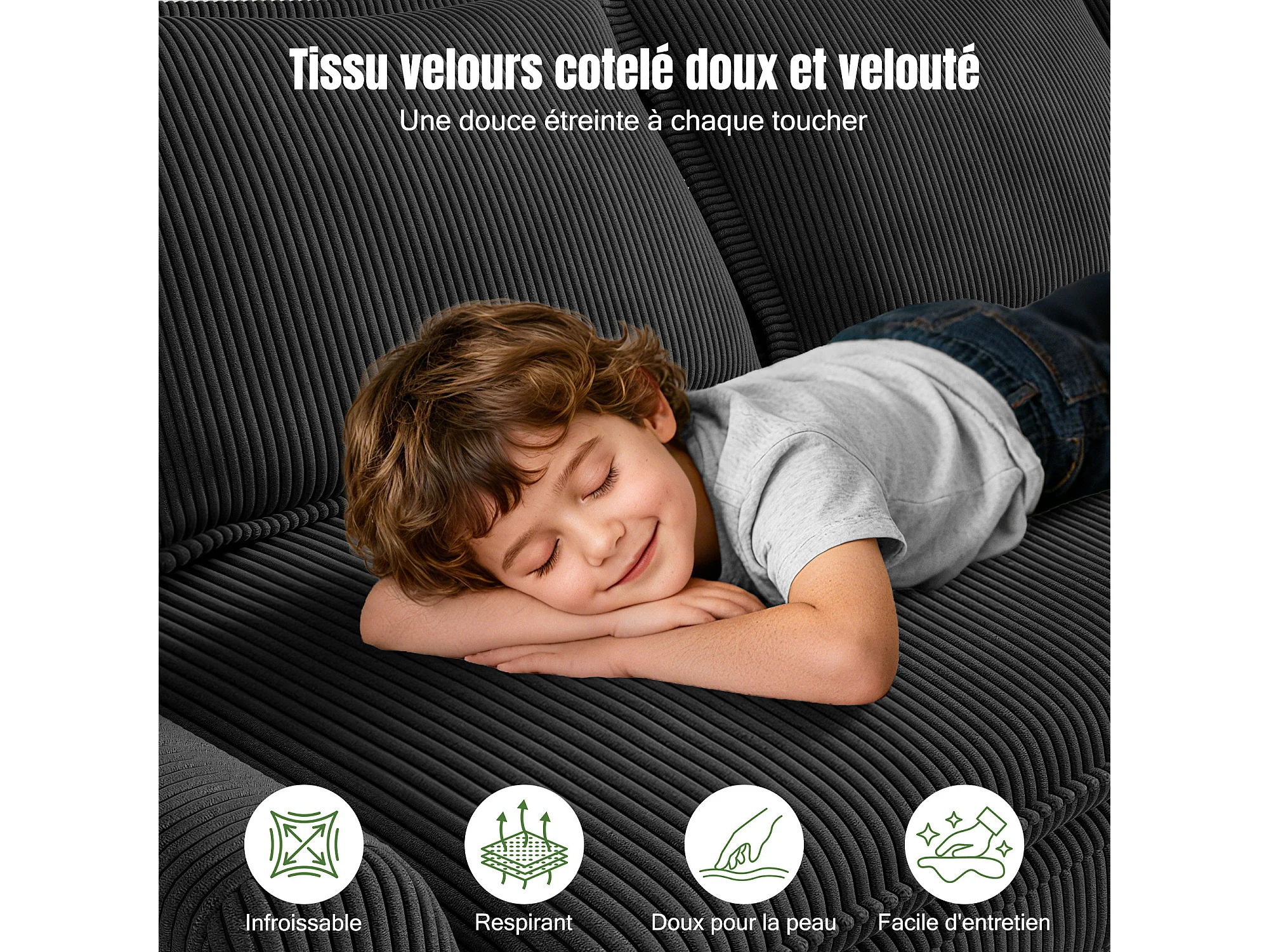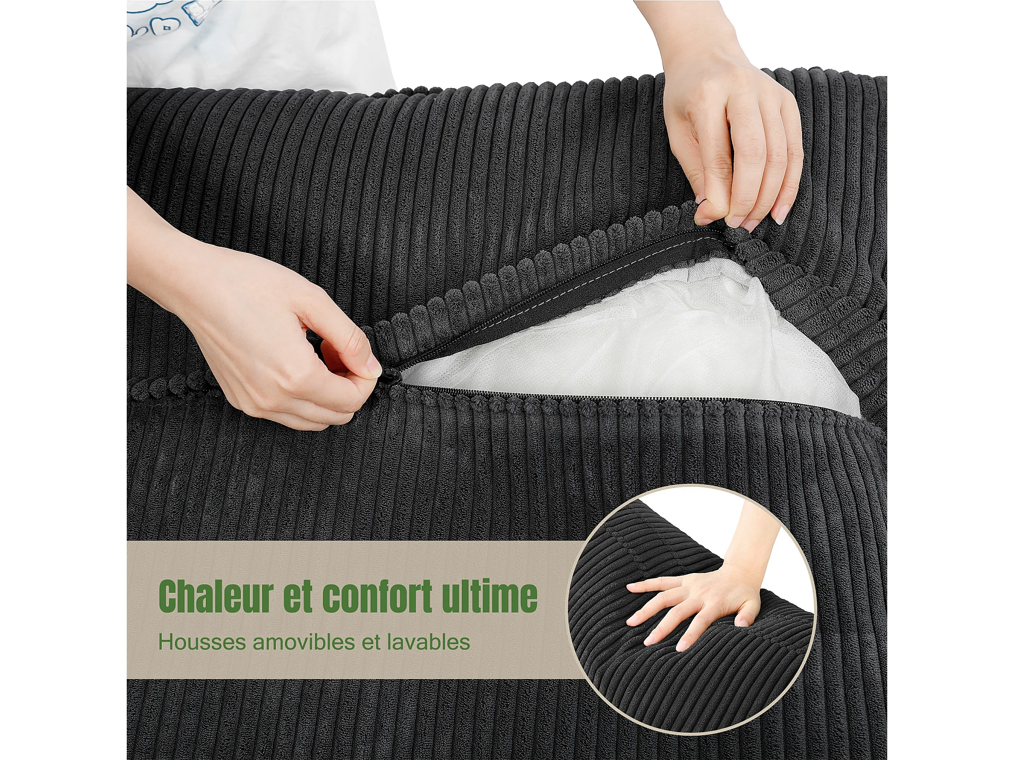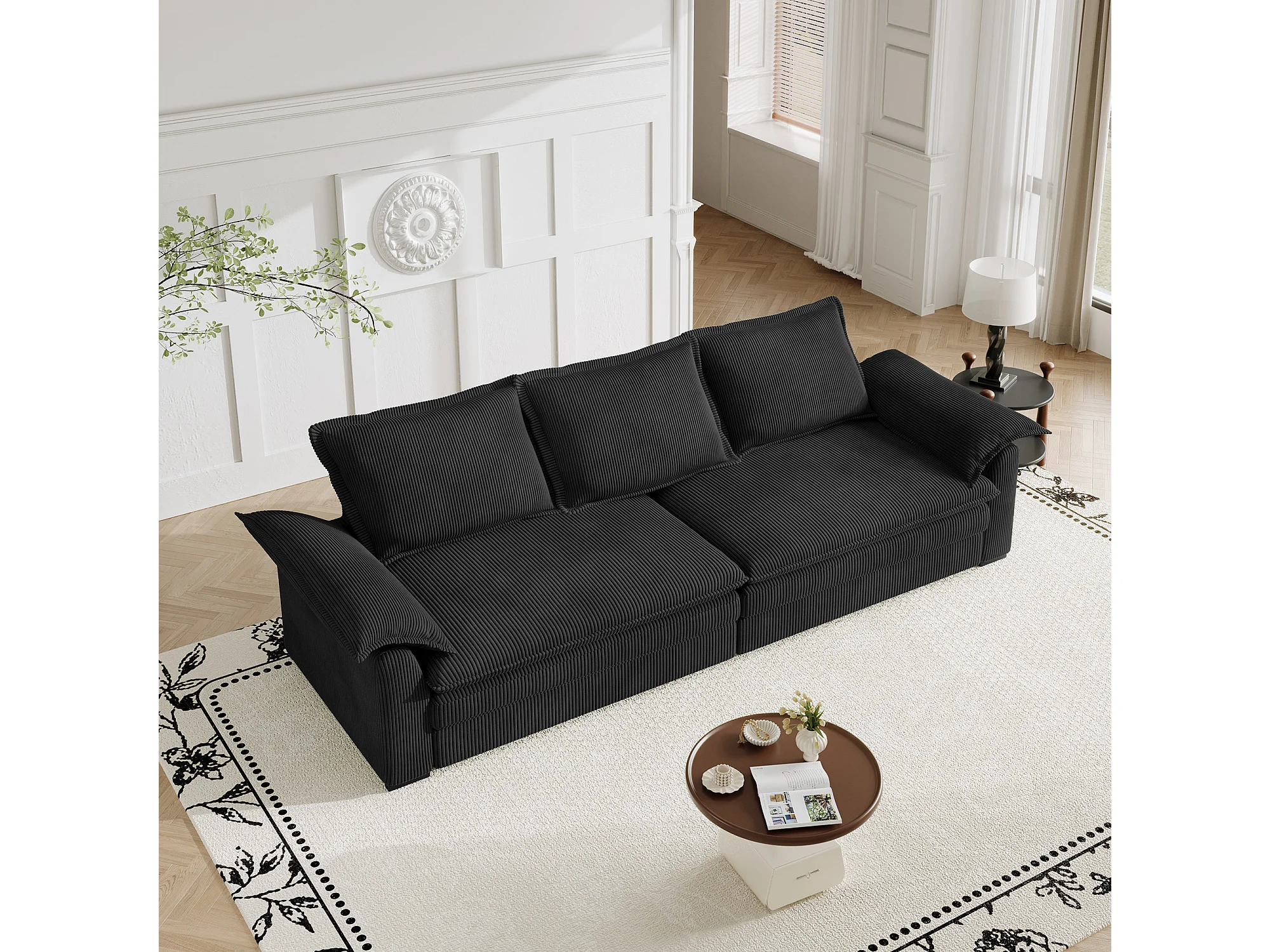 Sofa 3-sitzig in Rippvelours, mit 2 Armlehnkissen, abnehmbar und waschbar, 265x86x88cm, Schwarz