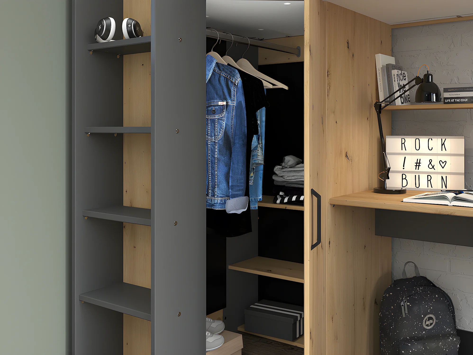 Sparset Jugendzimmer: Hochbett 90 x 200 cm mit Schreibtisch & Kleiderschrank + Matratze + Bettdecke + Kopfkissen - Naturfarben & Anthrazit - AUCKLAND