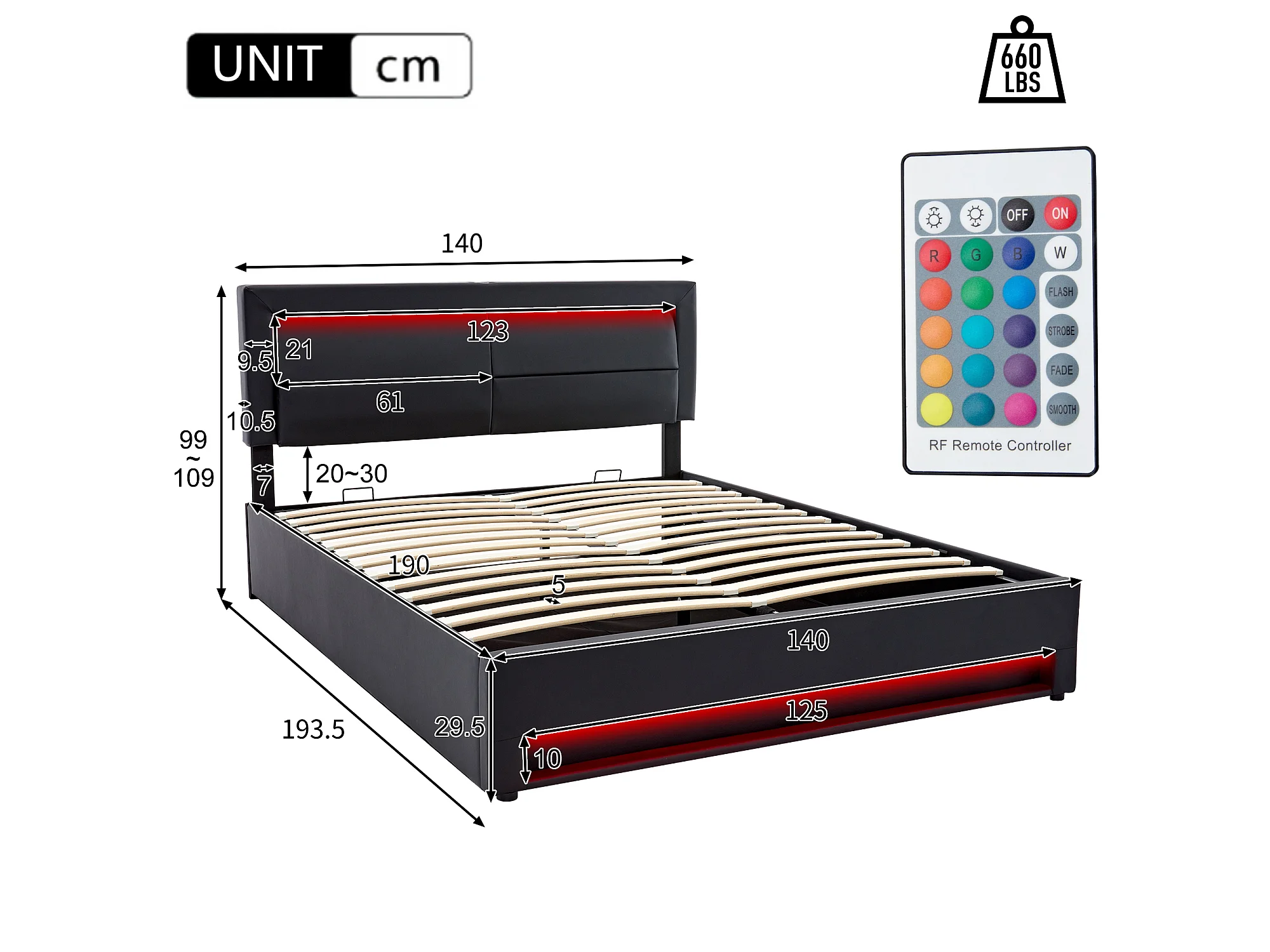 Stauraumbett 140 x 190 cm aus Kunstleder mit LED – mit Ladeanschlüssen (kabelgebunden und kabellos) – Schwarz
