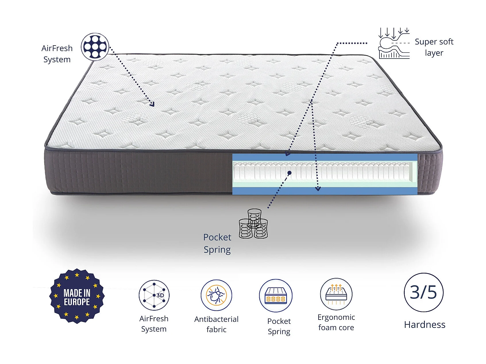 Matratze 160x200 HERA SPRING - H3 - Höhe 25 CM Pocketsprings, atmungsaktiver HR-Schaum