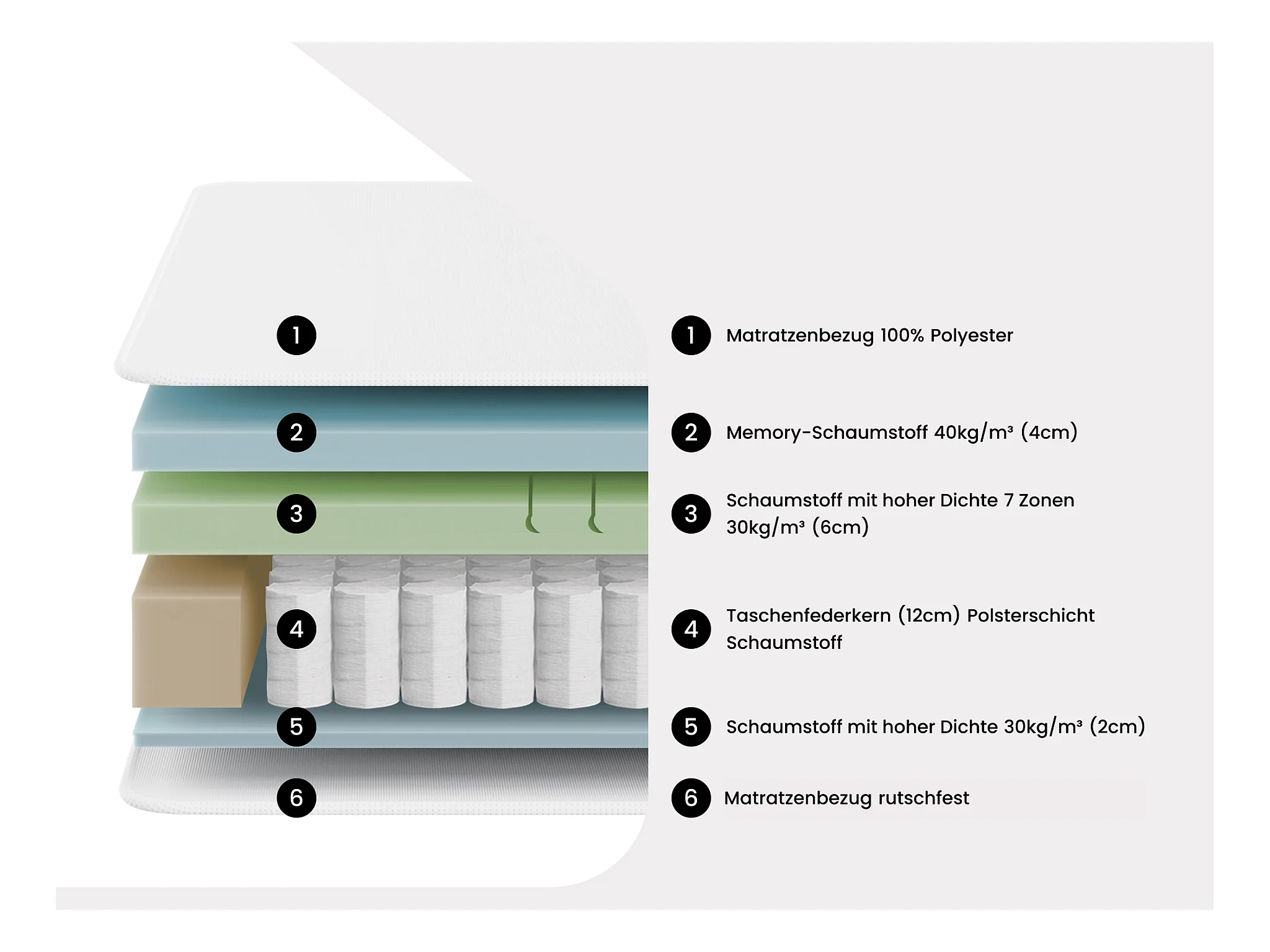 • Doppelte Auflage aus Memory Schaum und 7-Zonen-Schaumstoff