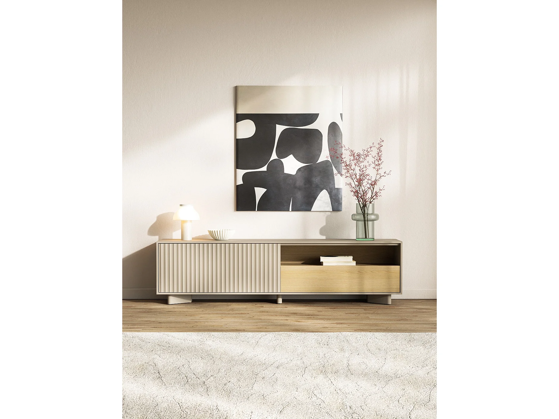 TV-Lowboard mit Schublade und geriffelter Front Kaschmirgrau / Eichenholzoptik – 175 cm – DISTRIA