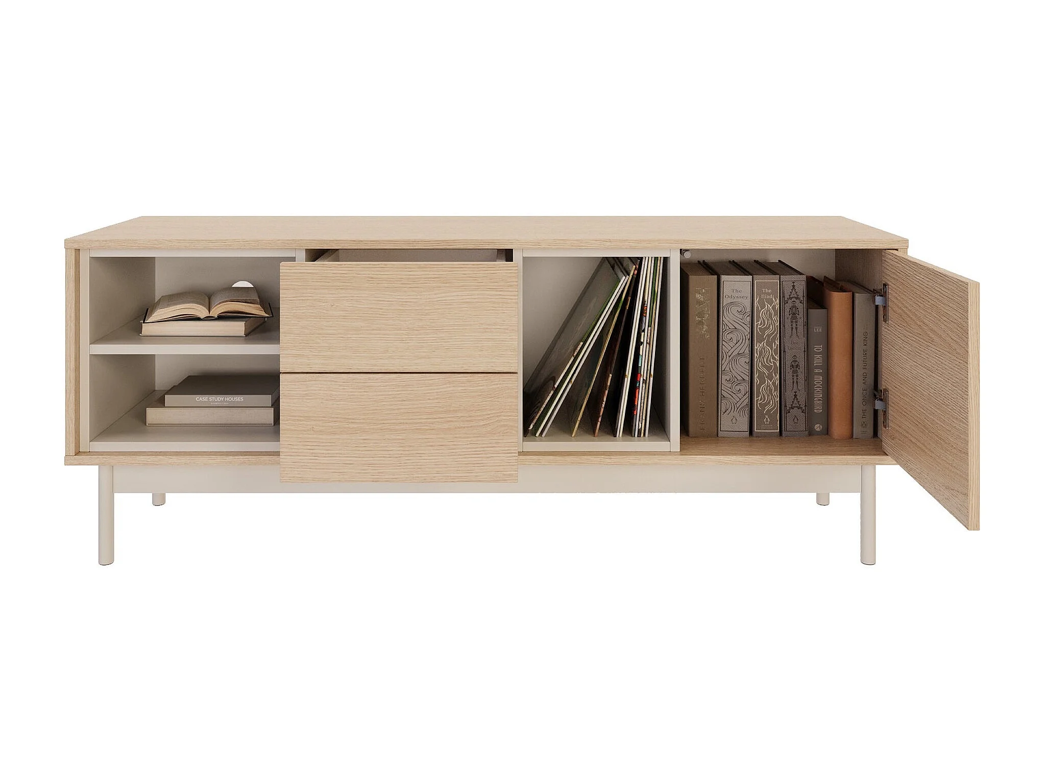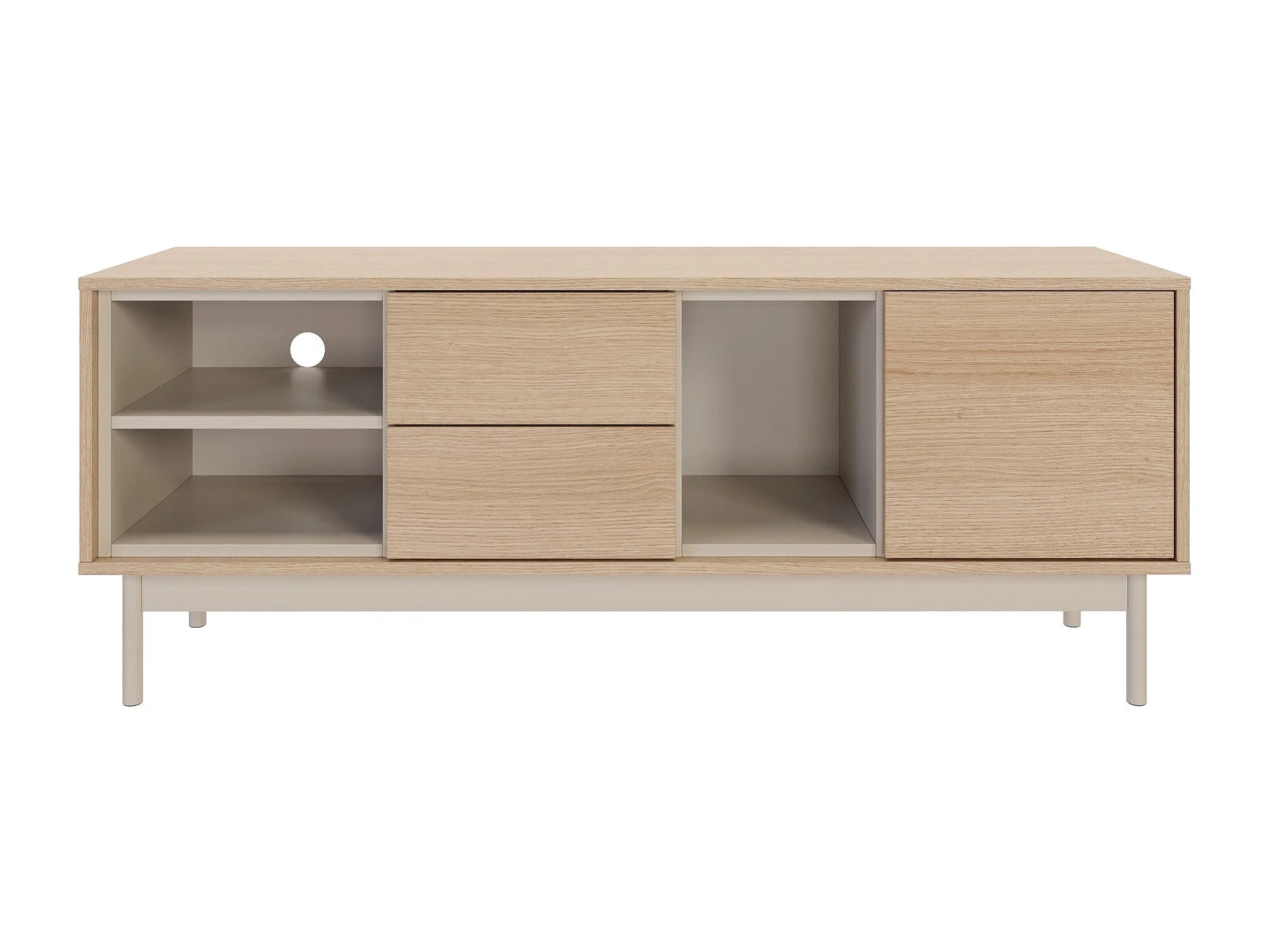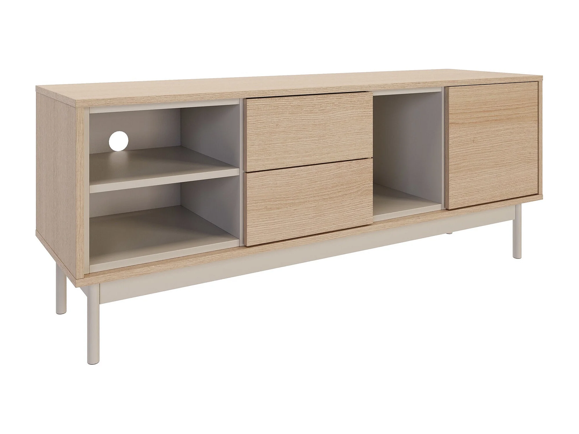 TV-Lowboard mit zwei Schubladen – drei offenen Fächern – Eichenholzoptik / Kaschmirgrau – LAYEN