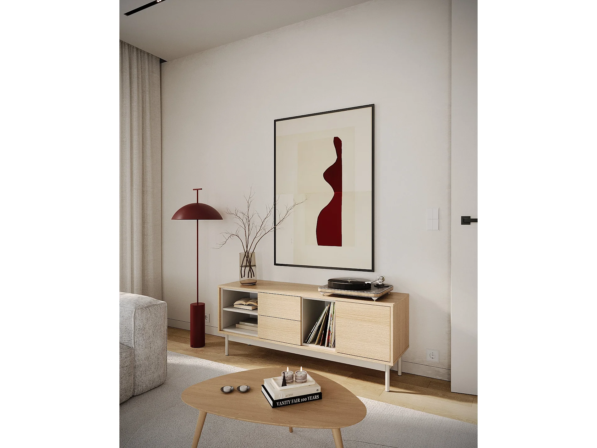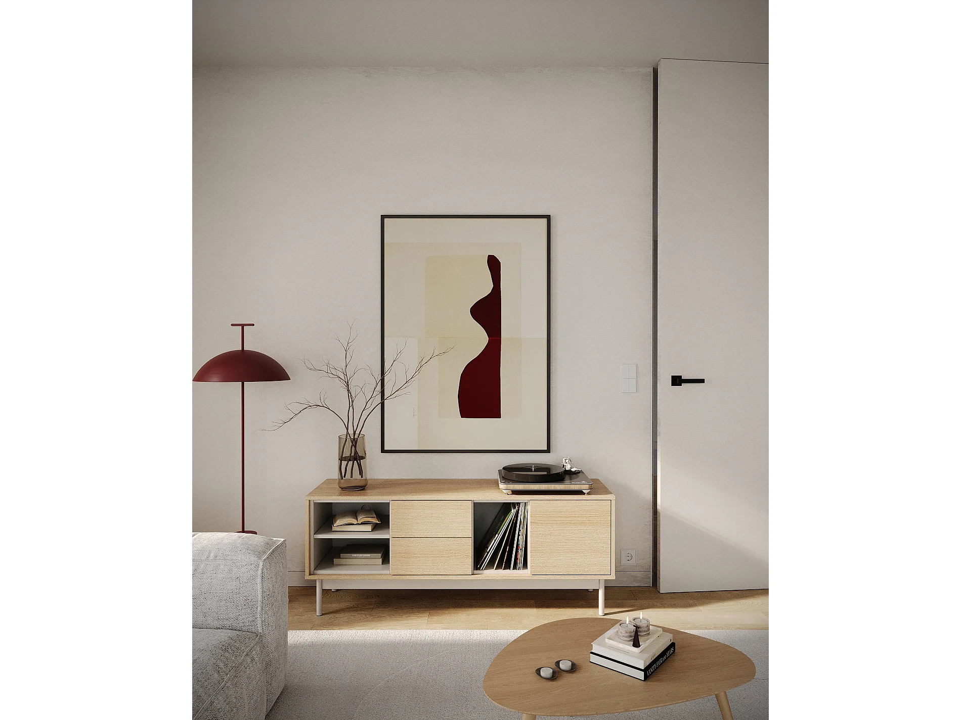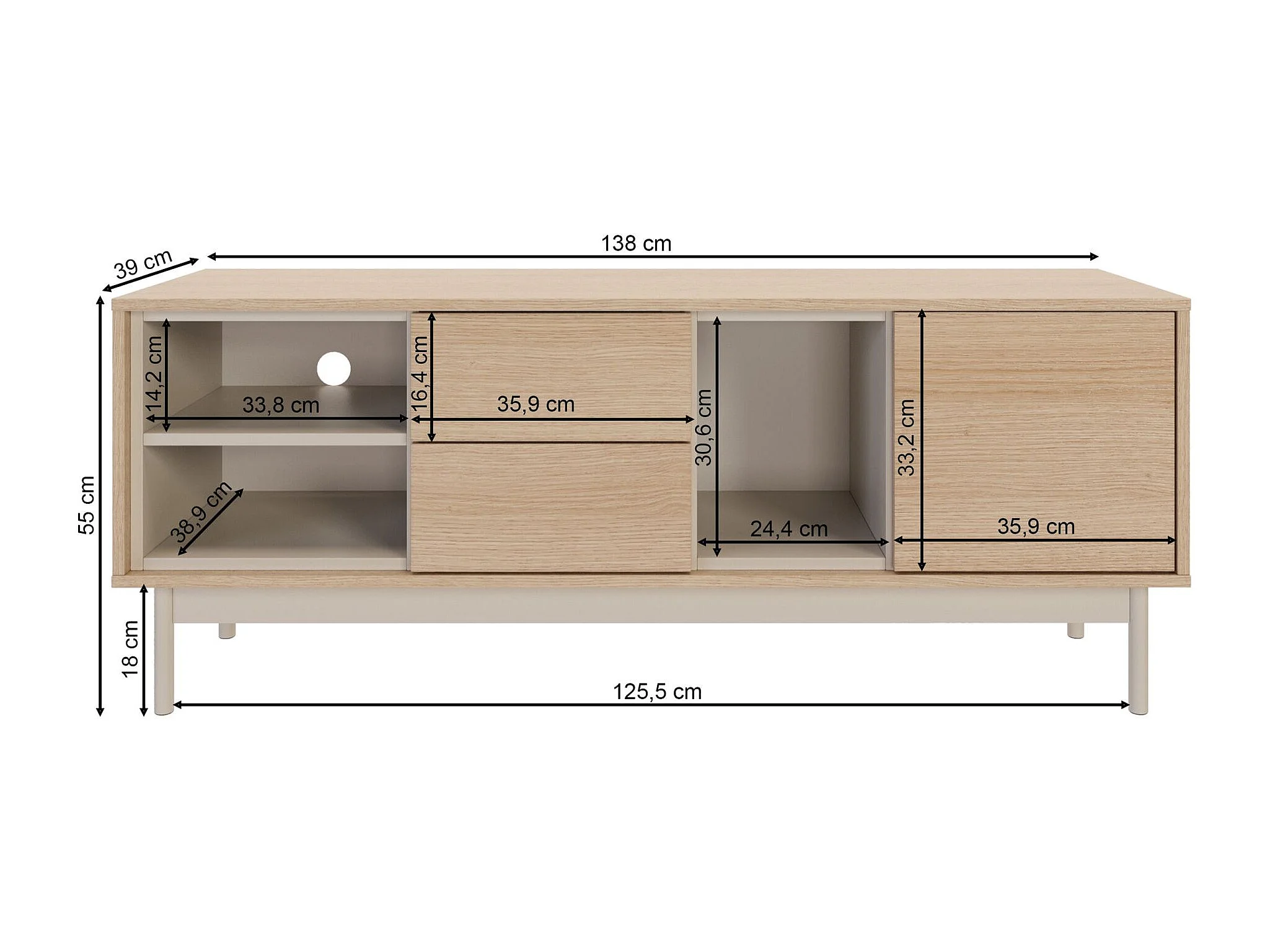 TV-Lowboard mit zwei Schubladen – drei offenen Fächern – Eichenholzoptik / Kaschmirgrau – LAYEN