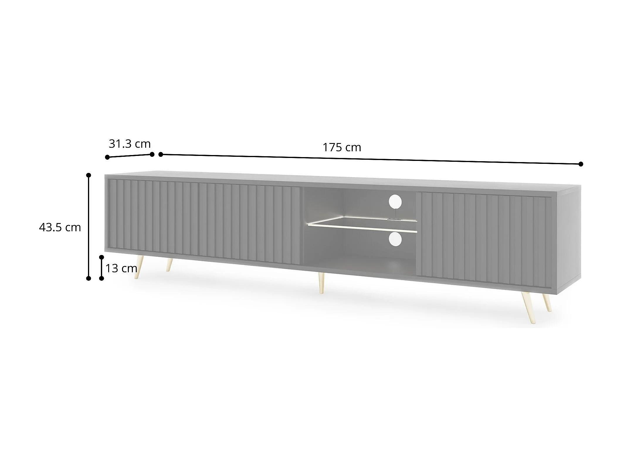 175 cm schwarzer LED-TV-Schrank mit Lamellenfronten und goldenen Beinen – Selsey Bello