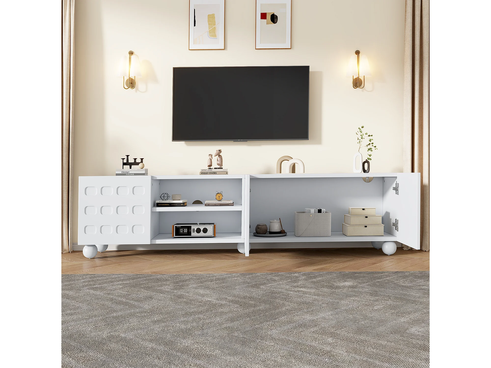 TV-Möbel fürs Wohnzimmer – 200 x 40 x 44 cm – mit 3 dekorativen Türen + Ablage – für 1-Zoll-Fernseher – Spanplatte – weiß