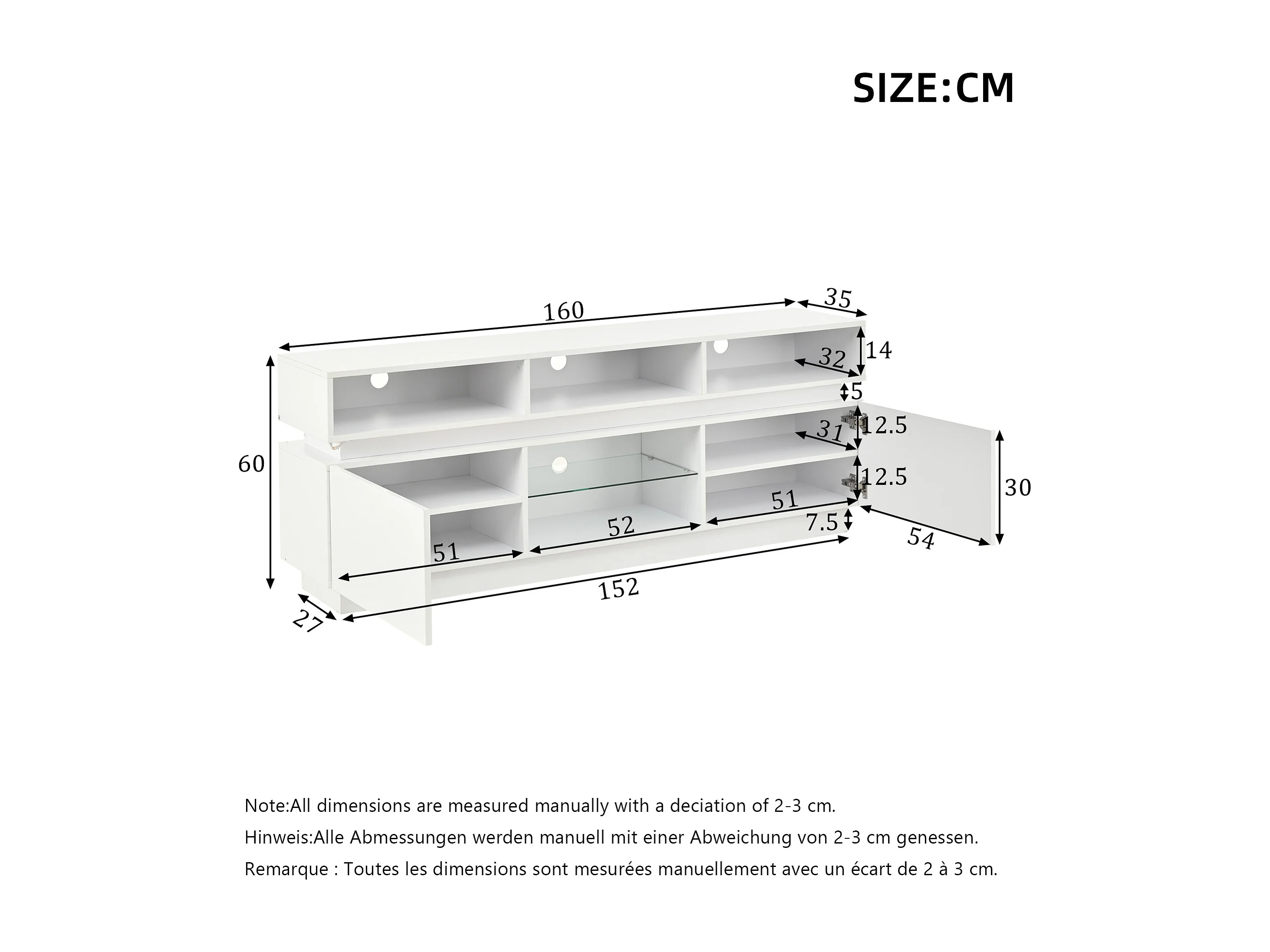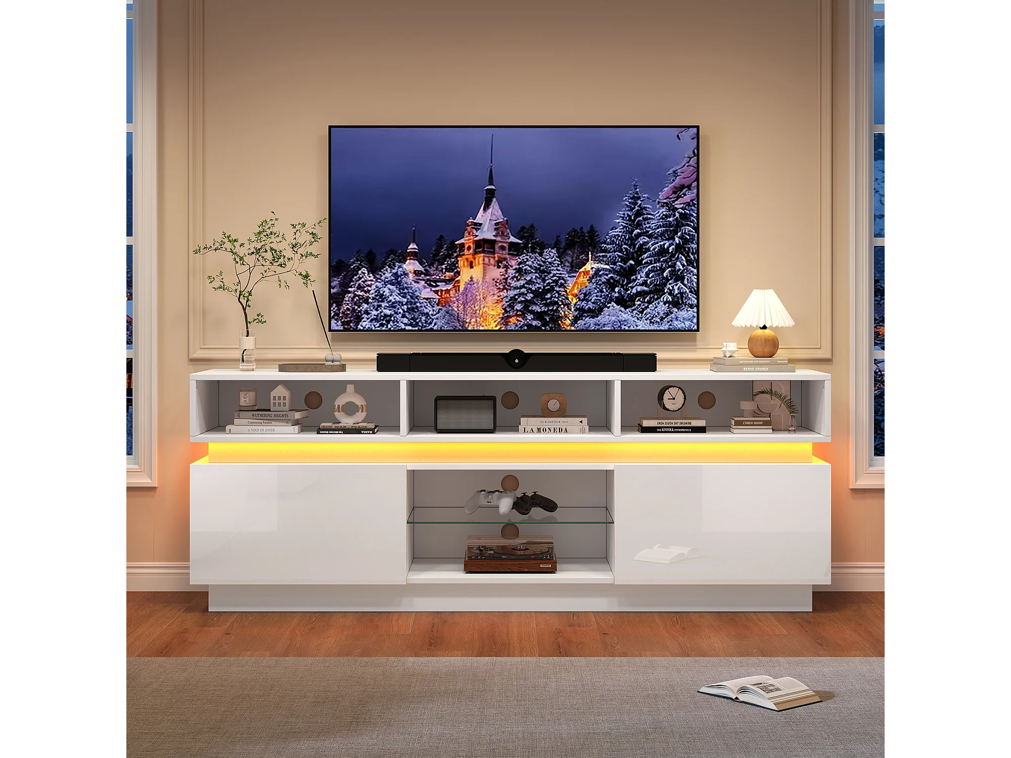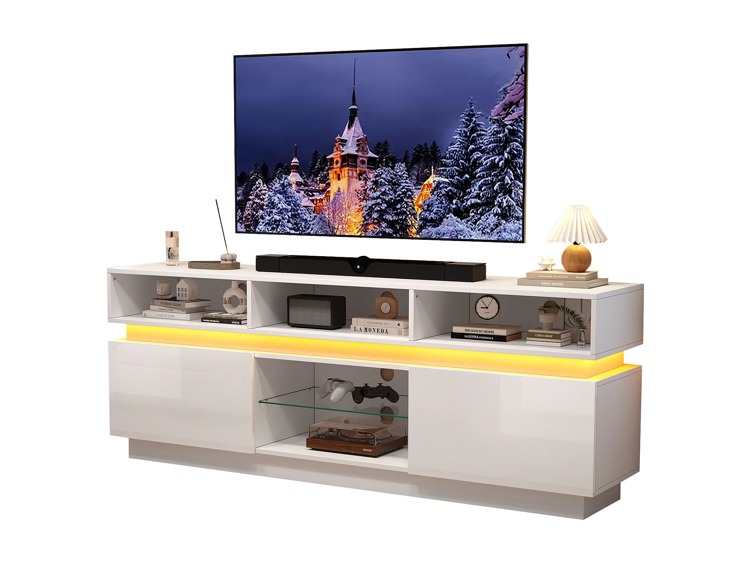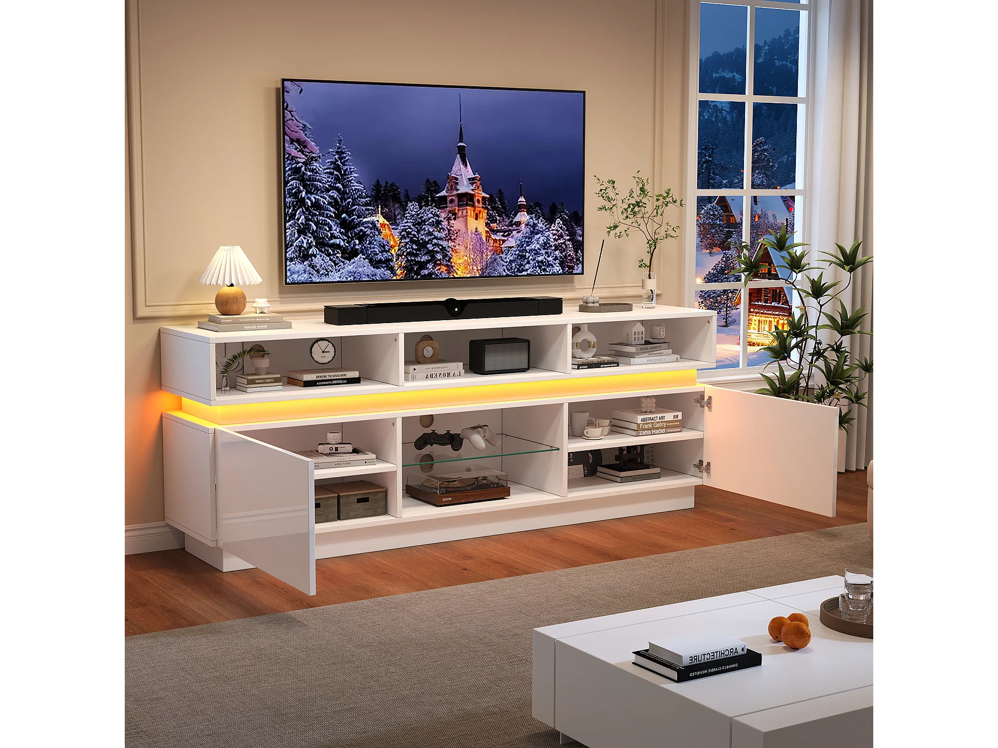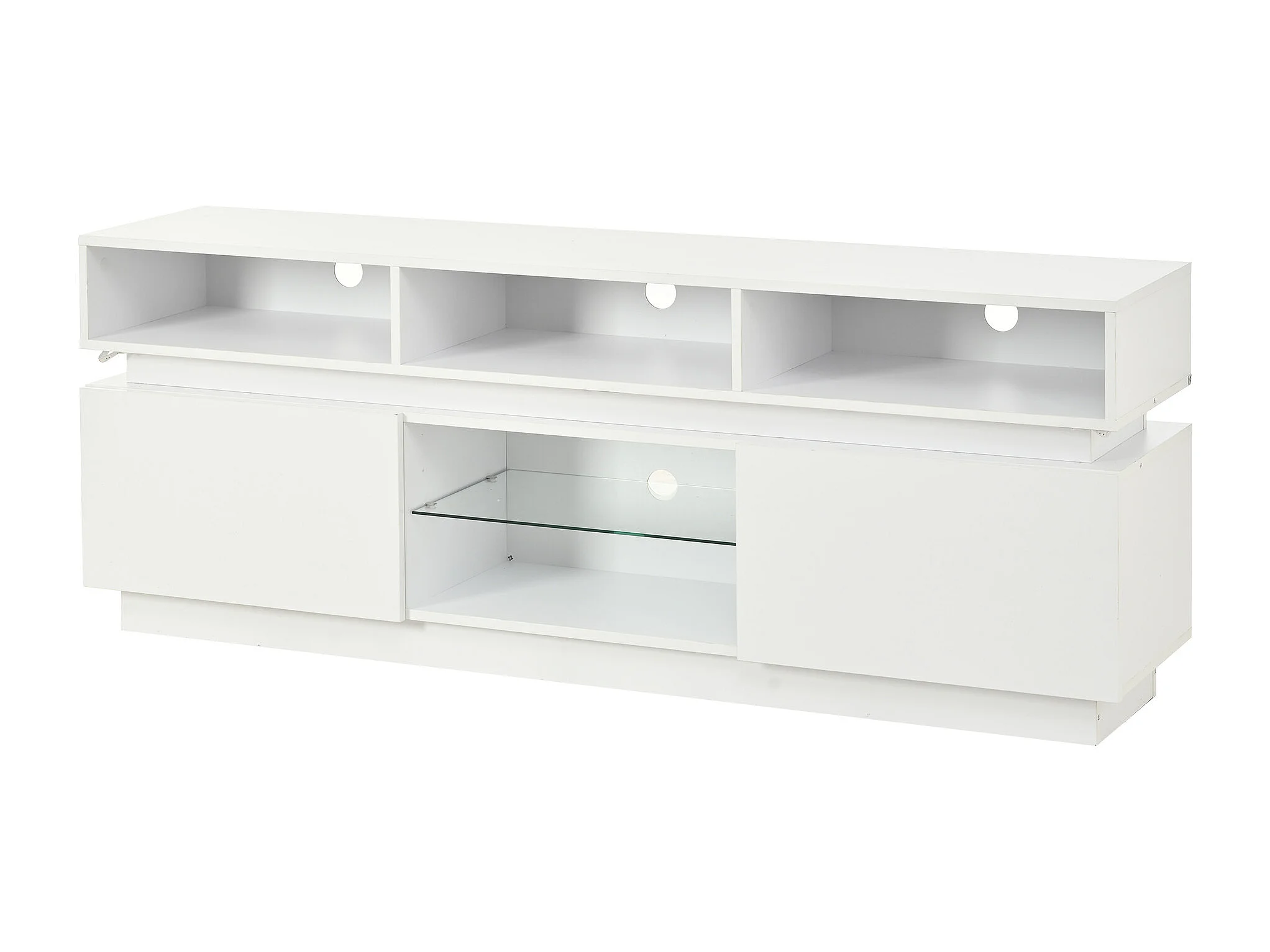 TV-Schrank 160x35x60cm mit LED-Beleuchtung - 2 Türen und Staufächer - Hochglanz-Finish - MDF - Weiß