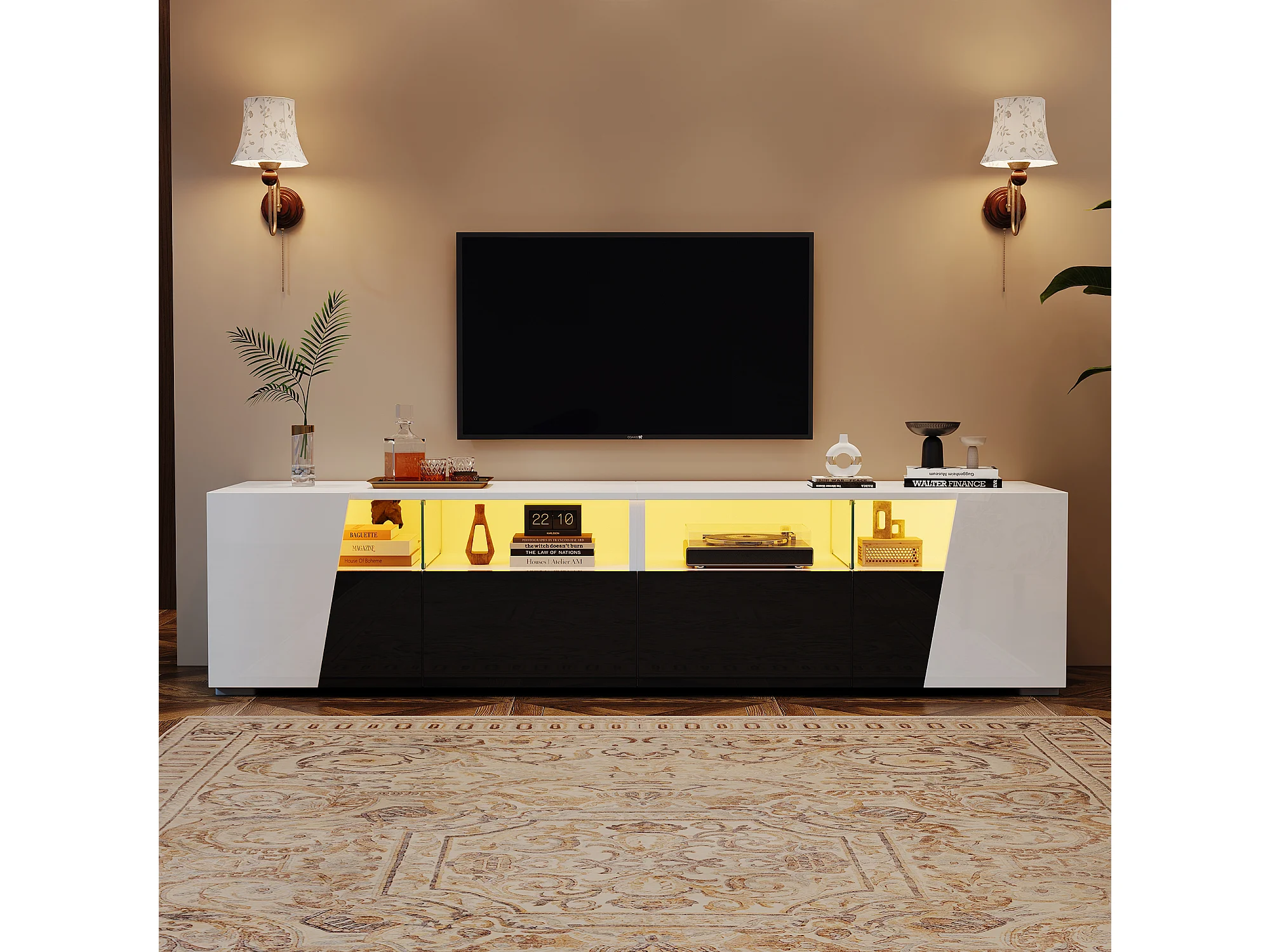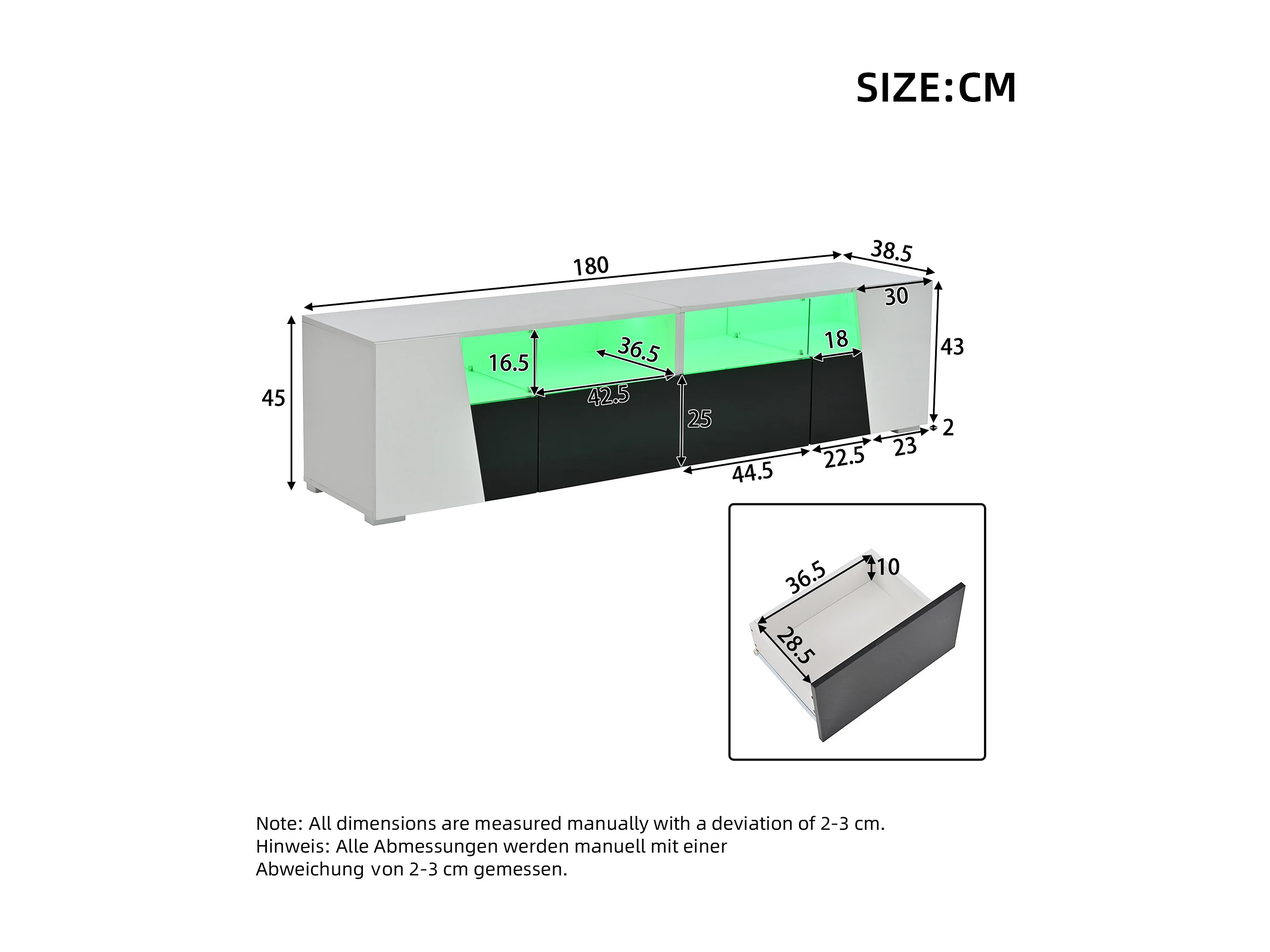 TV-Schrank 180x38,5x45 cm - mit LED-Beleuchtung - 2 Schubladen und 2 Türen - Offene Ablagefächer - Hochglanzfinish - Weiß + schwarz