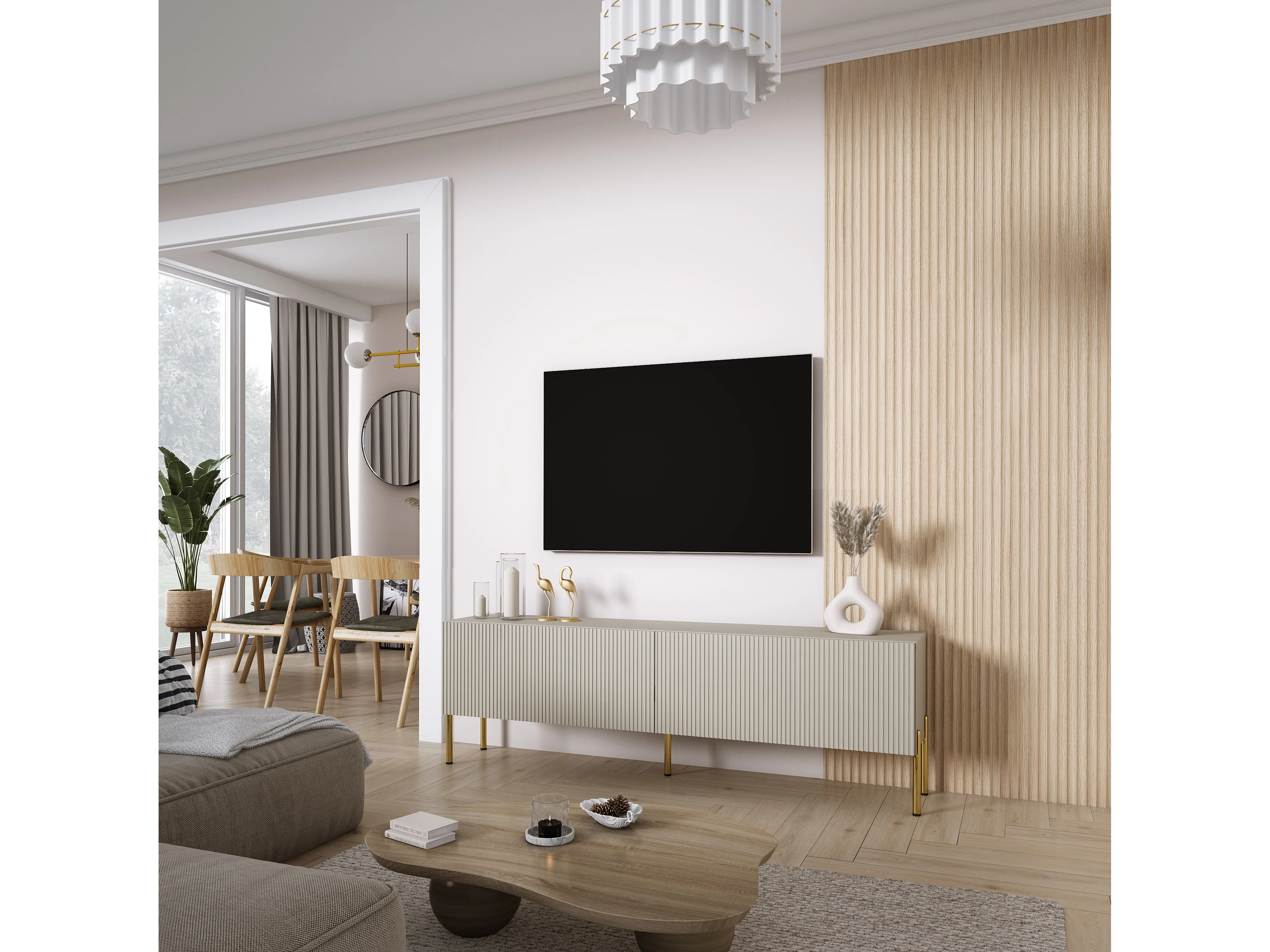 TV-Schrank mit geriffelte Fronten, Kaschmir, gerade goldene Beine, 170 × 32 × 52 cm