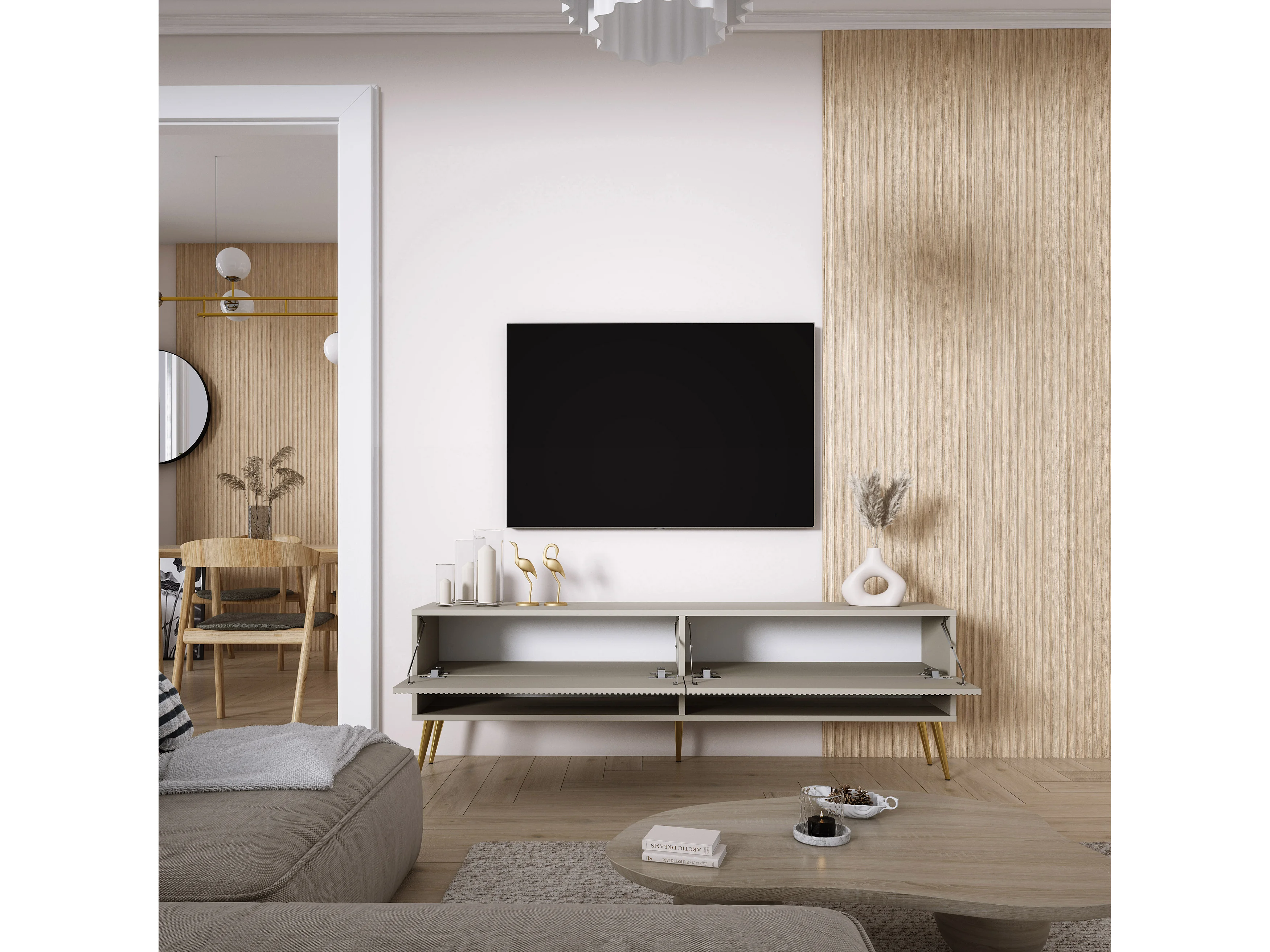 TV-Schrank mit geriffelte Fronten, Kaschmir, goldfarbene, schräge Beine, 170 × 32 × 52 cm