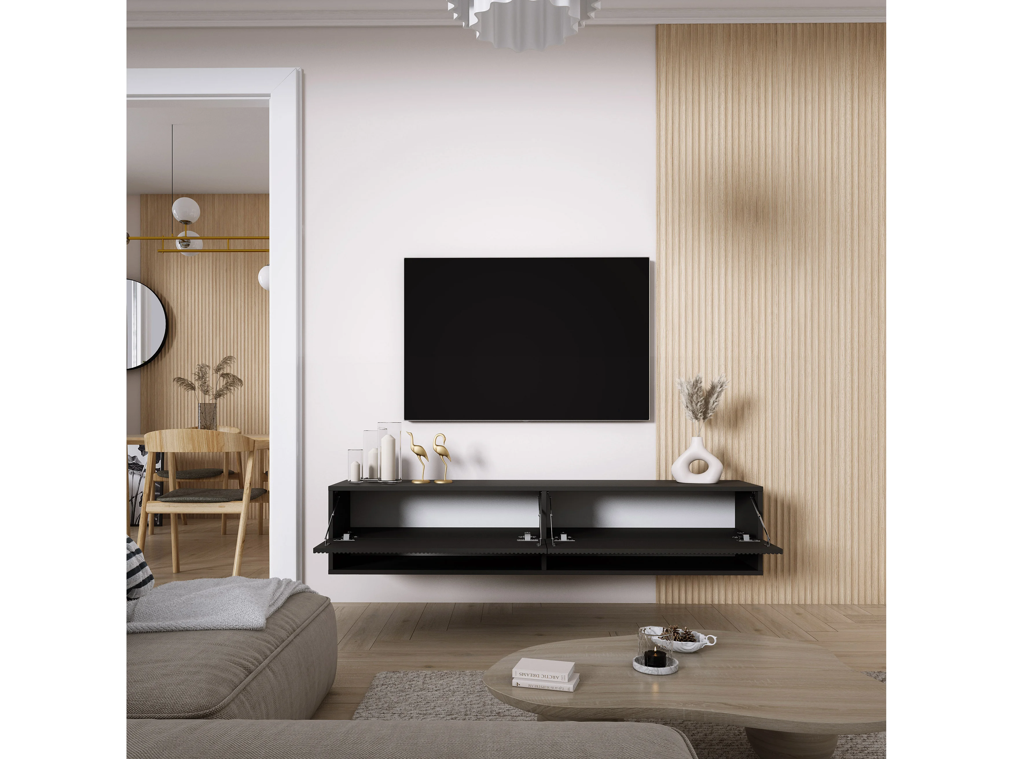 TV-Schrank mit geriffelte Fronten, Mattschwarz, 170 × 32 × 33,6 cm