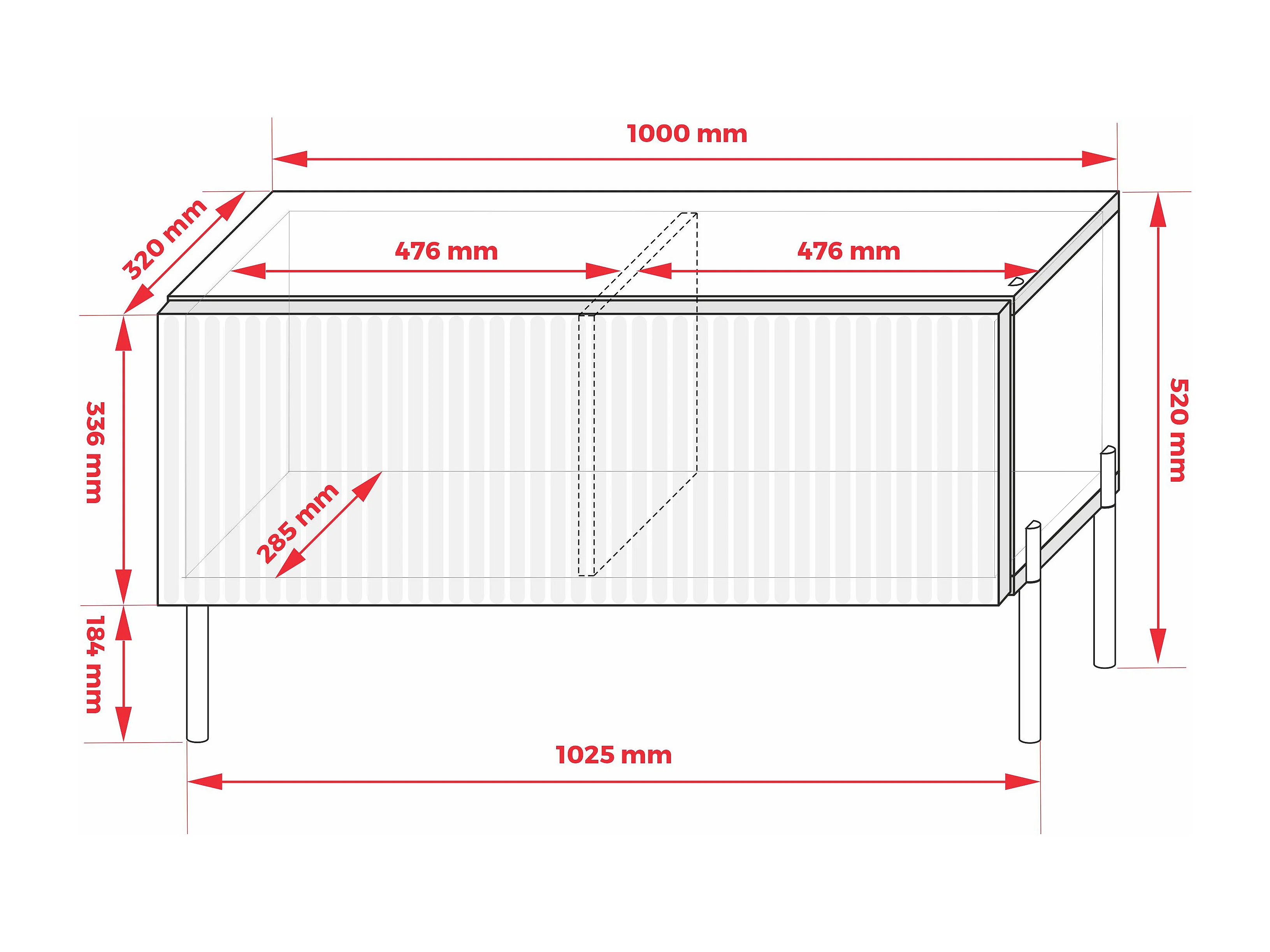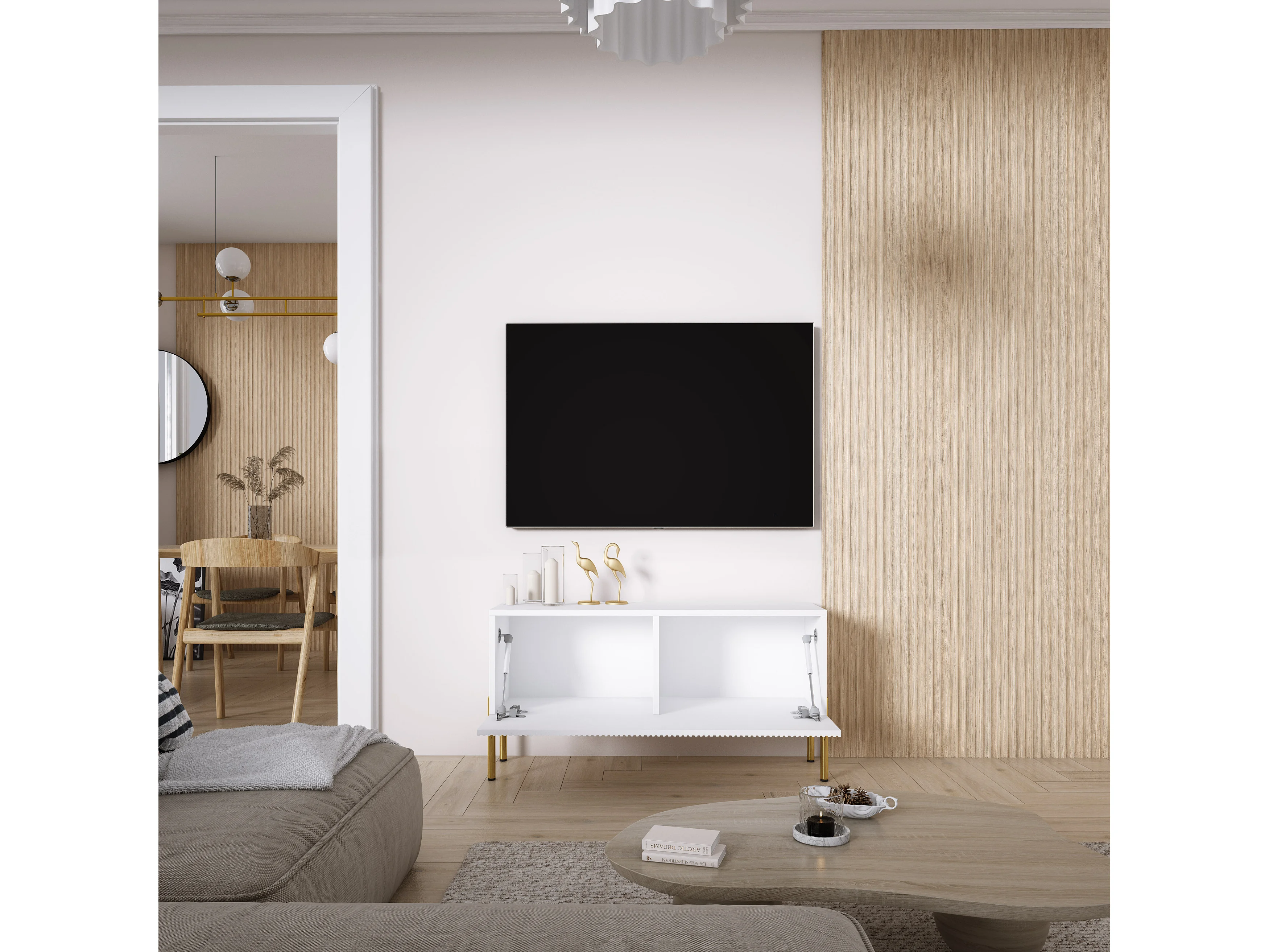 TV-Schrank mit geriffelter Front, Mattweiß, gerade goldene Beine, 100 × 32 × 52 cm