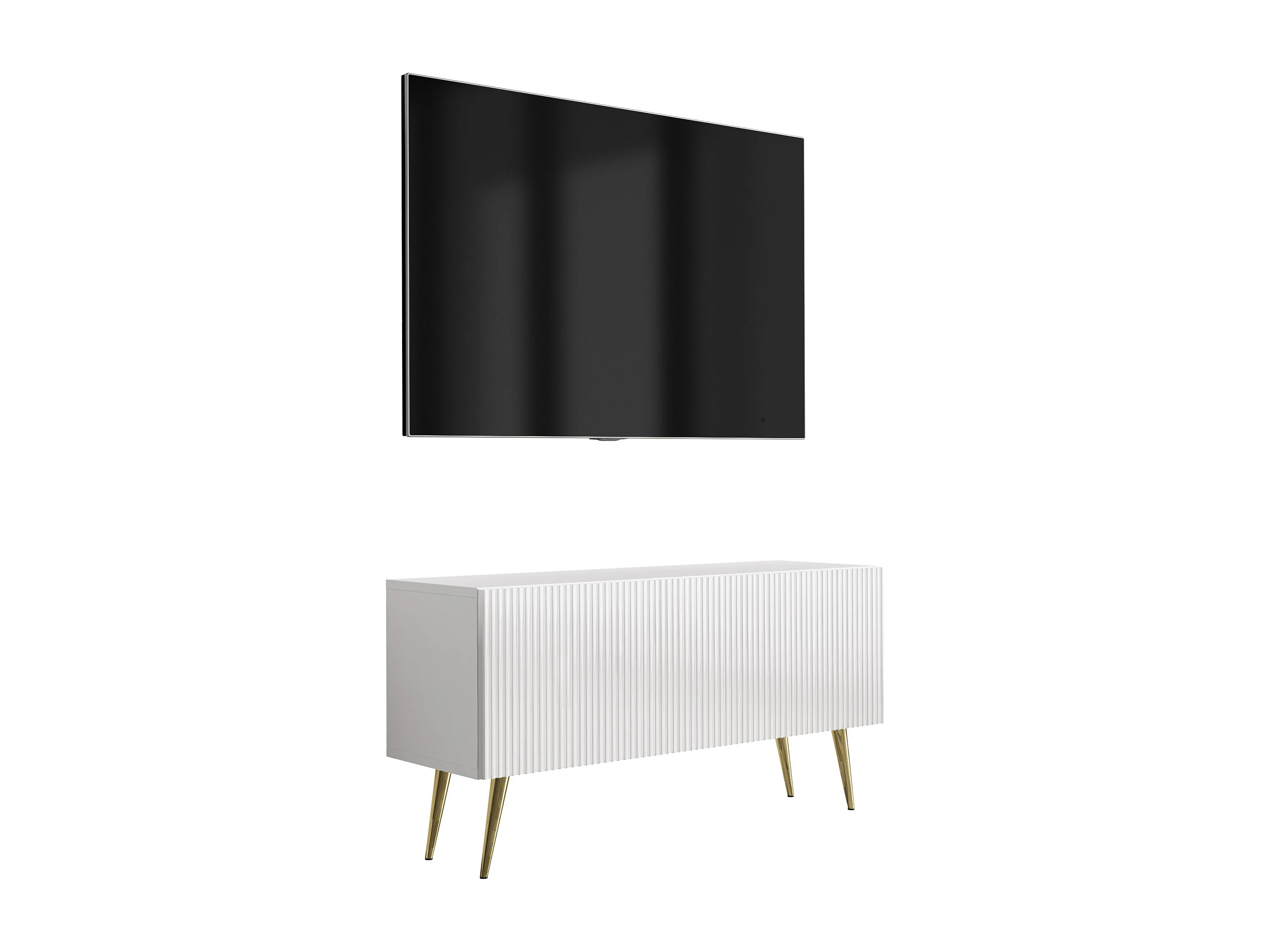 TV-Schrank mit geriffelter Front, Mattweiß, goldfarbene, schräge Beine, 100 × 32 × 52 cm