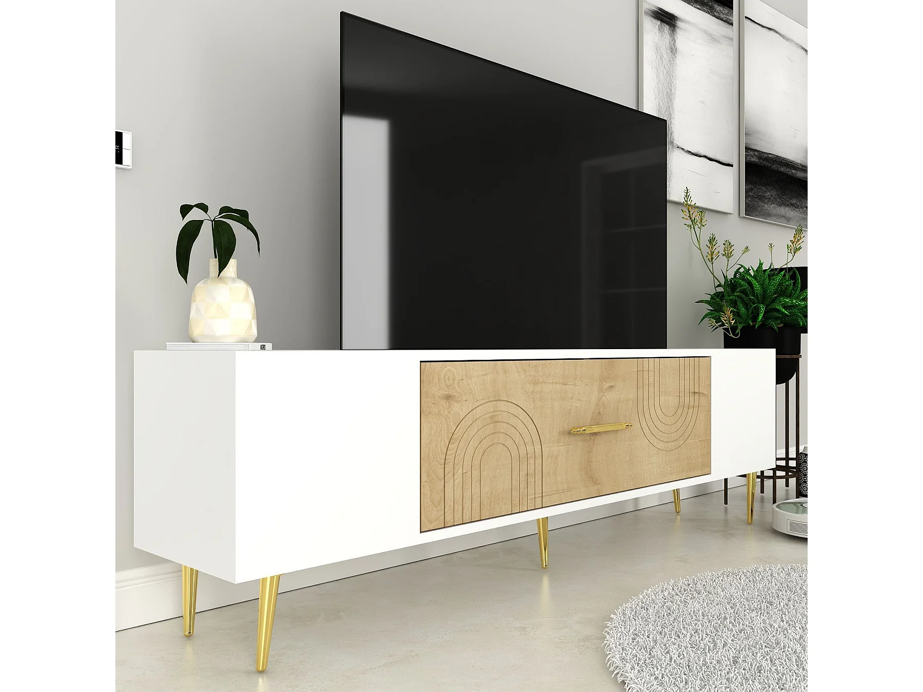 TV-Ständer – 150 cm x 48,2 cm x 29,6 cm – Saphir-Eiche, Weiß und Gold – Melaminbeschichtete Spanplatte