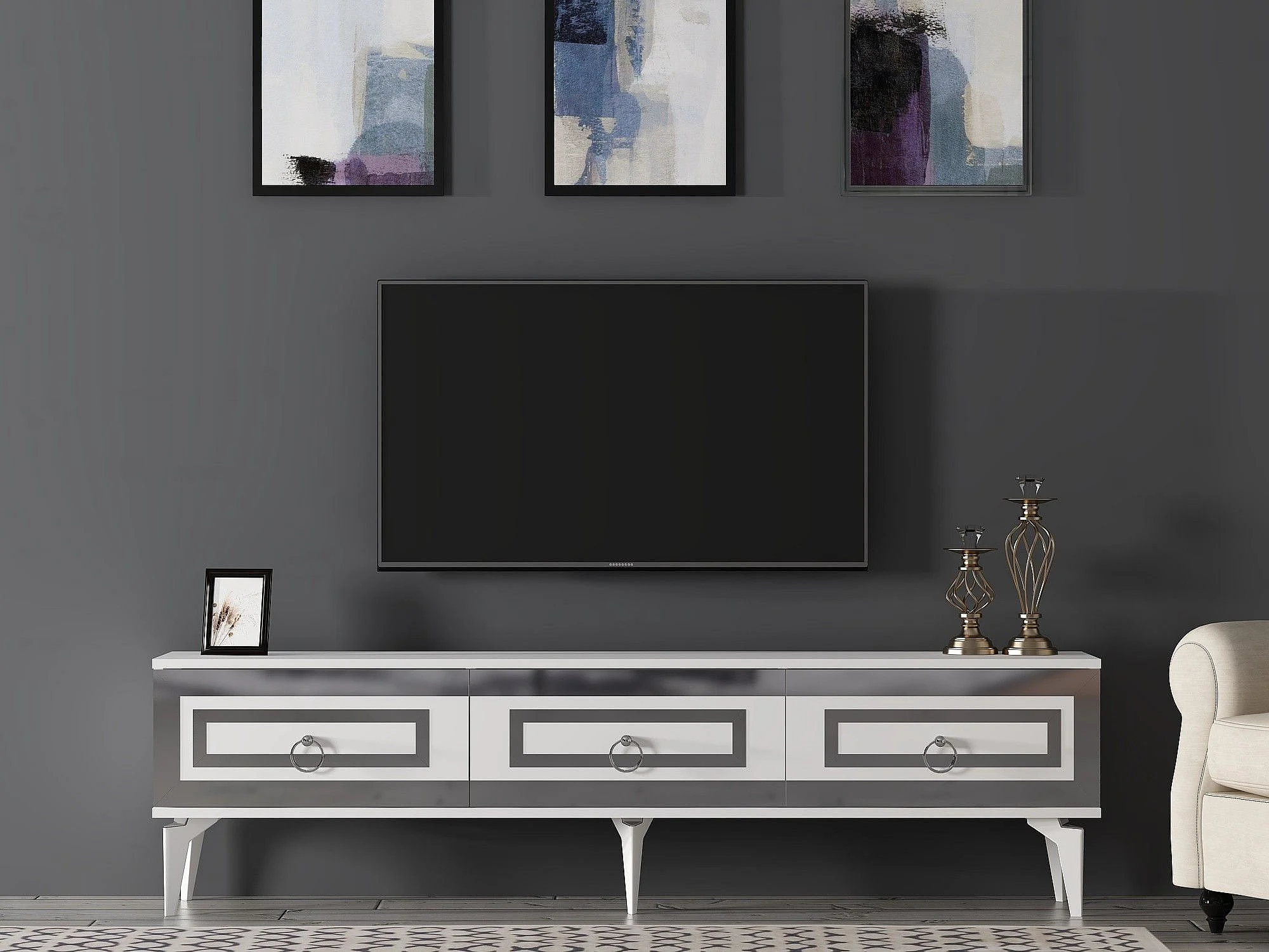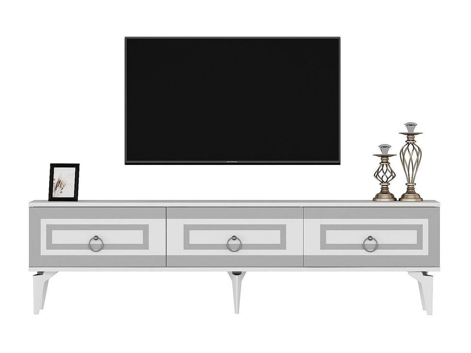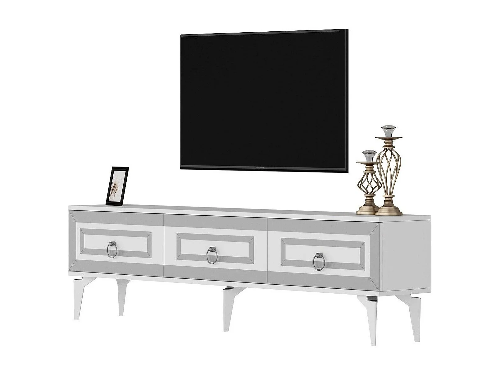 TV-Ständer – 180 cm x 29,6 cm x 44,6 cm – Weiß und Silber – Melaminbeschichtete Spanplatte