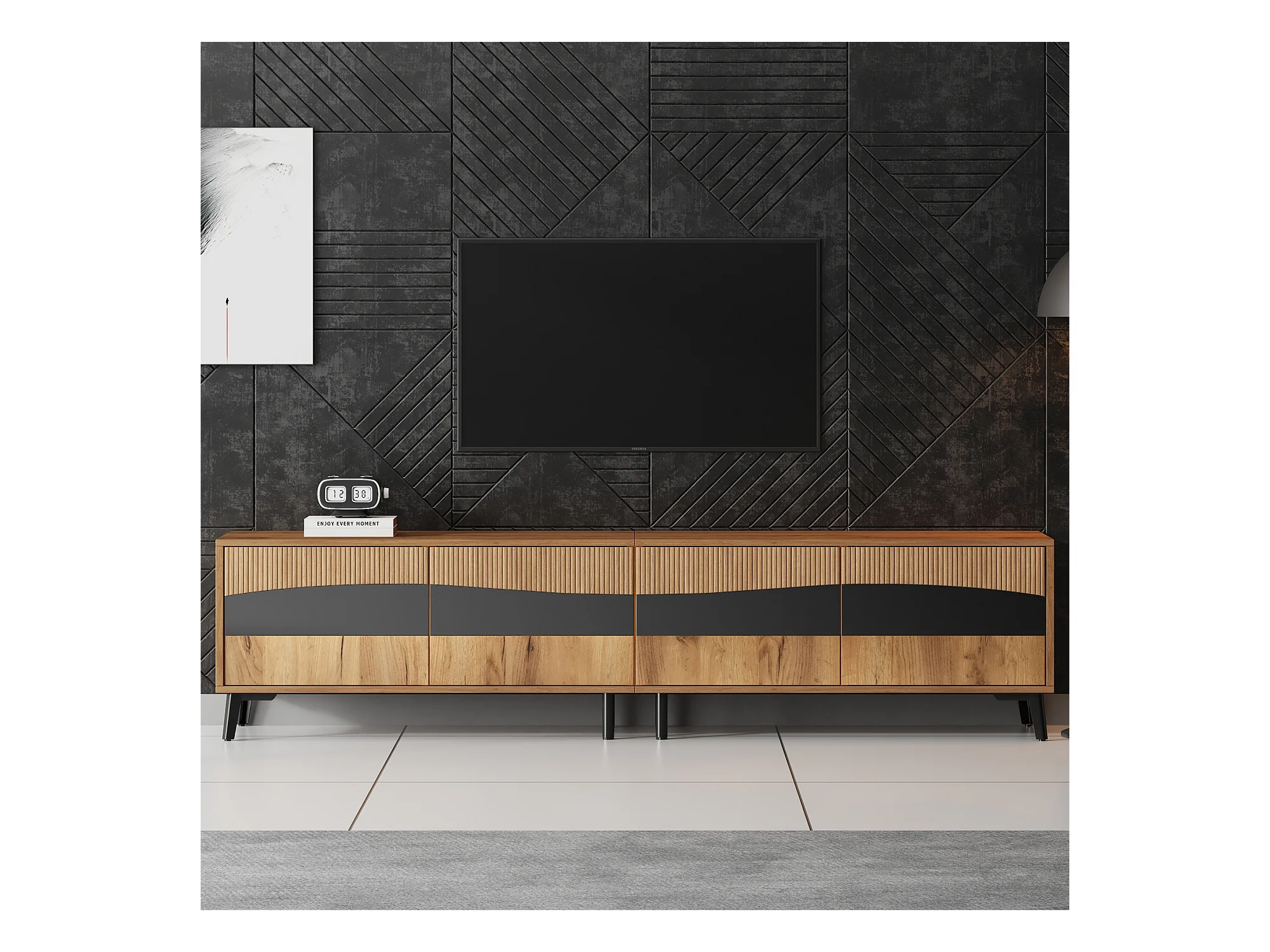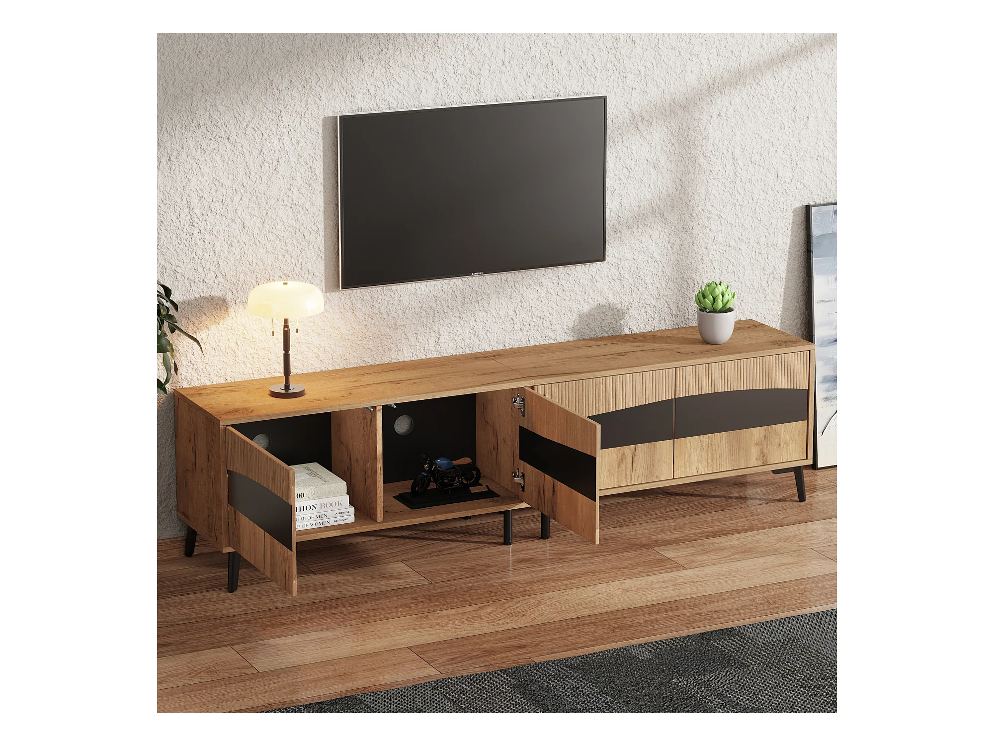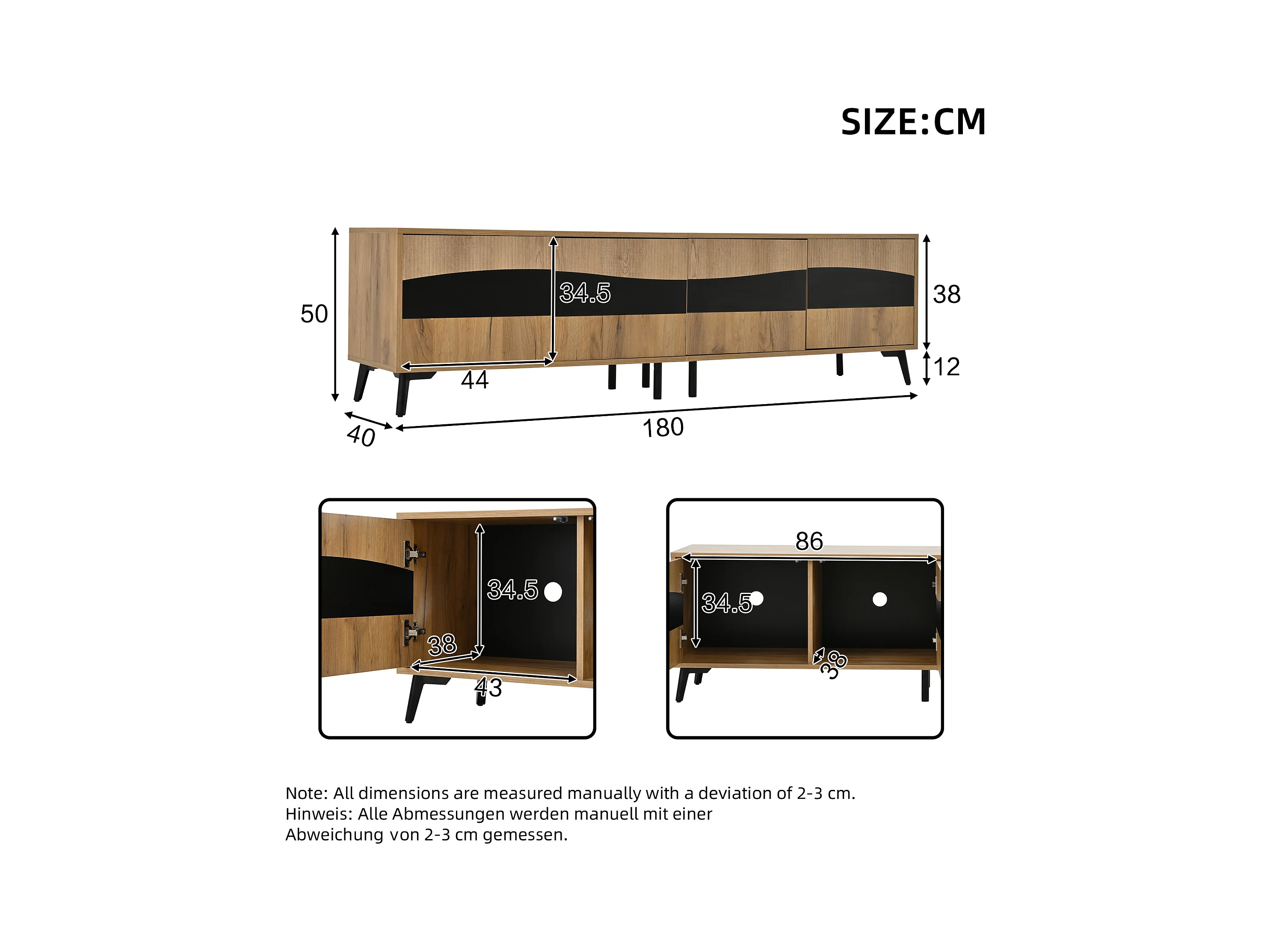 TV-Ständer aus Holz und Schwarz – Fernsehschrank mit 4 Türen und 8 Beinen – Passend für Fernseher bis zu 75 Zoll