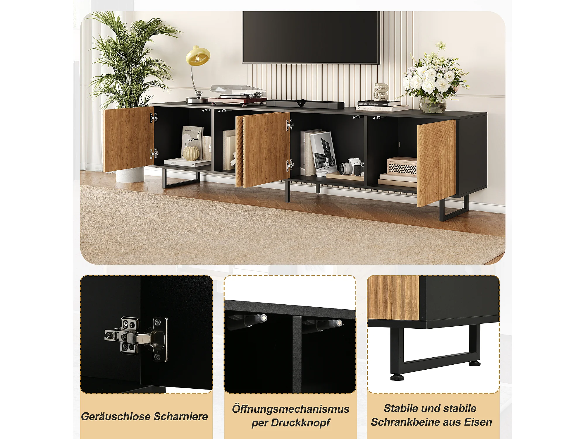 Moderner TV-Ständer – 179 x 35 x 53,5 cm – einzigartiges Design – mit 4 Türen – Spanplatte – schwarz + natur
