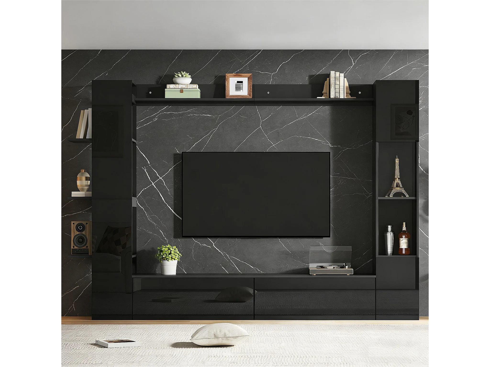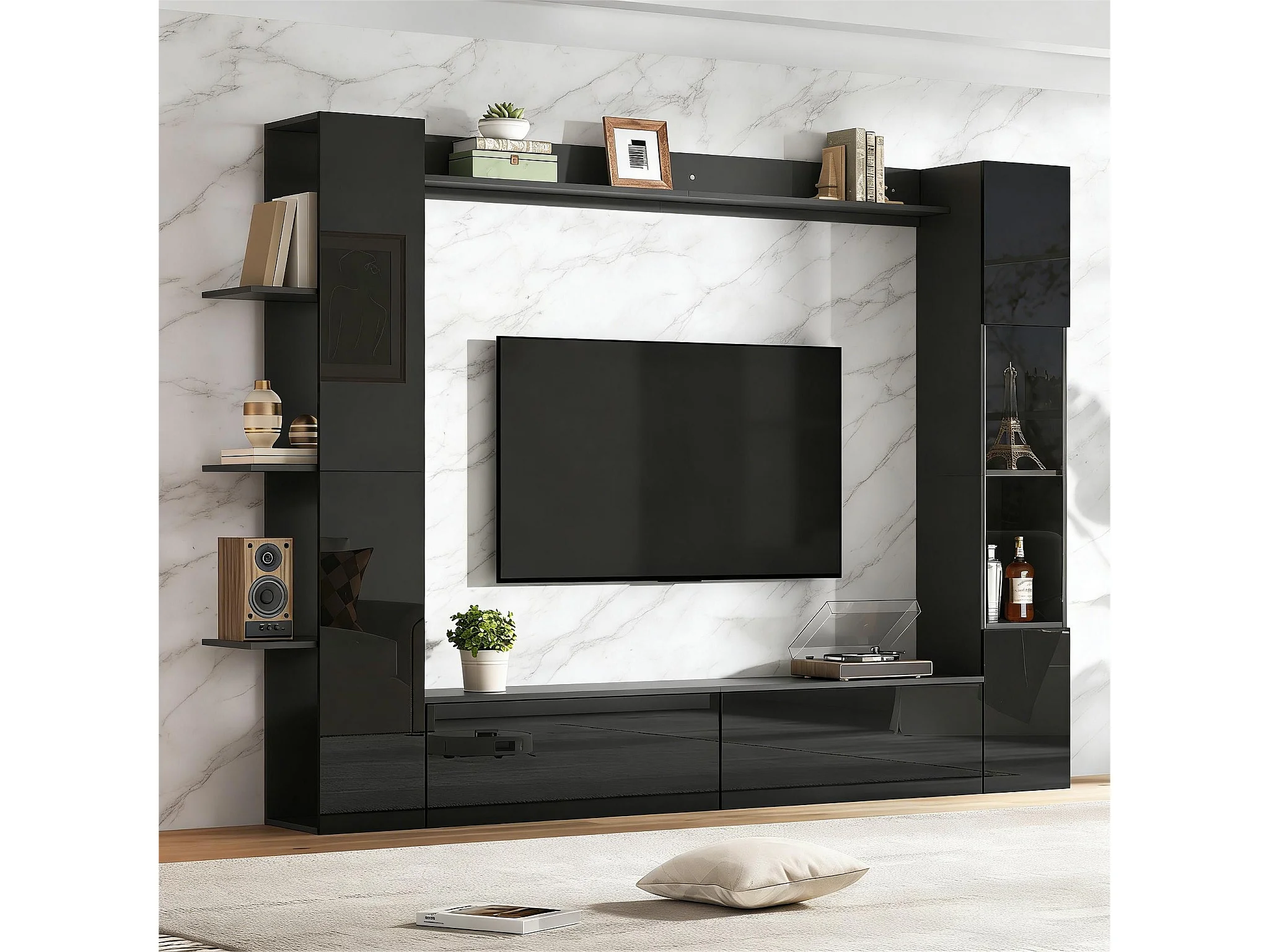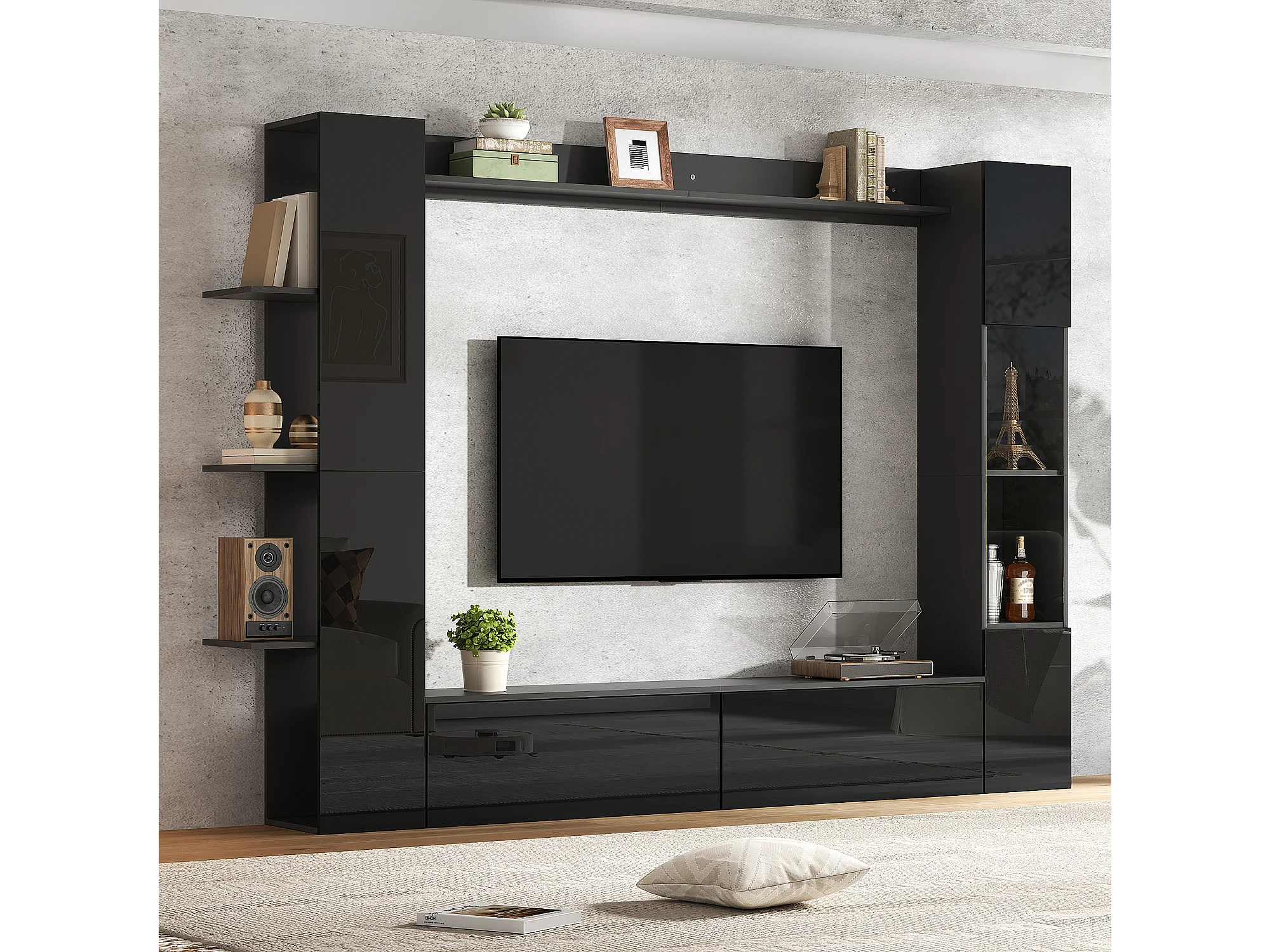 TV-Wandmöbel fürs Wohnzimmer (4-teilig) – 228 x 30 x 170 cm – mit TV-Ständer, Vitrine und Ablagefächern – Spanplatte – schwarz