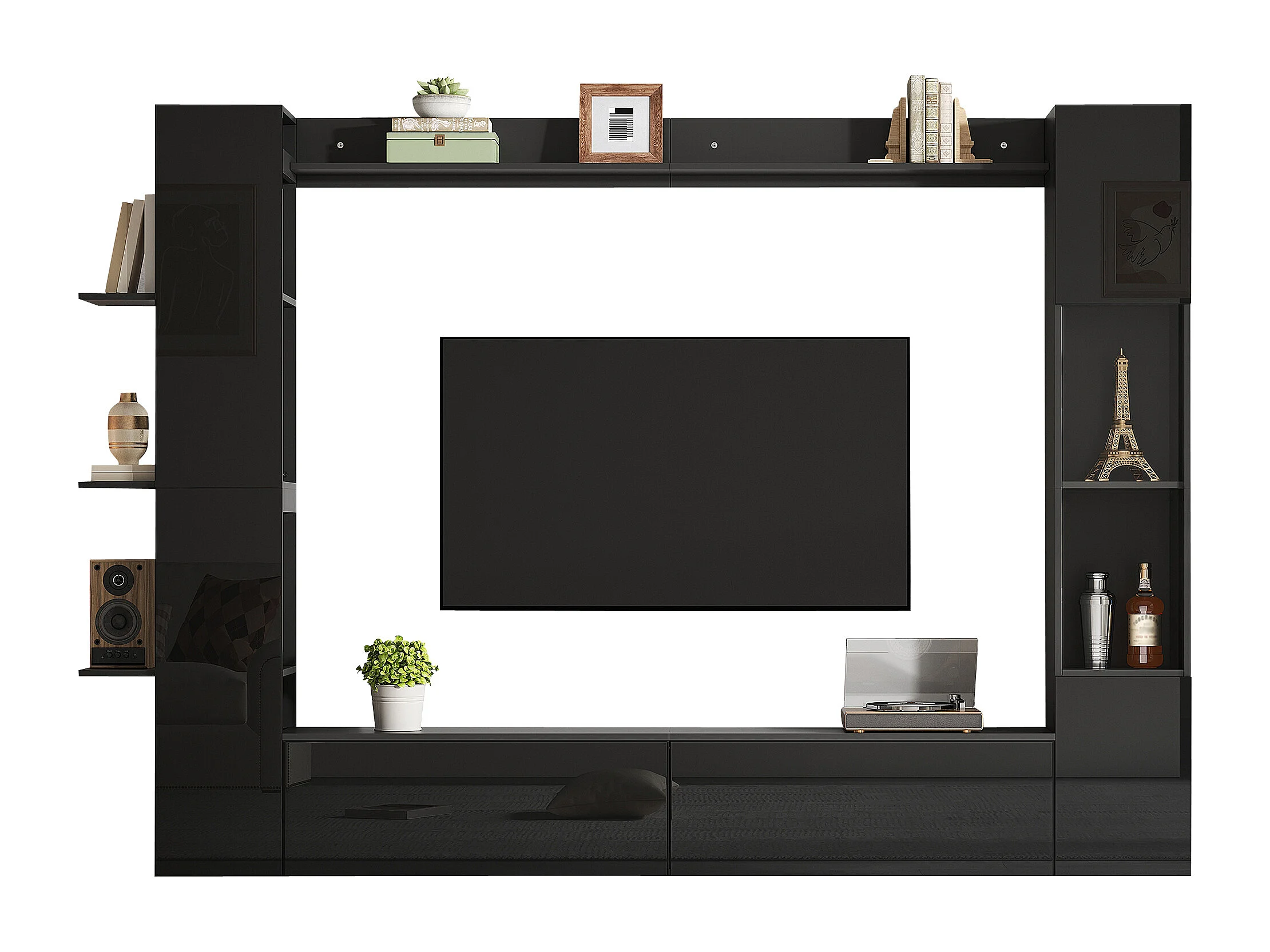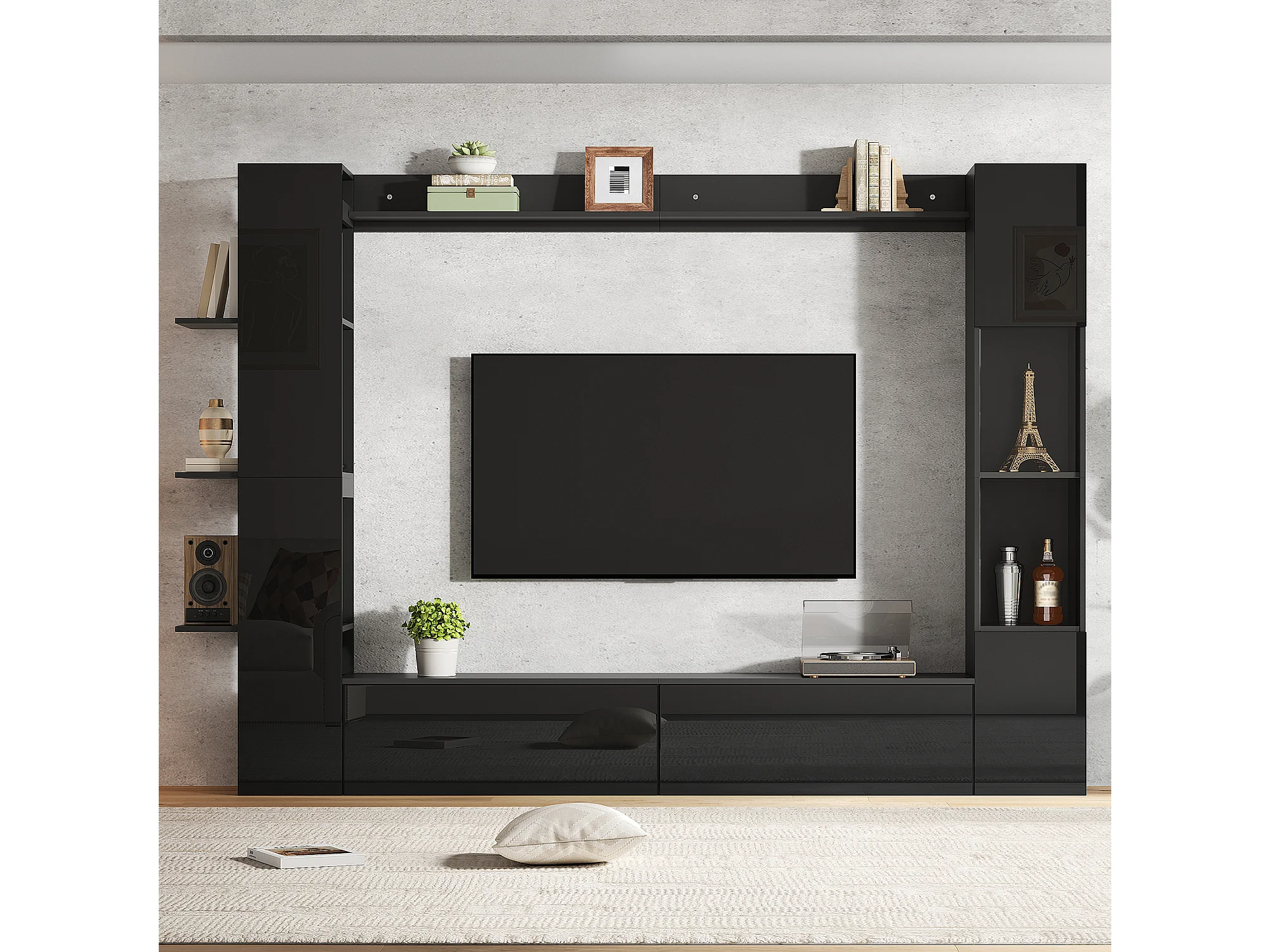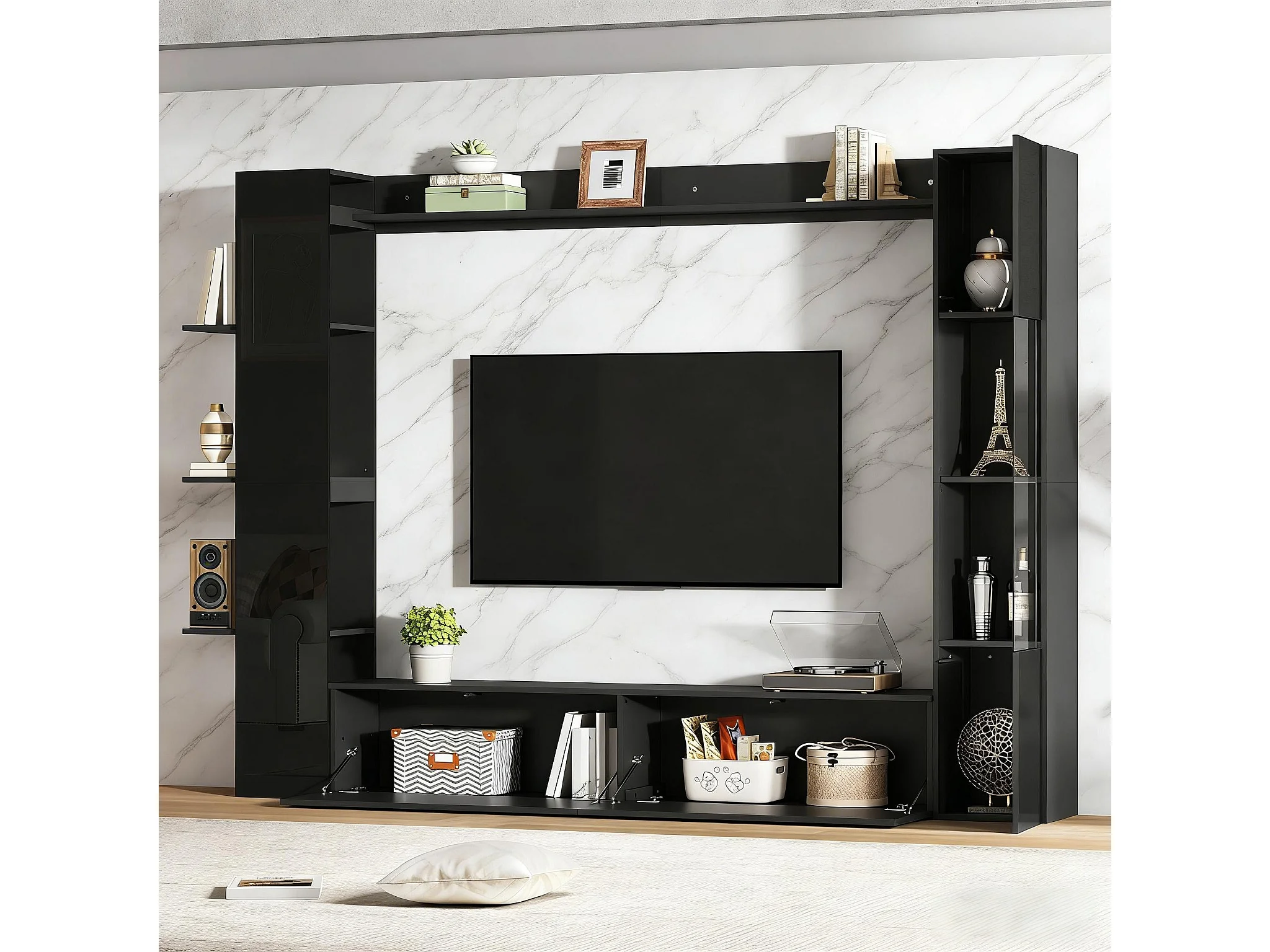 TV-Wandmöbel fürs Wohnzimmer (4-teilig) – 228 x 30 x 170 cm – mit TV-Ständer, Vitrine und Ablagefächern – Spanplatte – schwarz