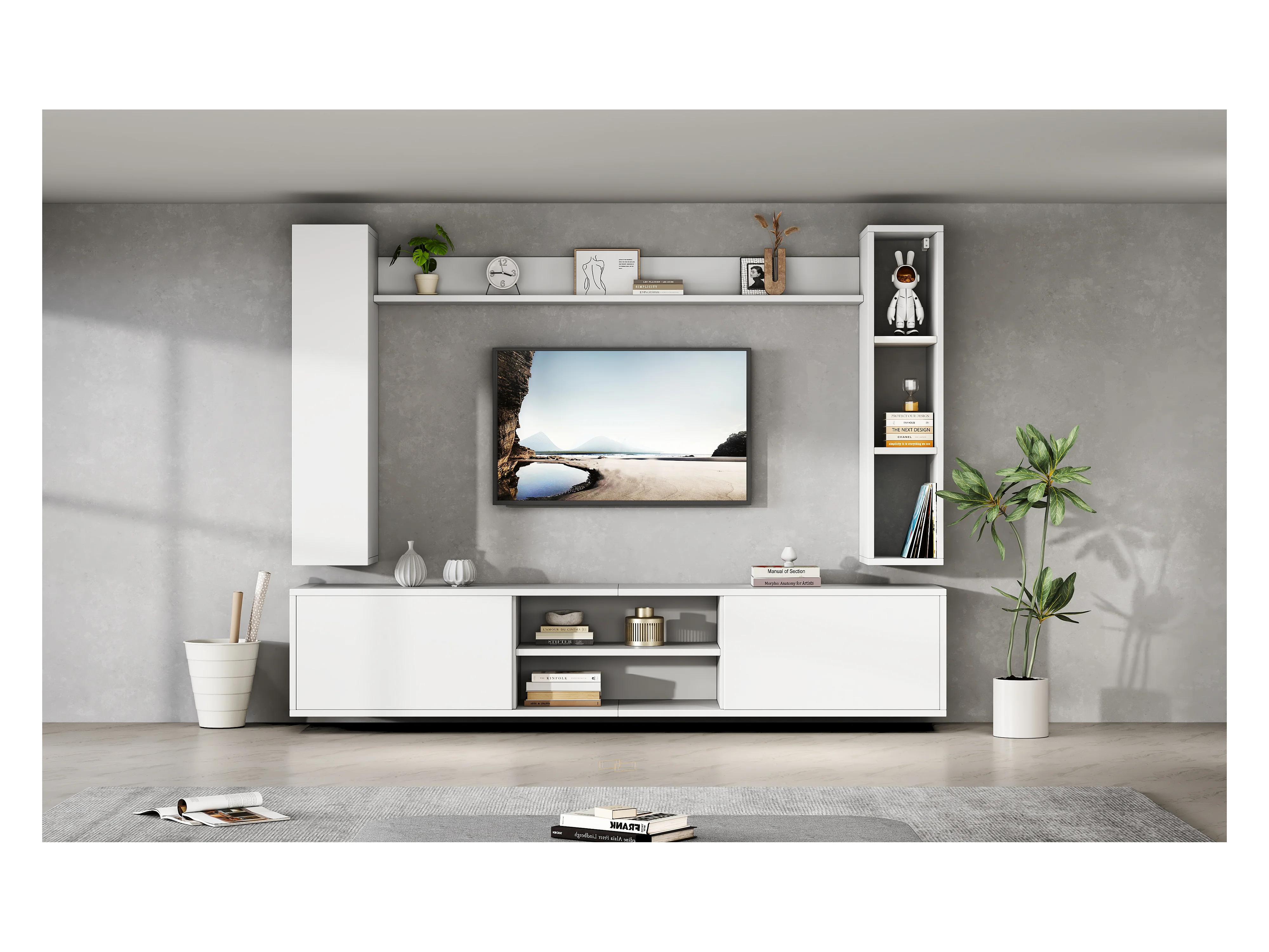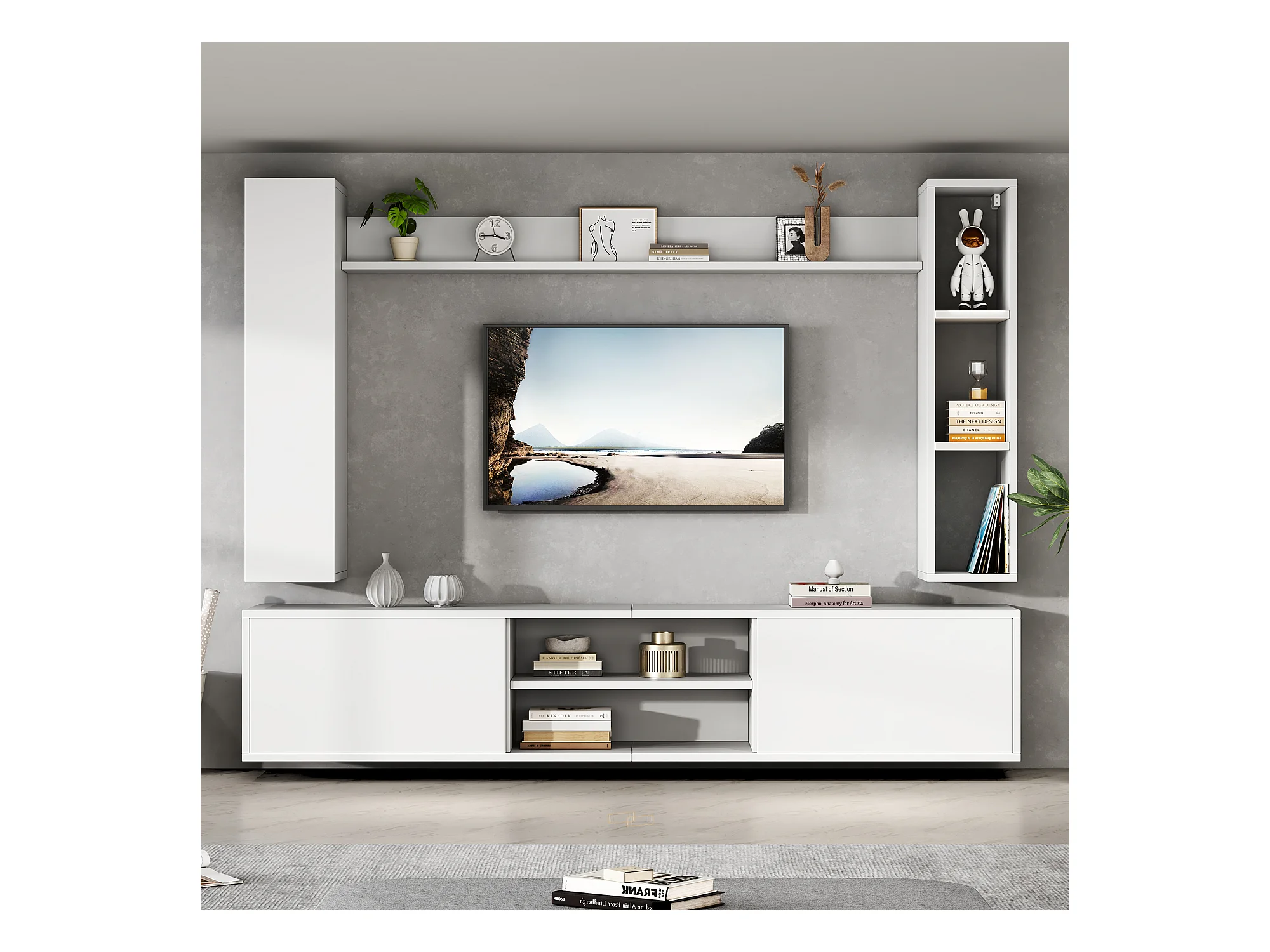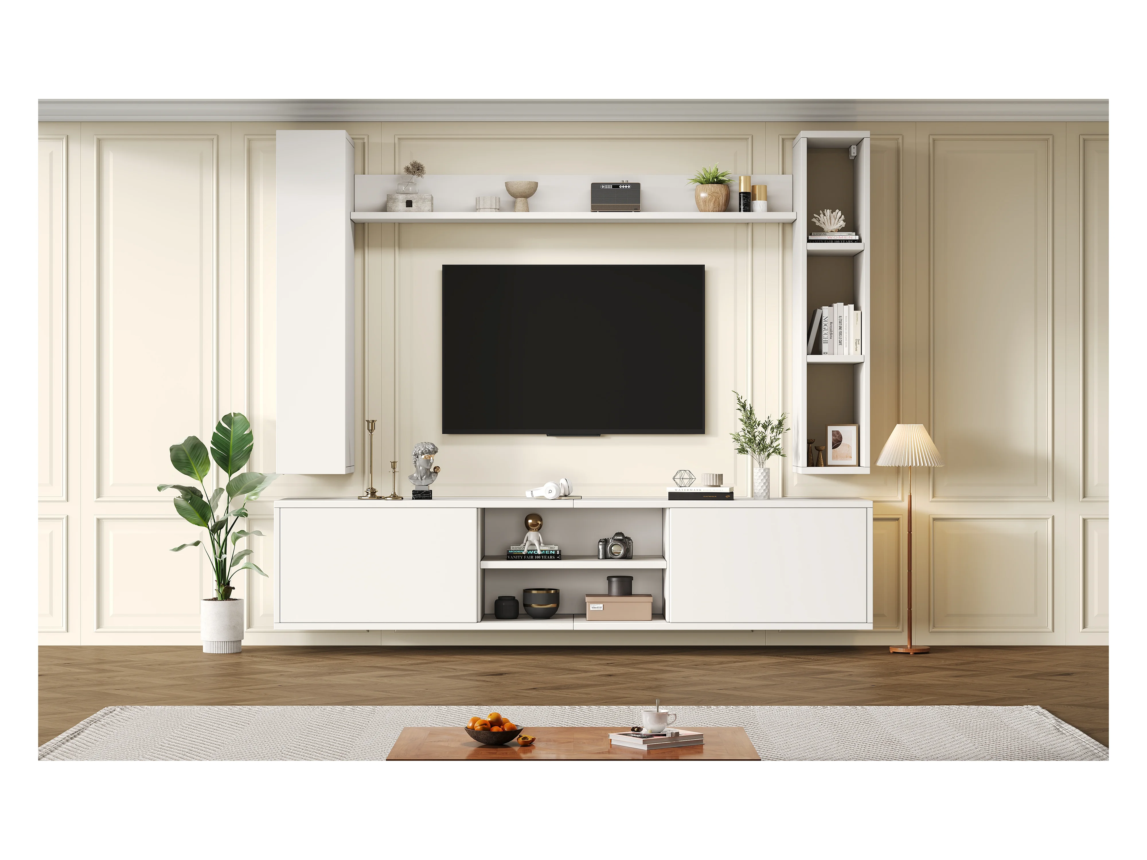 TV-Wandschrank-Set - 180 x 35 x 123,5 cm - mit Standregal und 2 Wandregalen - Spanplatte - Weiß