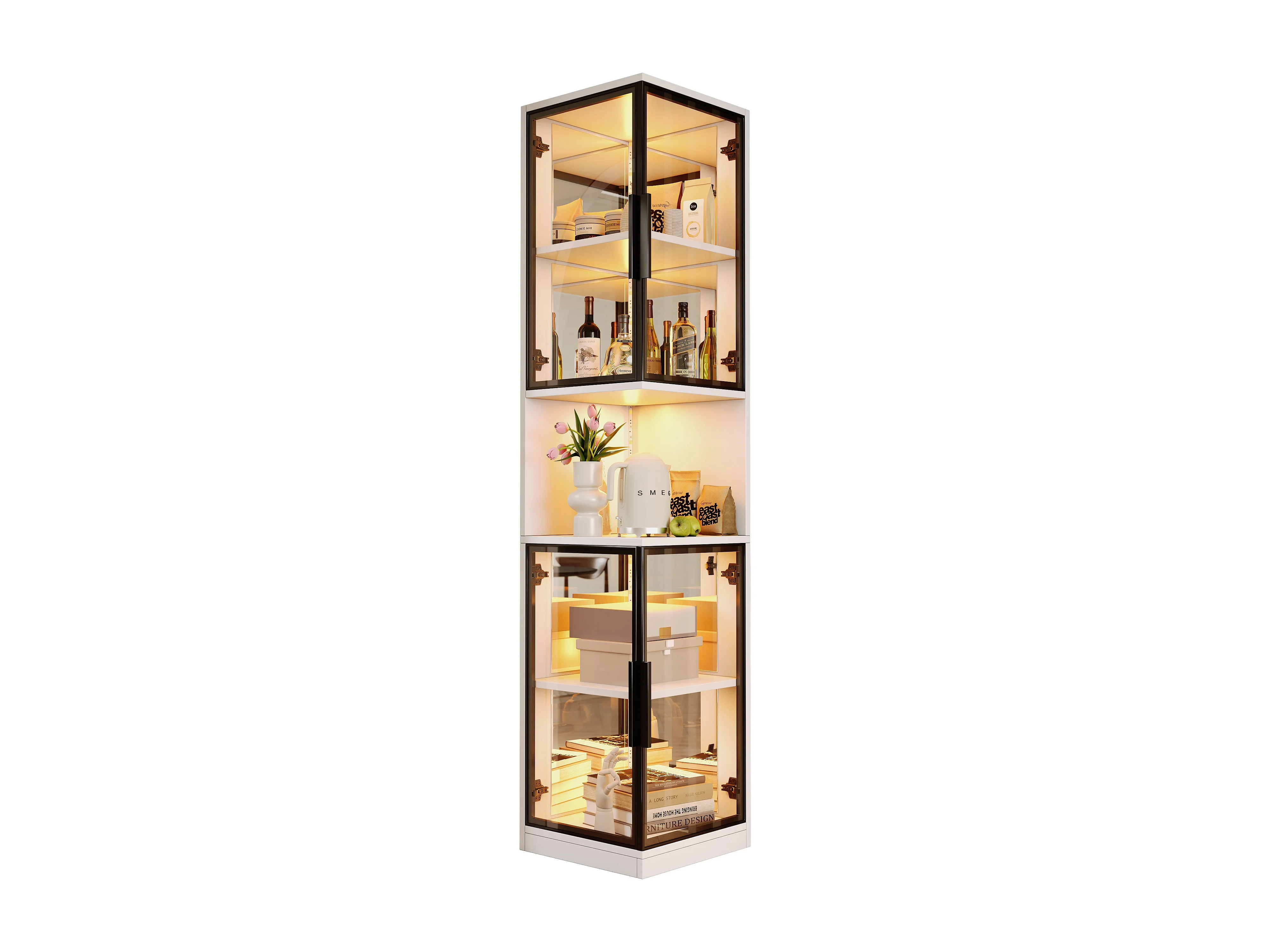 Vitrine 205 cm hoch - LED-Beleuchtung - 4 Glastüren - Spiegelrückwand - Offener Stauraum - Spanplatten - Weiß