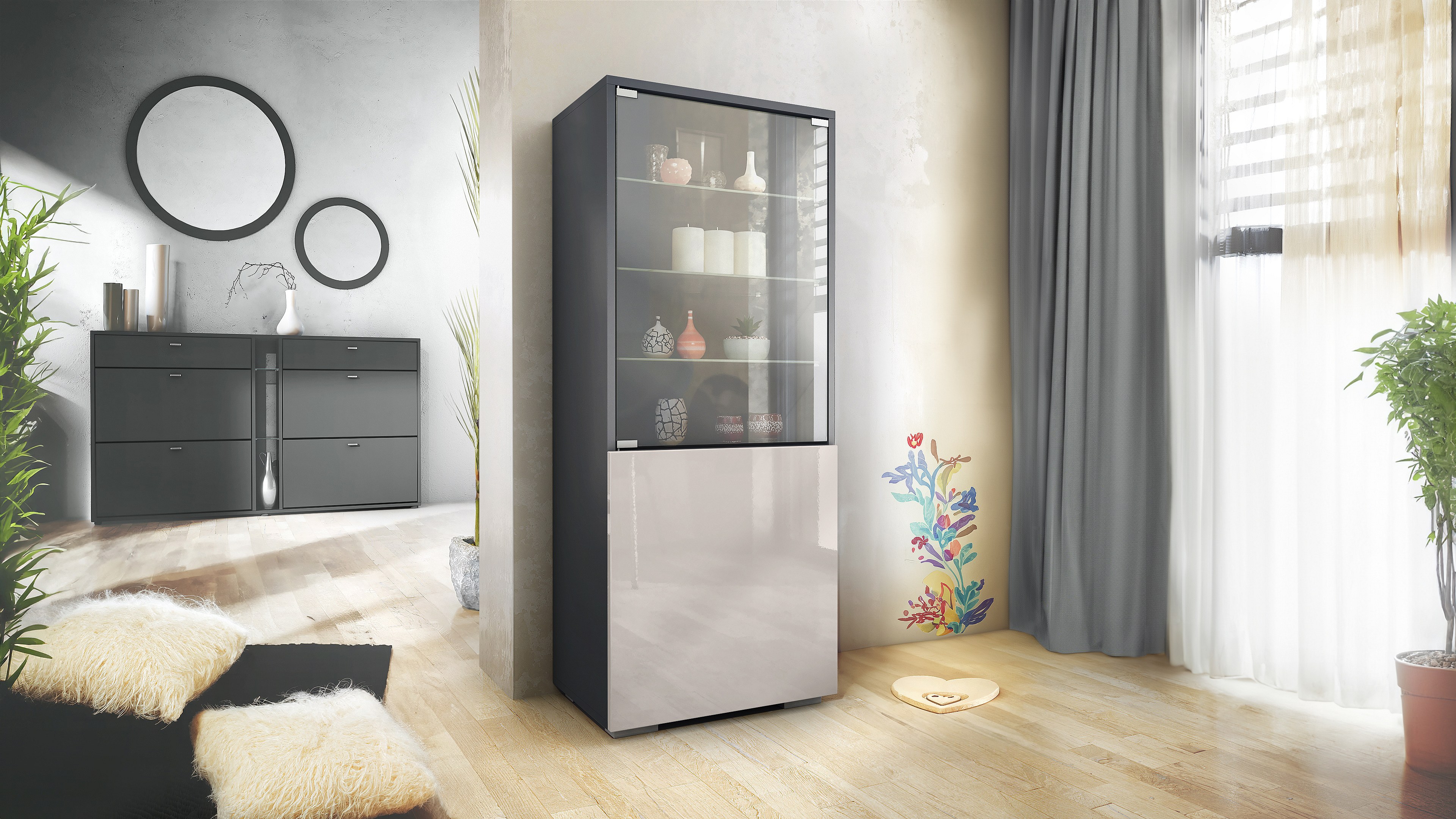 VITRINE Morena Tür und Einsatz in Sandgrau Hochglanz