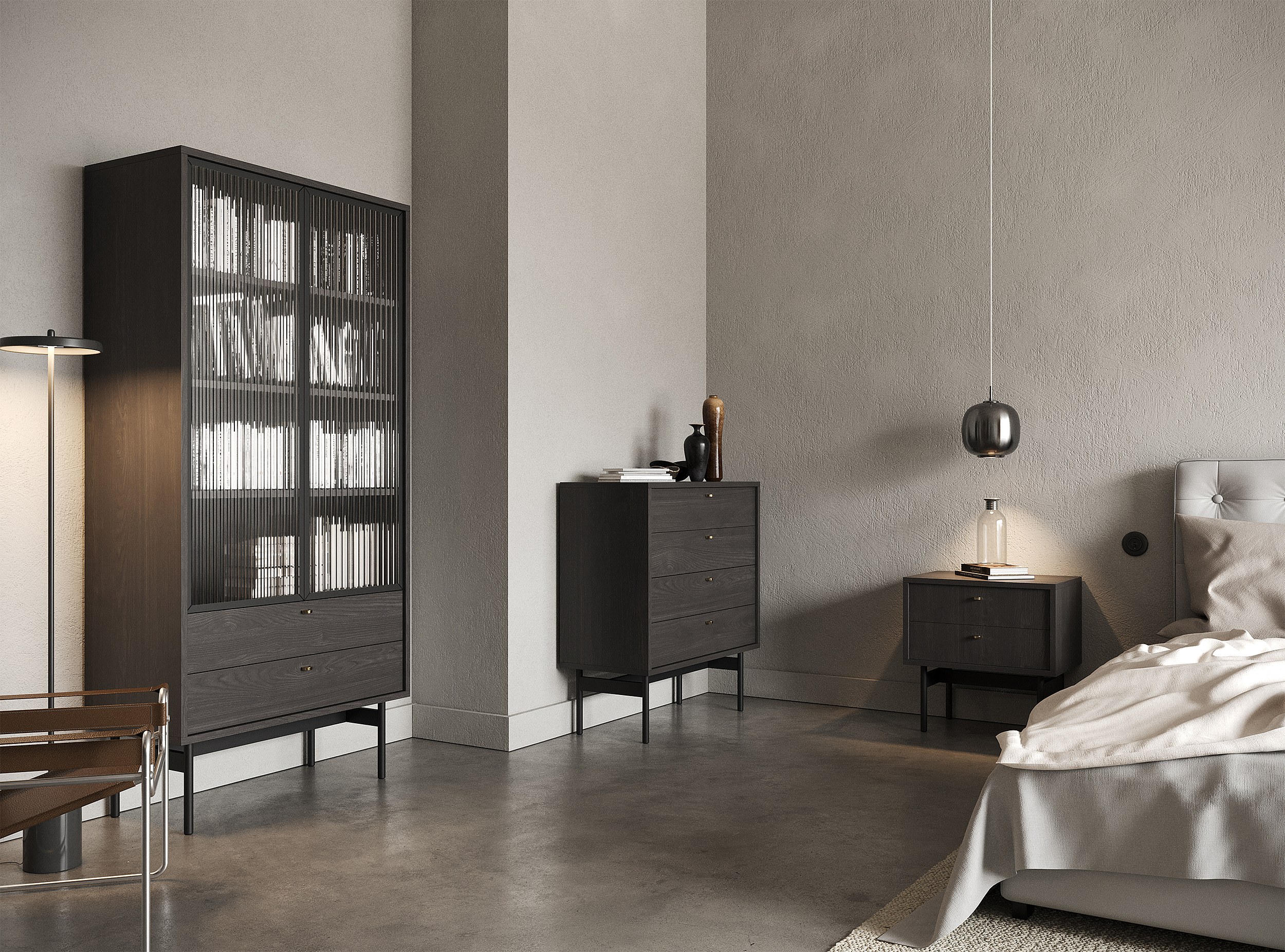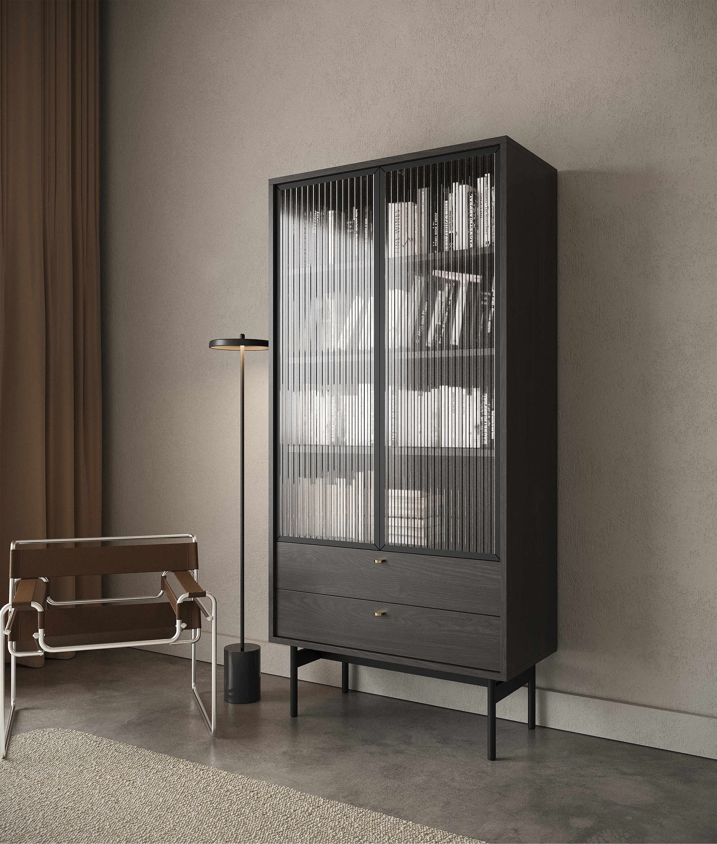 Vitrine 4-türig - geriffelt mit Glastür - schwarz - 112 cm - Zante