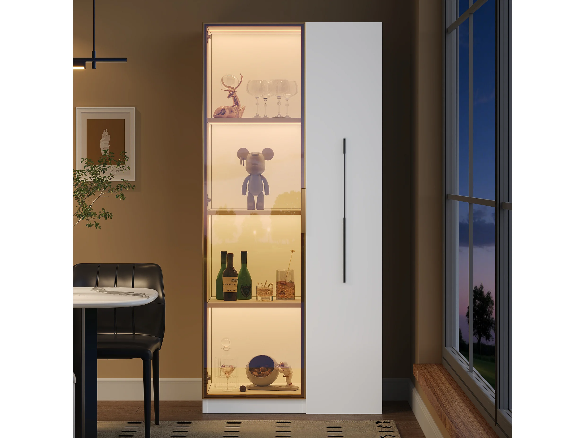 Vitrine mit LED 70x40x160 cm - 1 Glastür und 1 ausziehbarer Seitenschublade - Rollen - MDF + Glas - Weiß